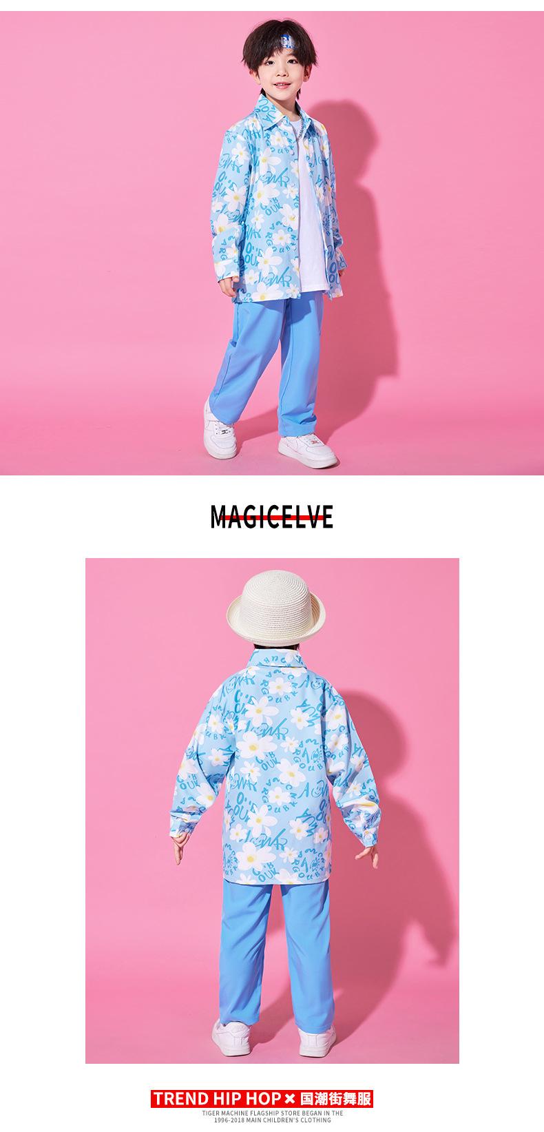 Blue Flower Long Sleeve Shirt, light blue Trousers, Pure White Light Tee, Top Pants, Pants inside coat, Blue D...