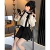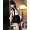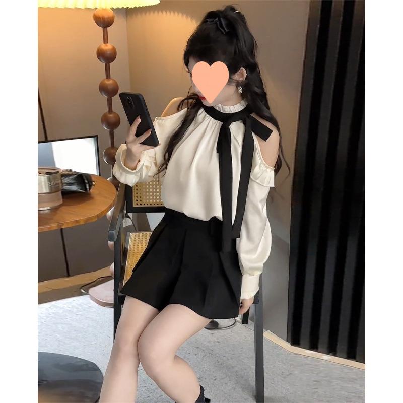 Apricot one-piece top, Single-piece black culottes, Top+pantskirt set