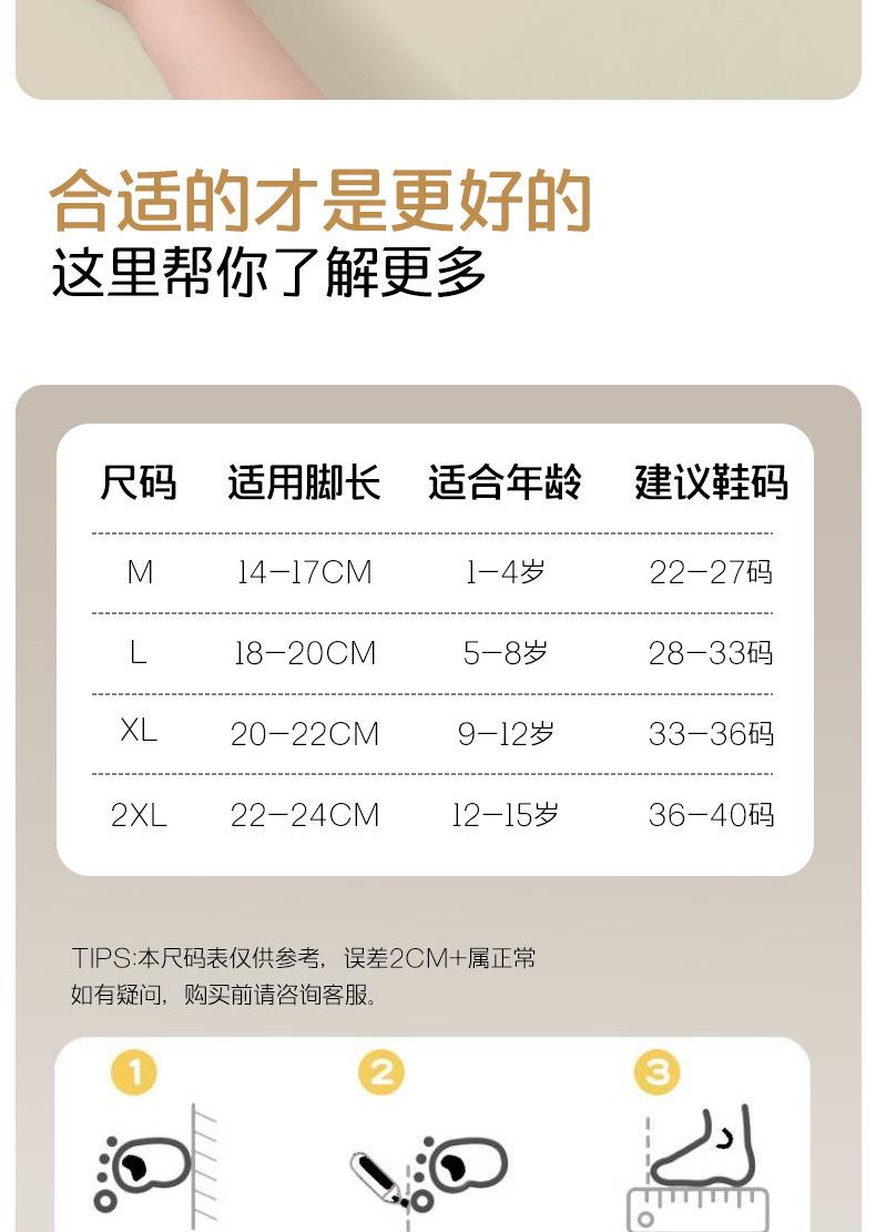M size/1-4 years old/size 22-27, L size/5-8 years/size 28-33, XL size/9-12 years/size 33-36, XXL size/12-15 years old/36-40 size