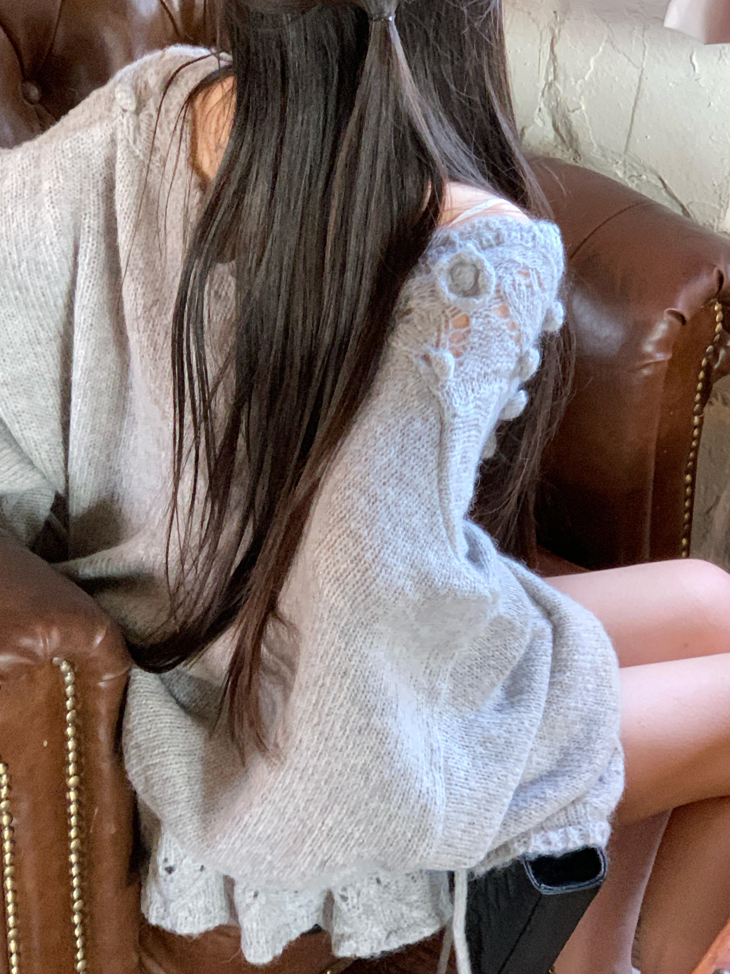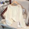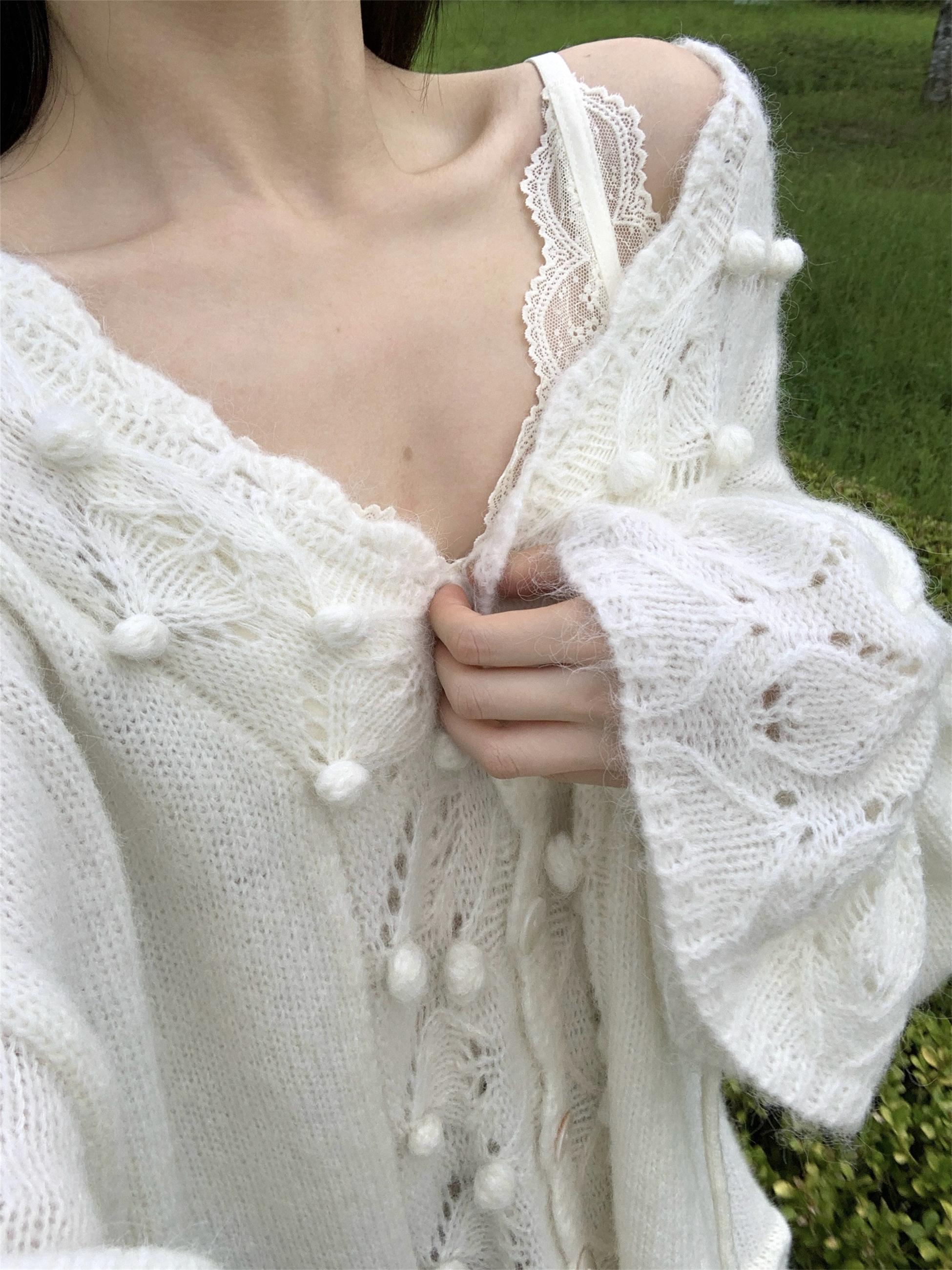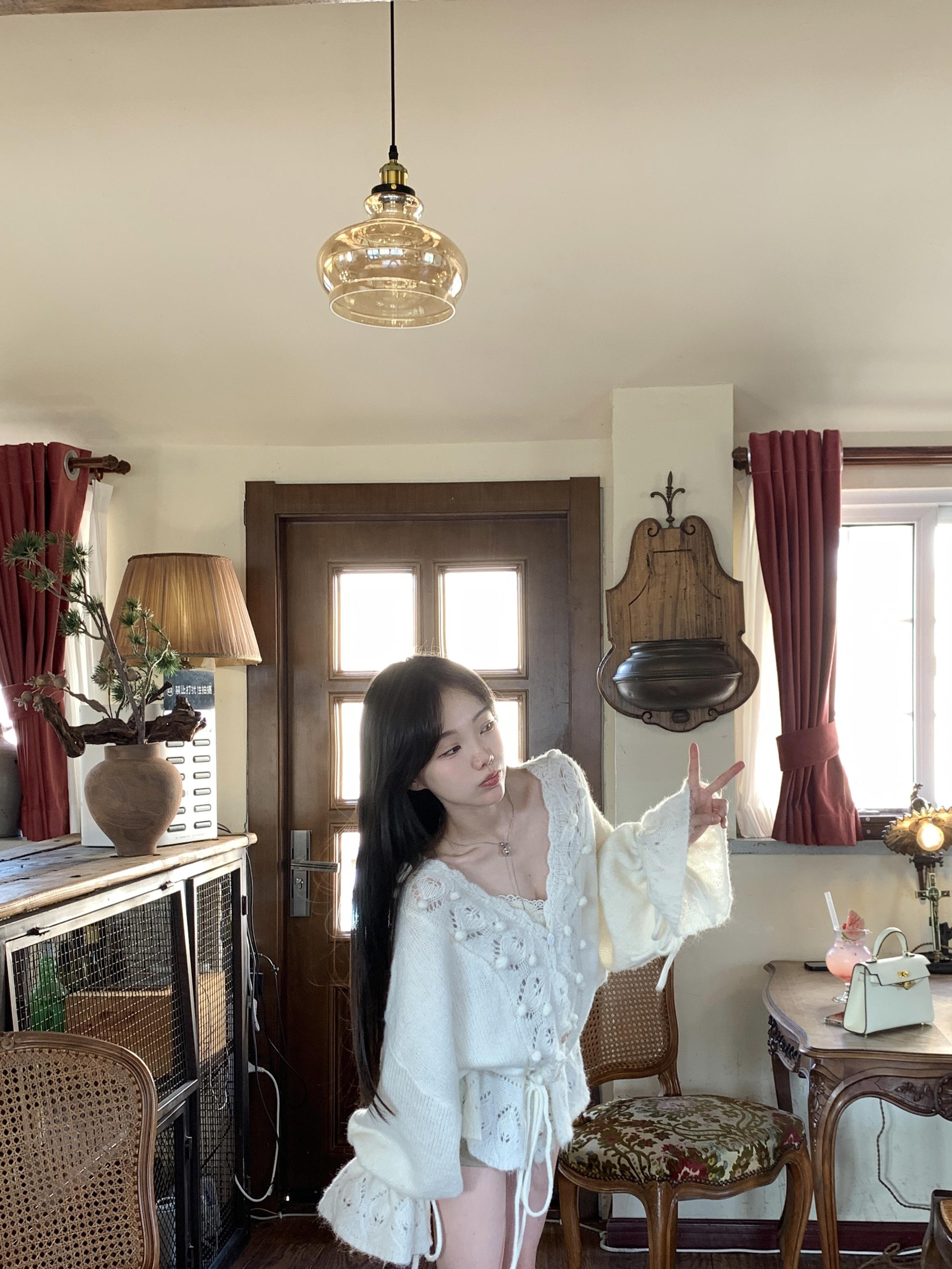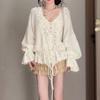 Otoño 2025 Nuevo Suéter de Punto para Mujer de Crochet Calado Francés Cuello en V Holgado con Cordón Top Perezoso