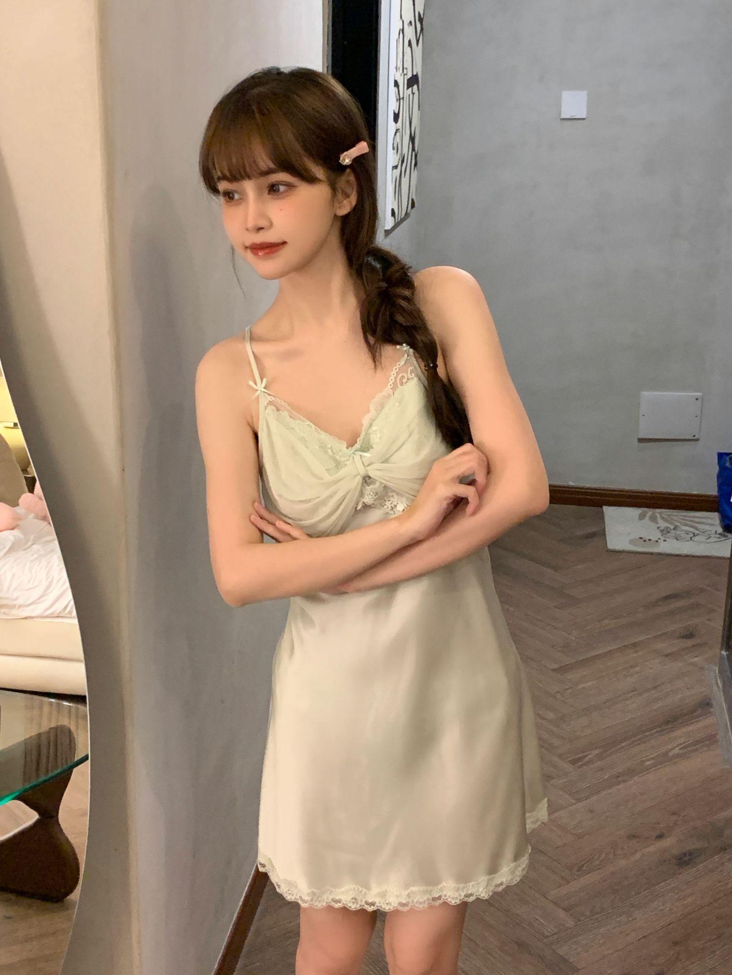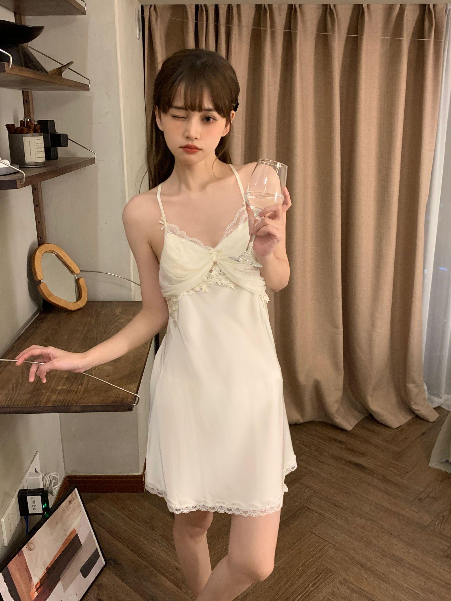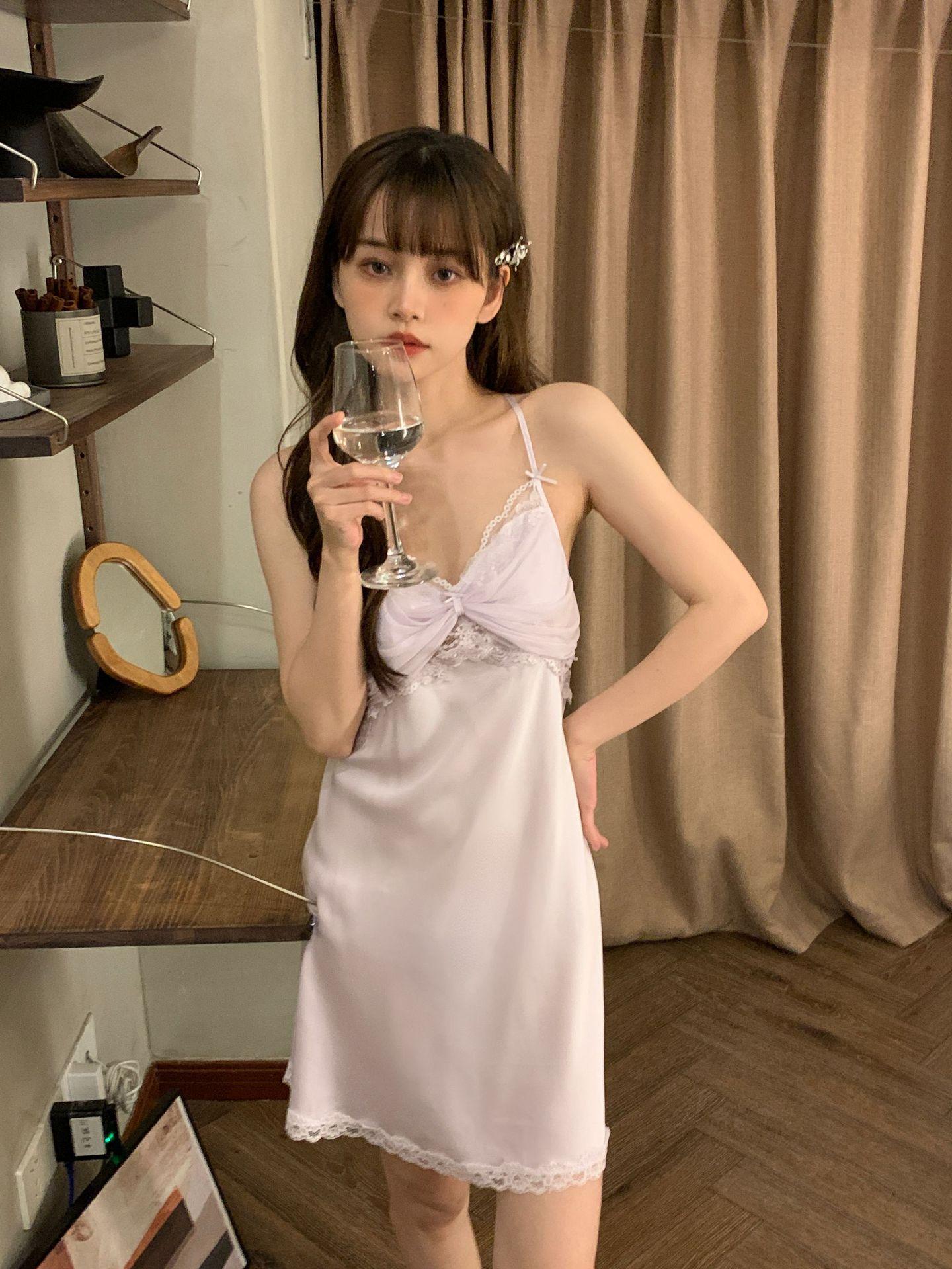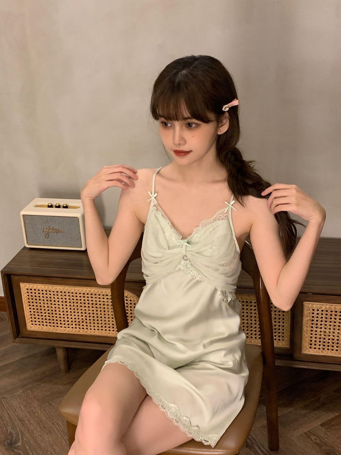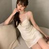 Camisón para Mujer, Nuevo Primavera Sexy Encaje de Seda de Hielo con Almohadilla en el Pecho, Camisón de Verano de Malla con Espalda Descubierta de Belleza de Deseo Puro