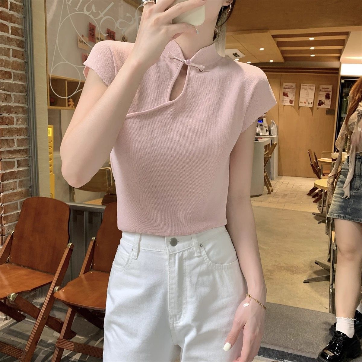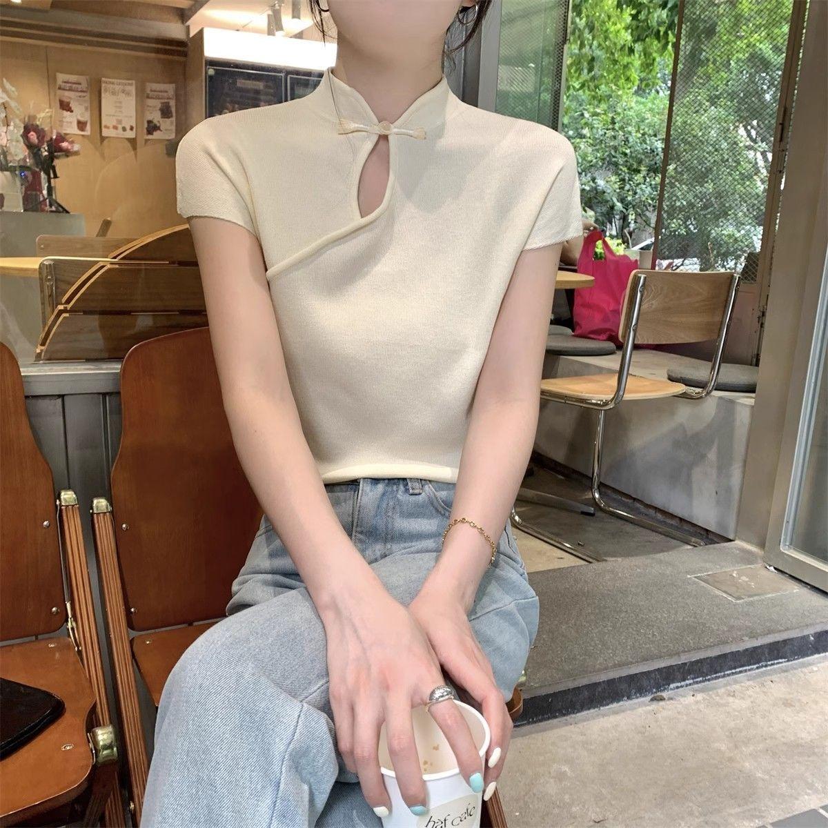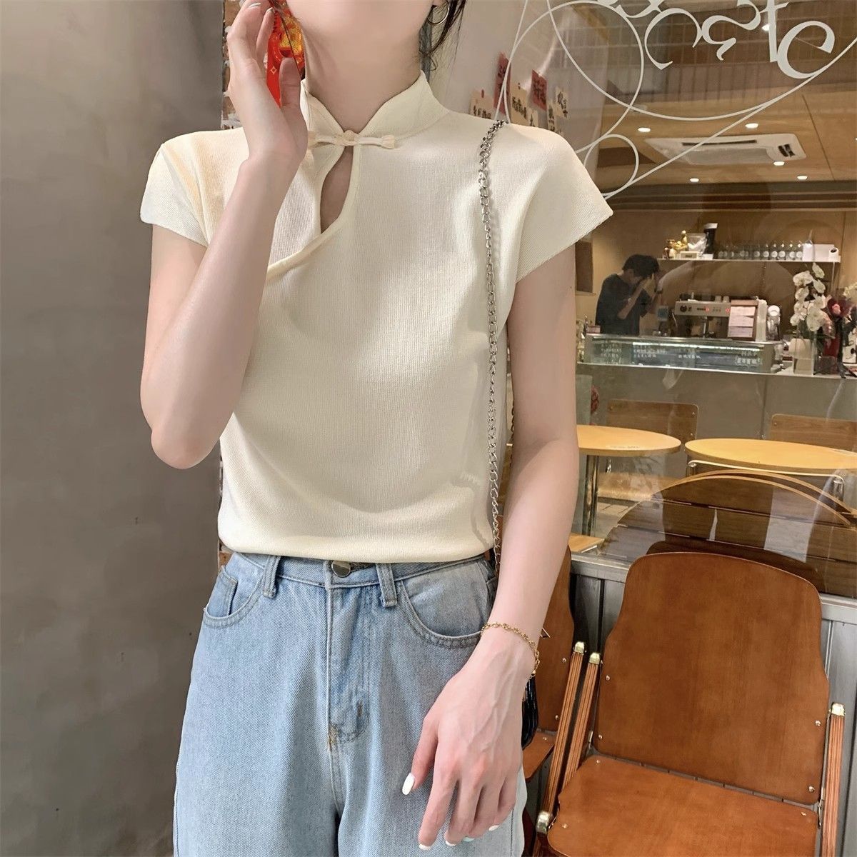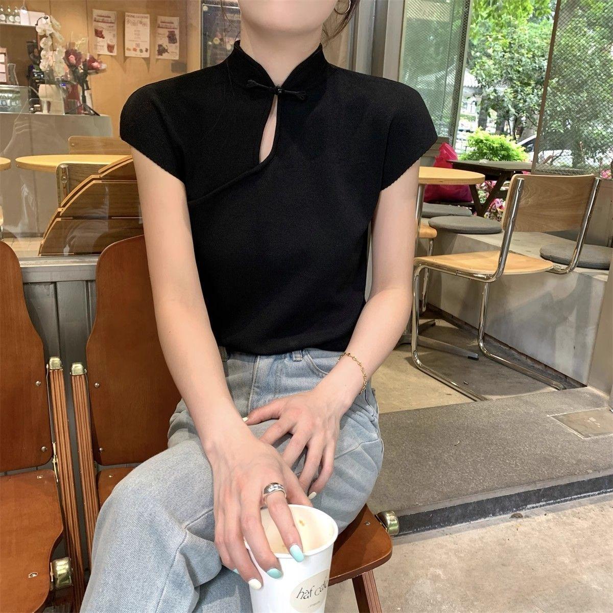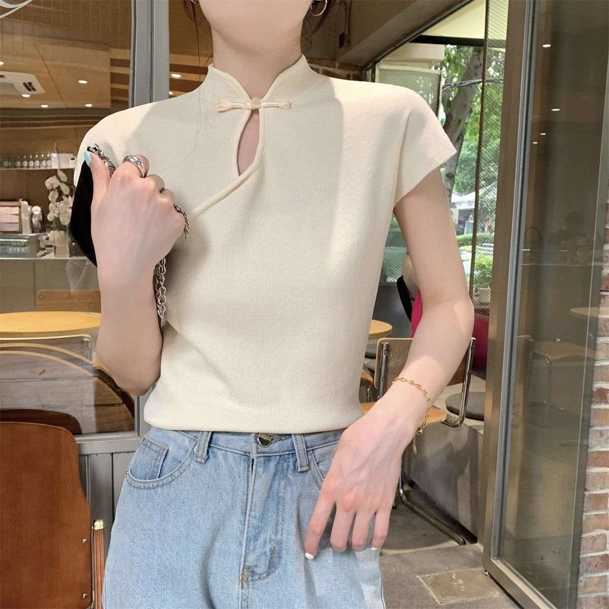 2025 Nuevo Estilo Chino Estilo Nacional Hebilla Hueco Cuello Vertical Manga Volada Sentido del Diseño Camisa de Punto Verano Top Básico para Mujer