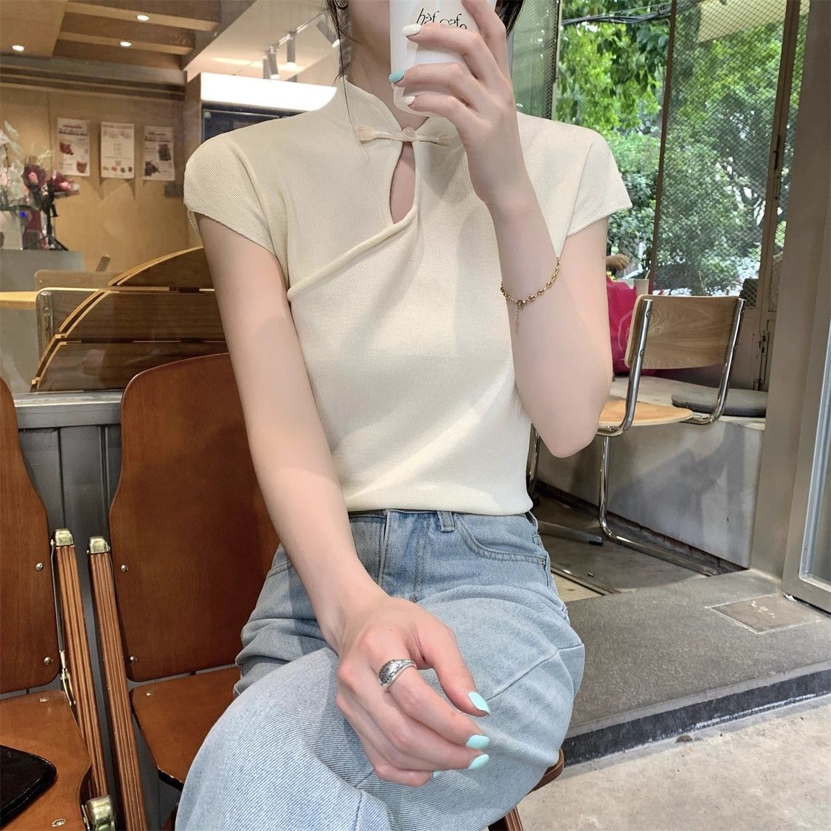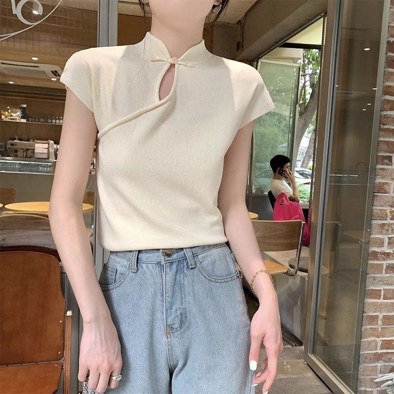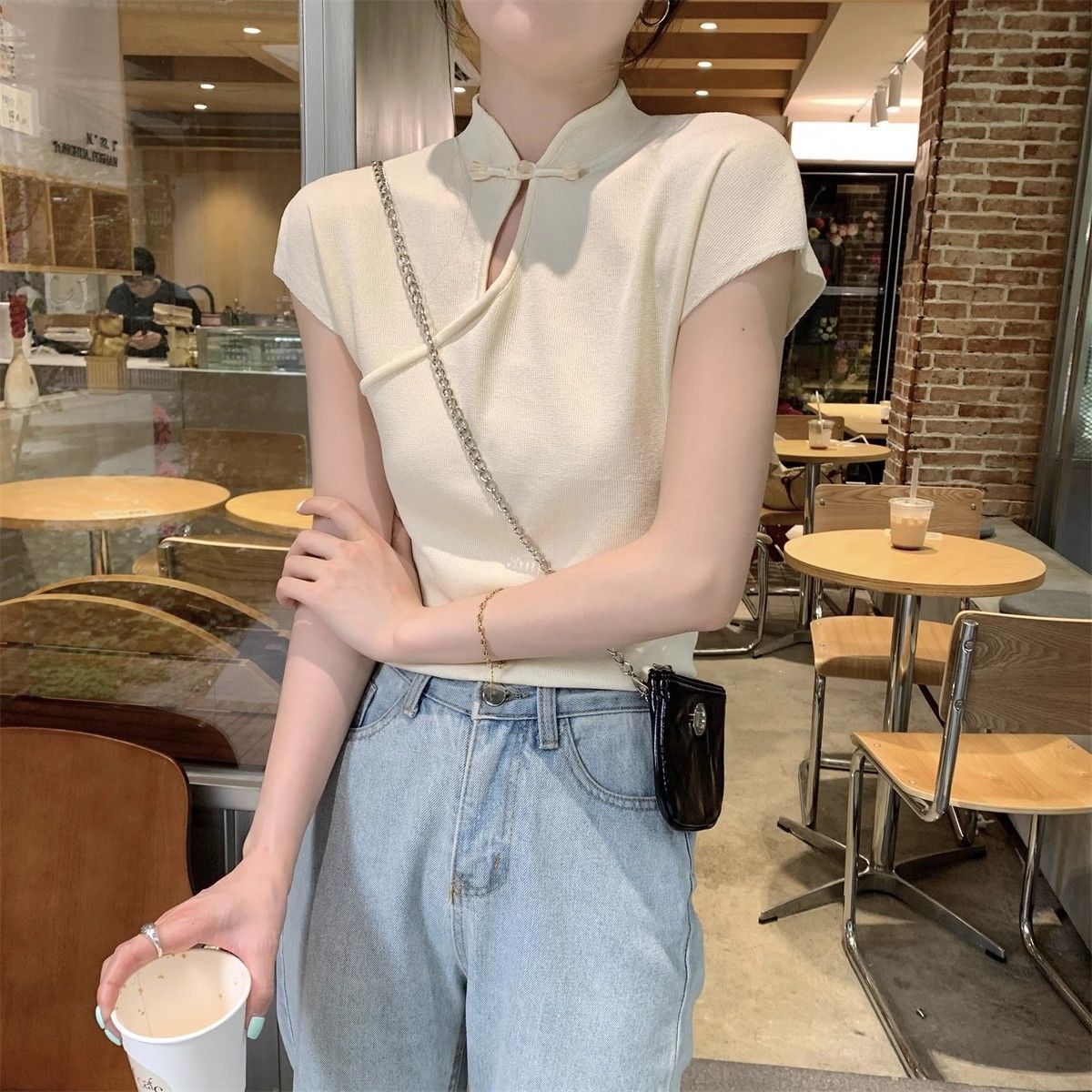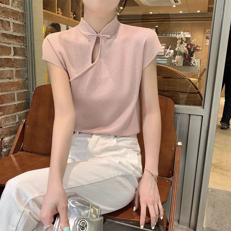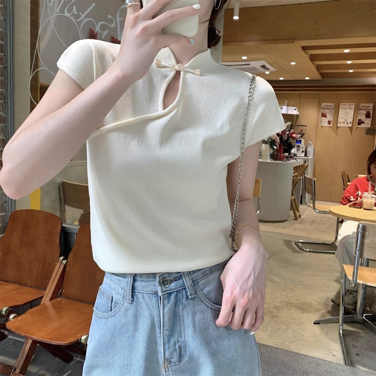 2025 Nuevo Estilo Chino Estilo Nacional Hebilla Hueco Cuello Vertical Manga Volada Sentido del Diseño Camisa de Punto Verano Top Básico para Mujer