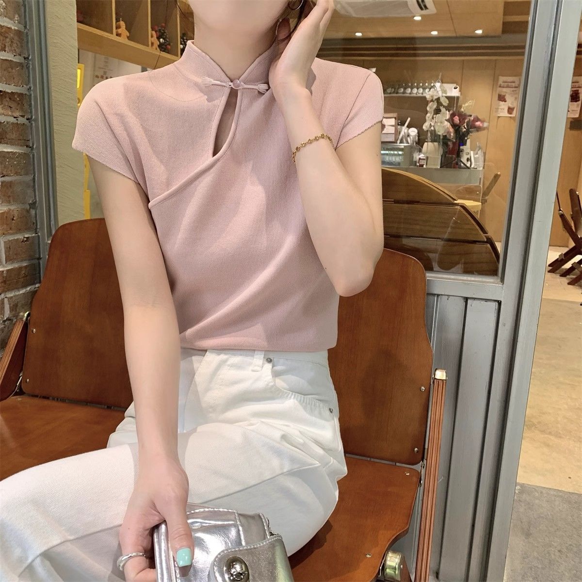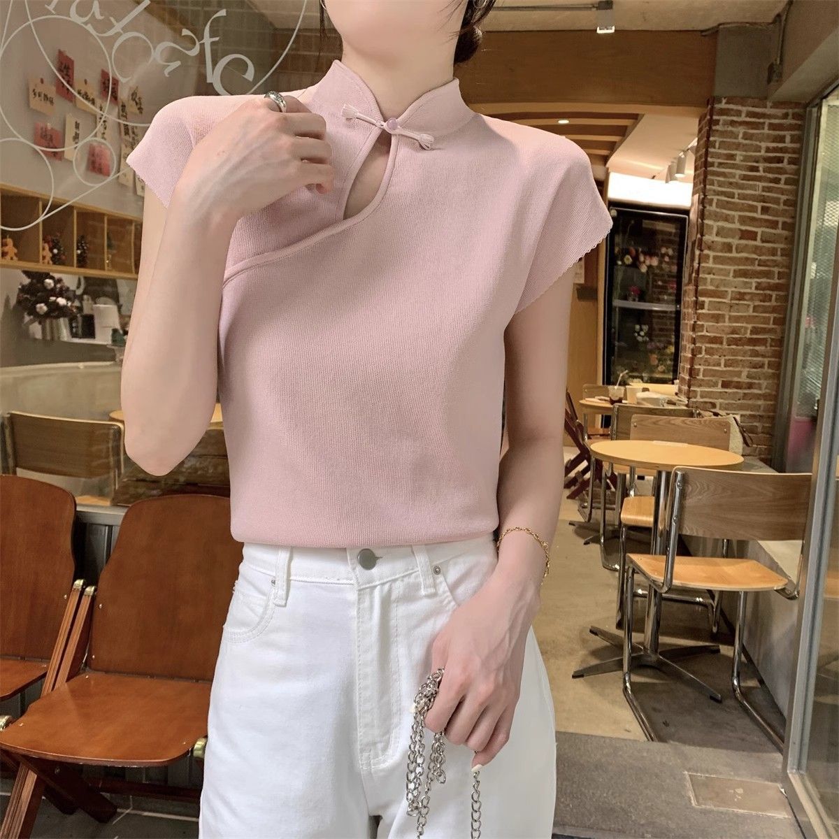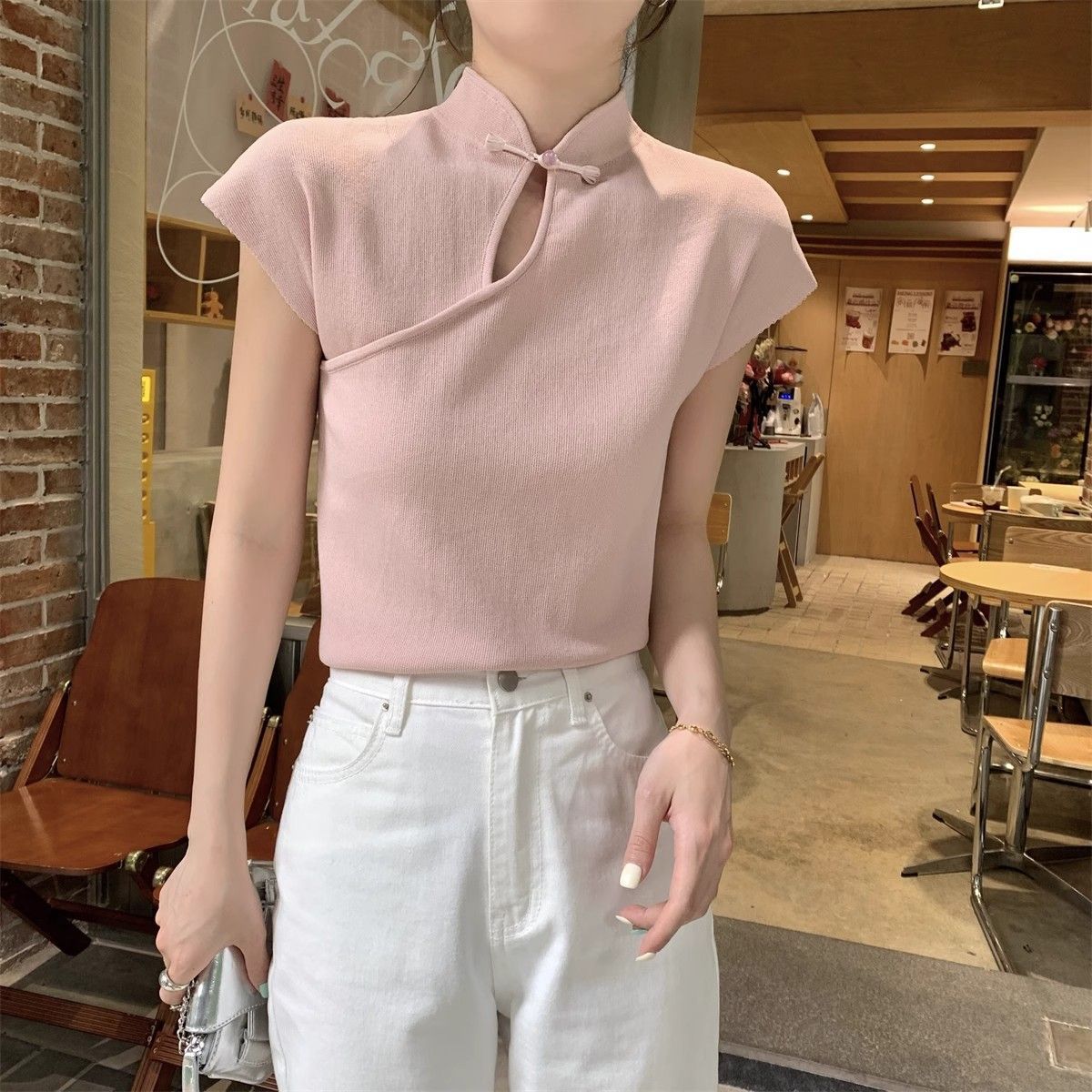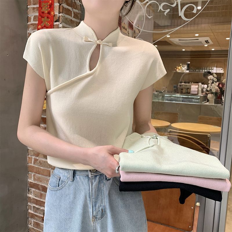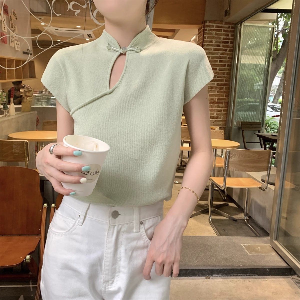 2025 Nuevo Estilo Chino Estilo Nacional Hebilla Hueco Cuello Vertical Manga Volada Sentido del Diseño Camisa de Punto Verano Top Básico para Mujer
