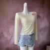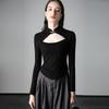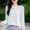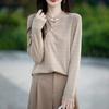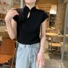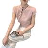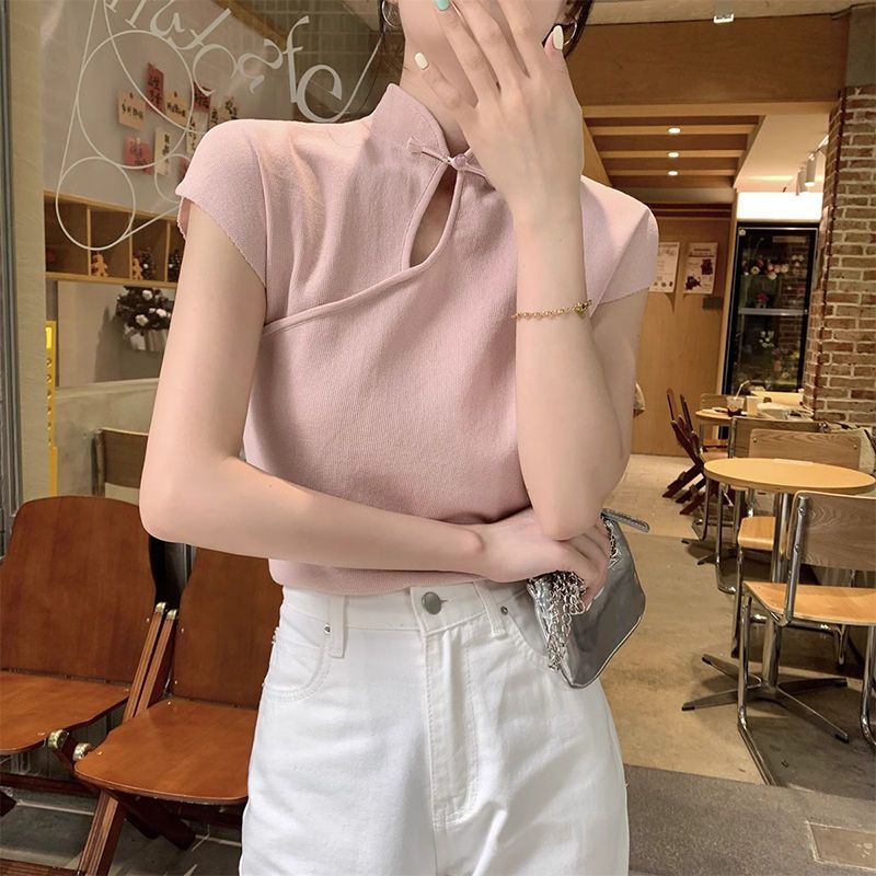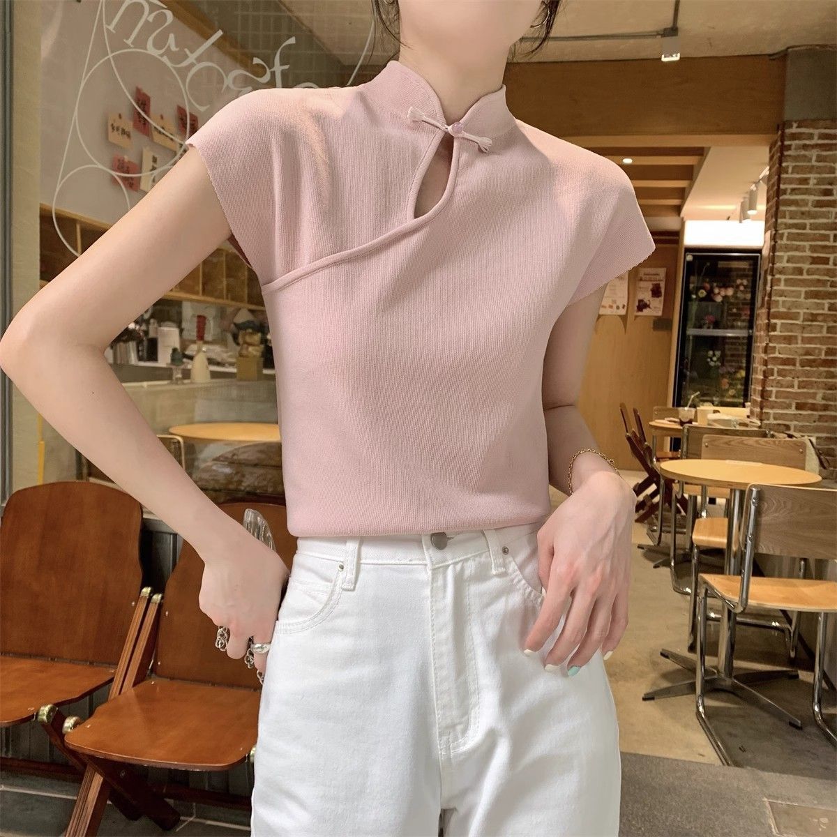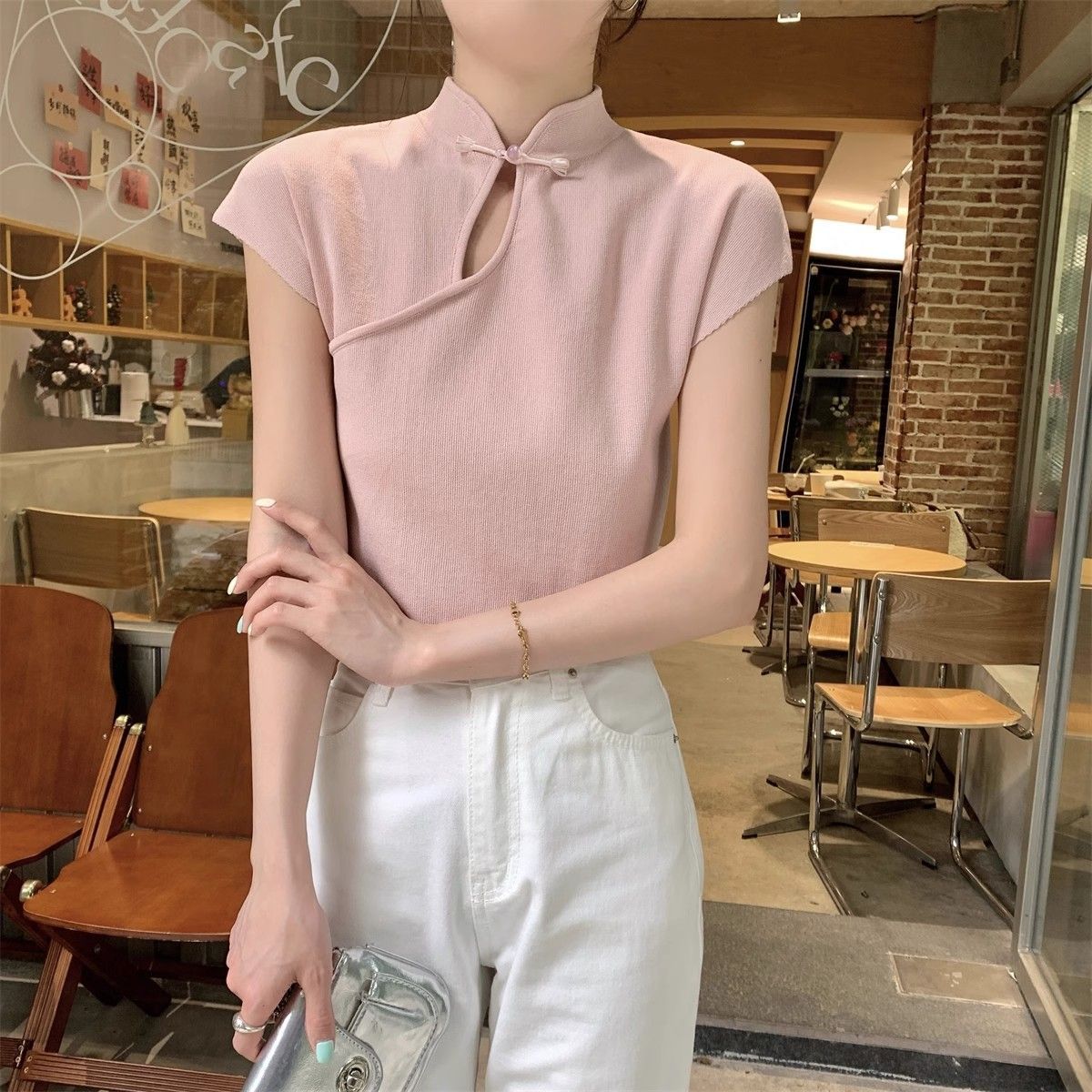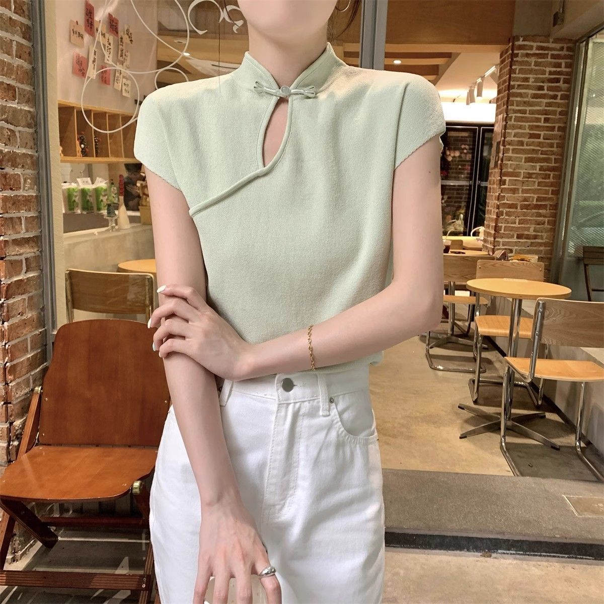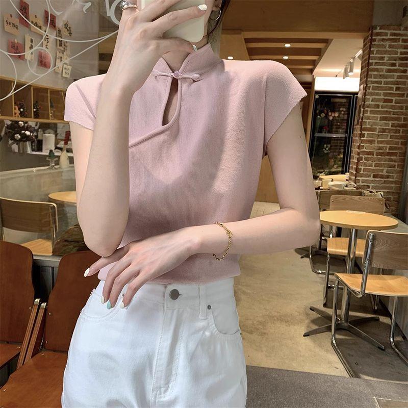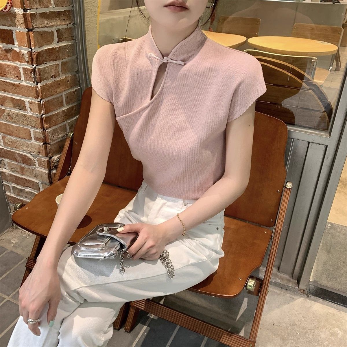 2025 Nuevo Estilo Chino Estilo Nacional Hebilla Hueco Cuello Vertical Manga Volada Sentido del Diseño Camisa de Punto Verano Top Básico para Mujer