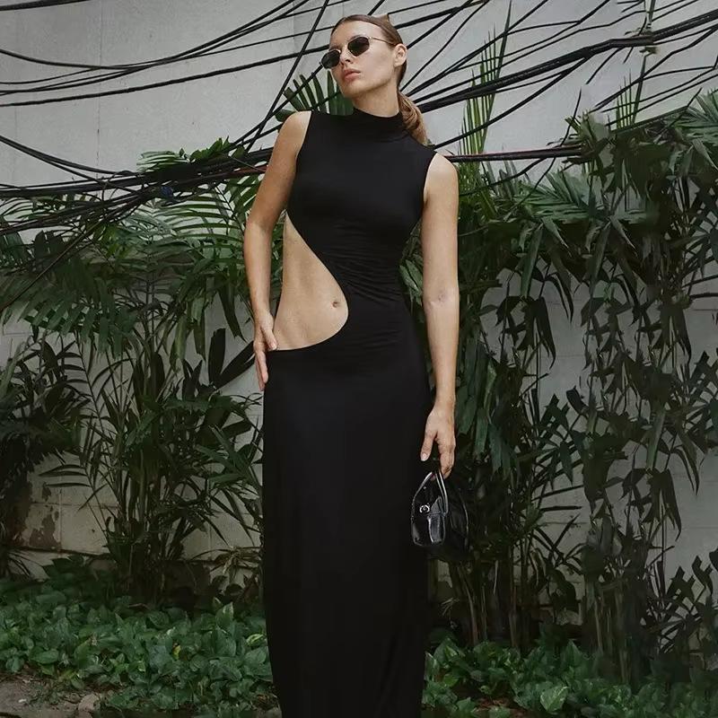 Amazon 2025 Verano Nuevo Vestido Largo de Moda Color Sólido Calado Sexy Adelgazante Elegante Vestido de Temperamento
