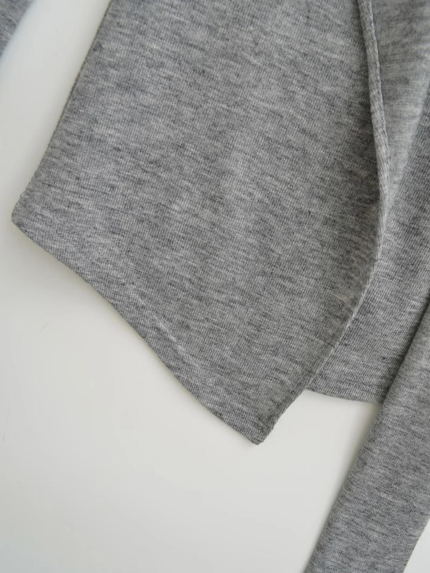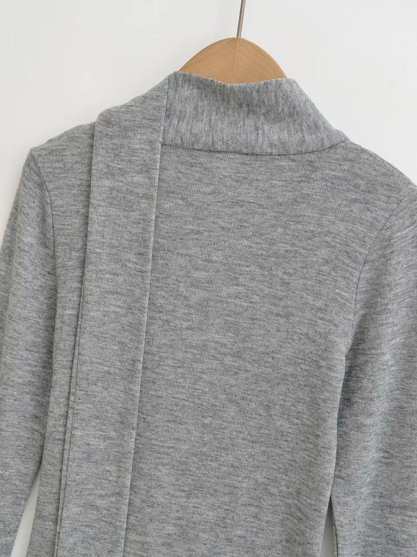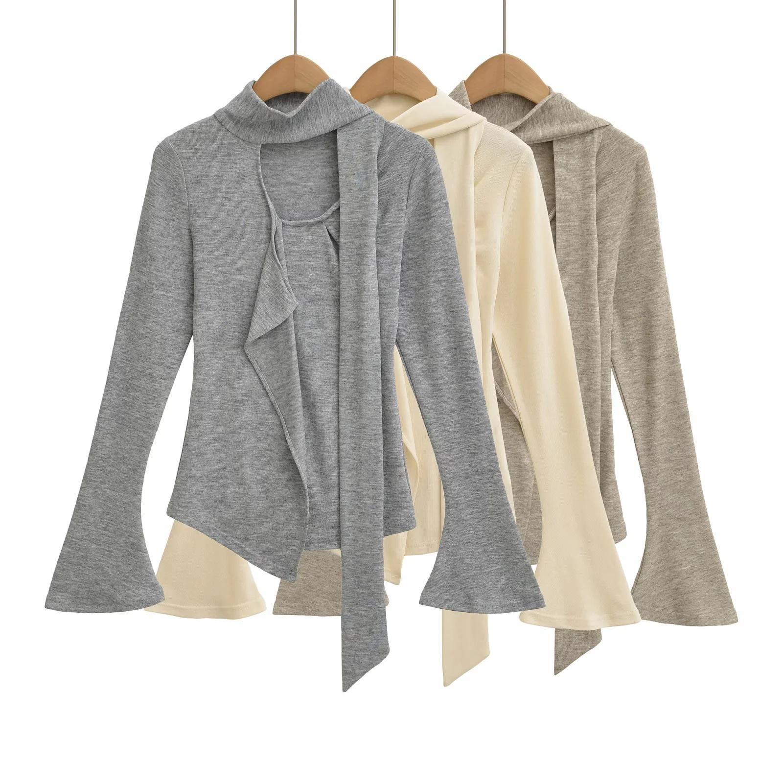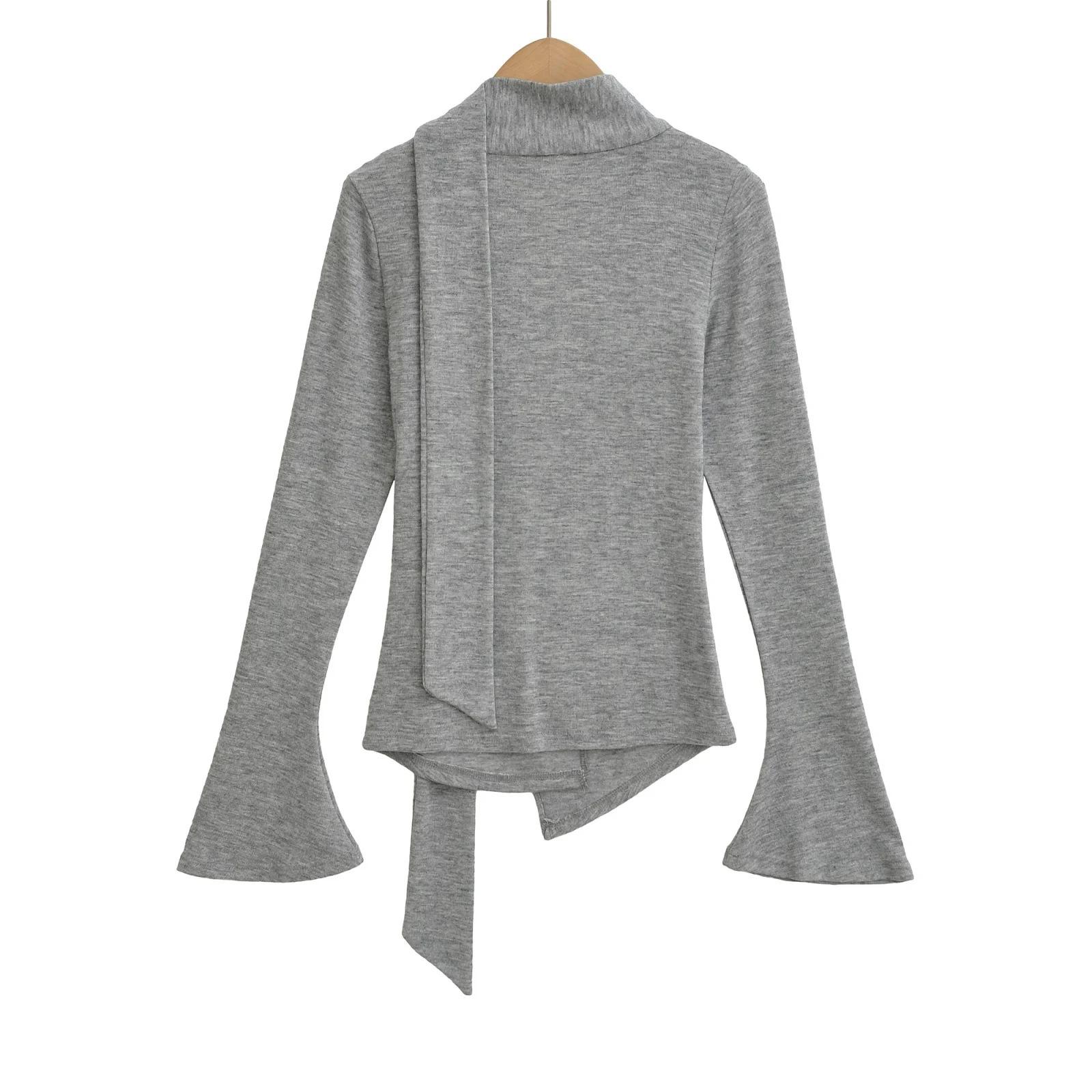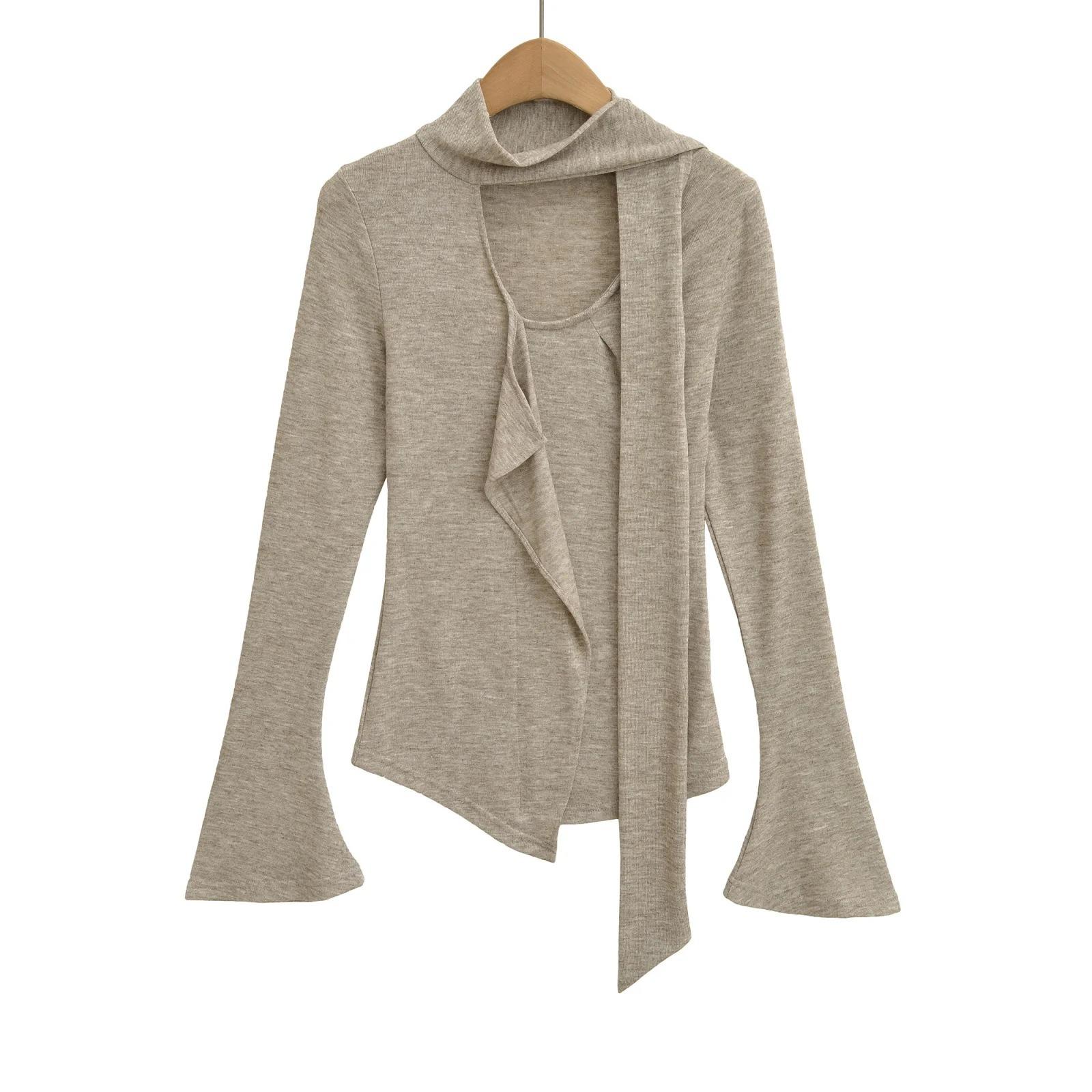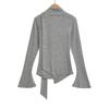 Sentido del Diseño Volante Cinta Manga Larga Top Gris para Mujer Primavera y Otoño Capa Base Versátil Camiseta Interior Adelgazante