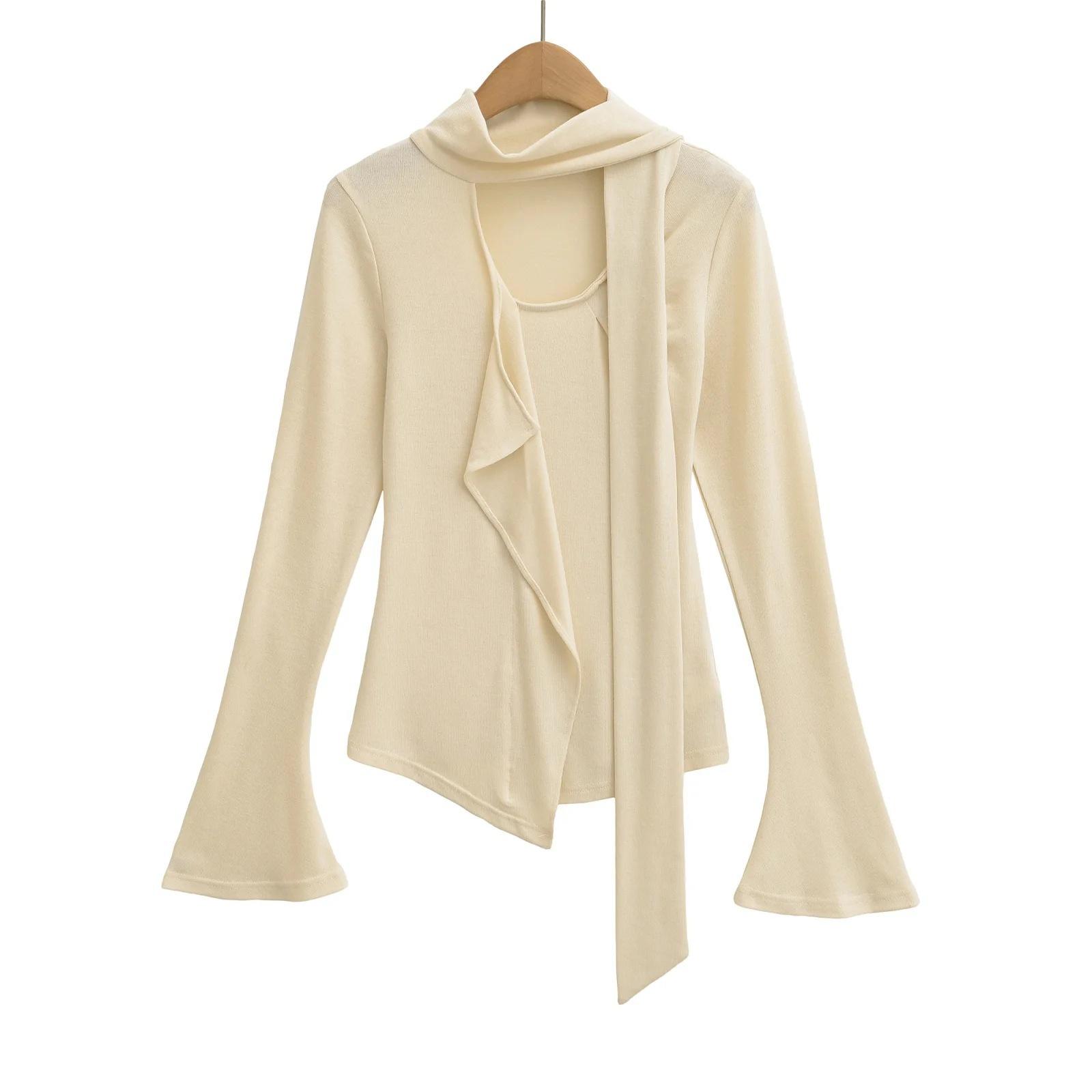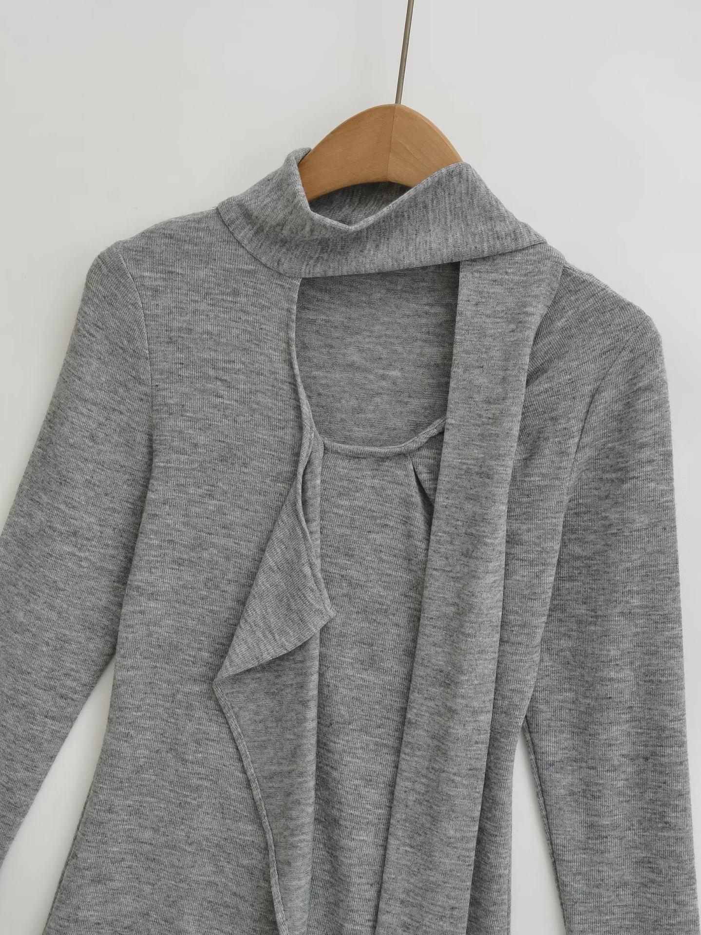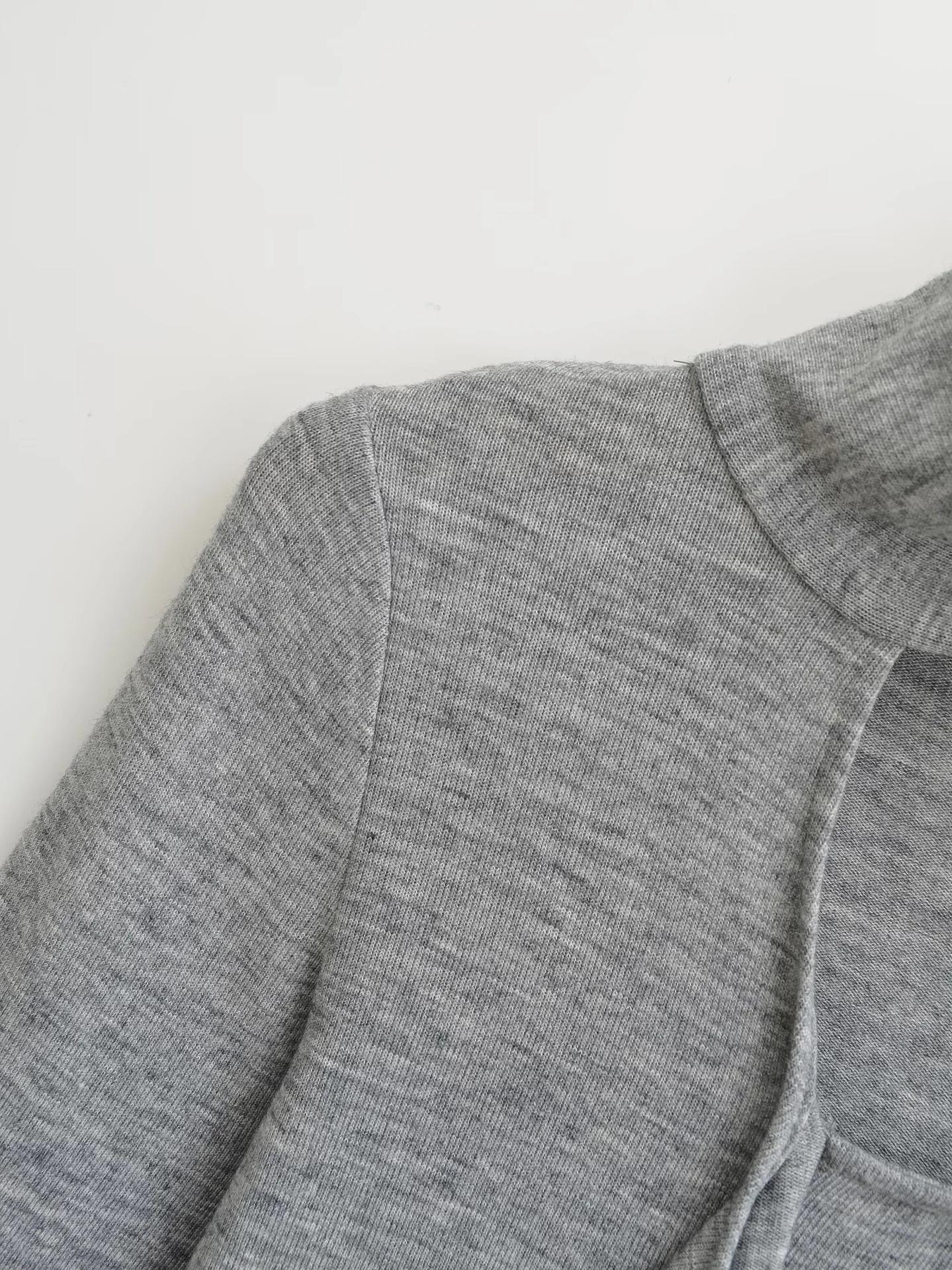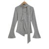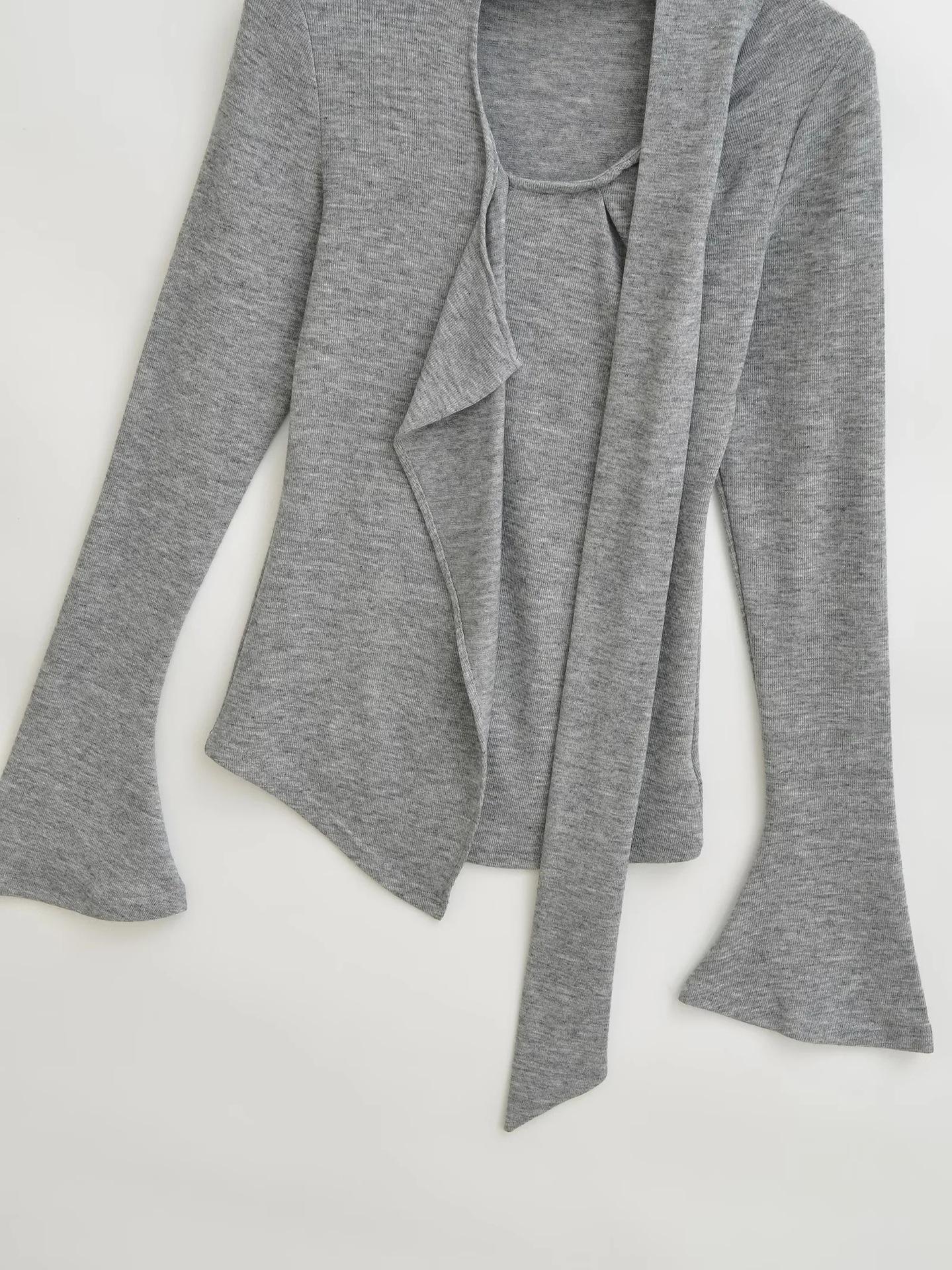 Sentido del Diseño Volante Cinta Manga Larga Top Gris para Mujer Primavera y Otoño Capa Base Versátil Camiseta Interior Adelgazante
