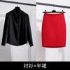Big red long-sleeved suit + black long-sleeved shirt + midi skirt