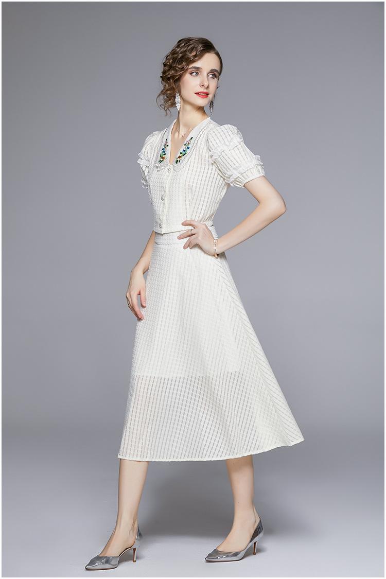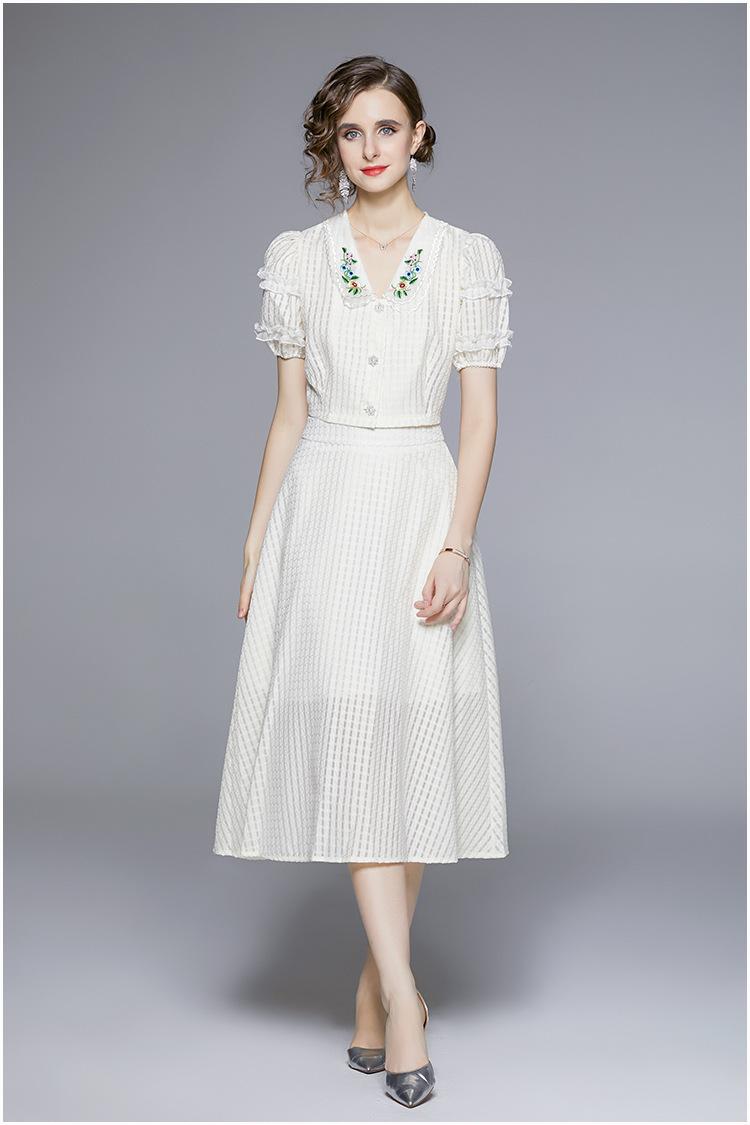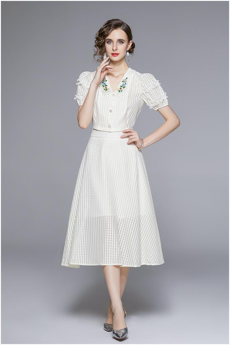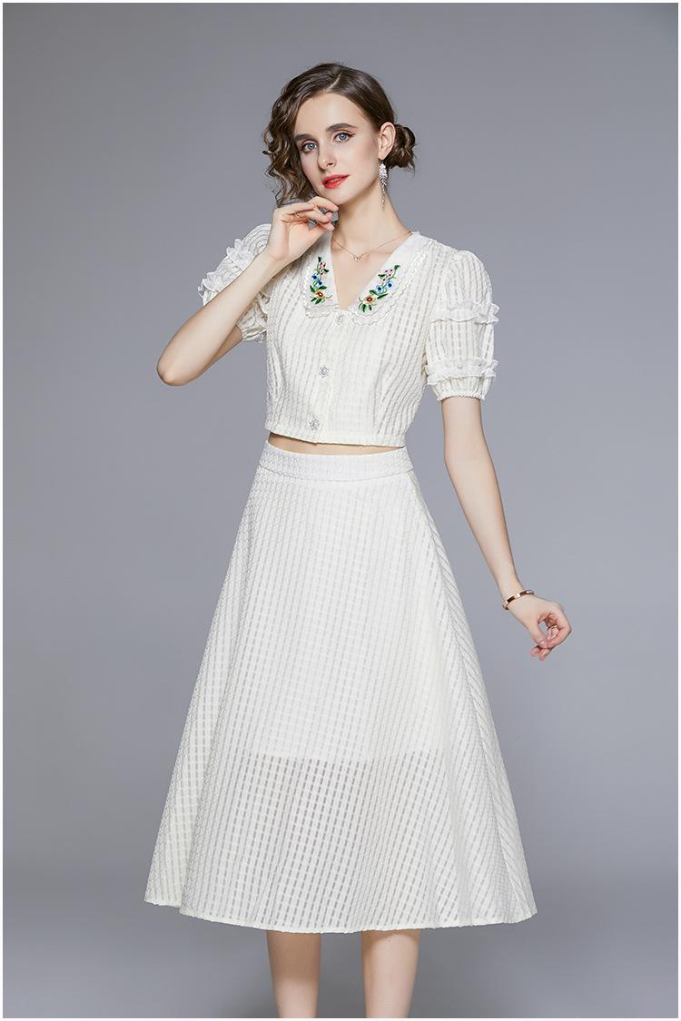 Foto real-traje estilo fragancia pequeña camisa con cuello de muñeca bordado falda de cintura alta temperamento de socialité set waffle de dos piezas