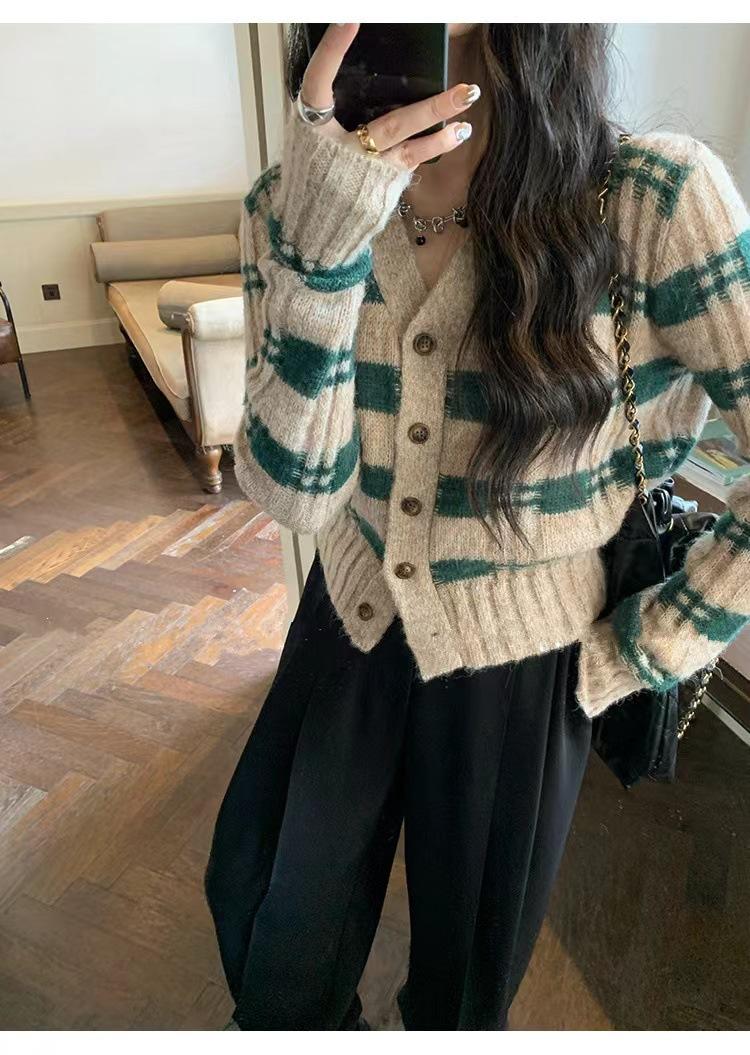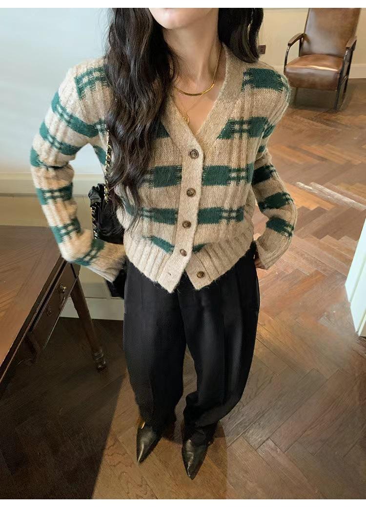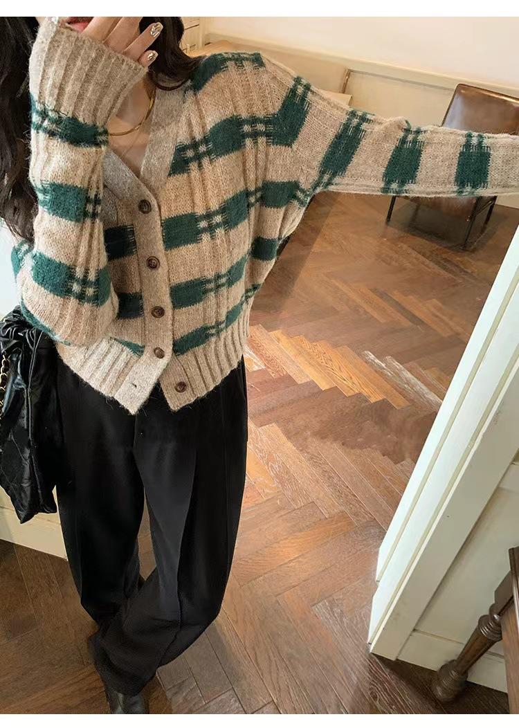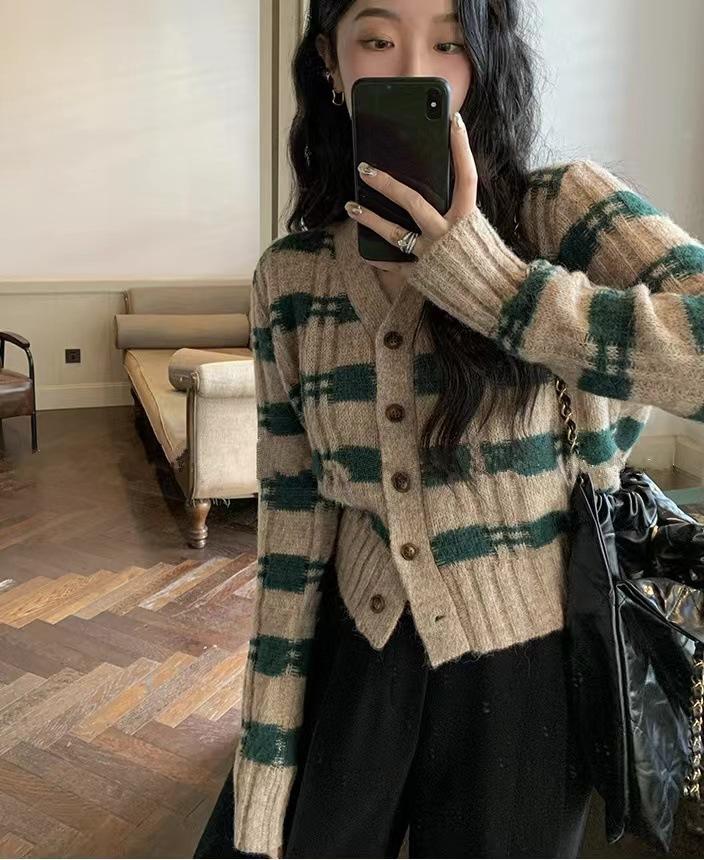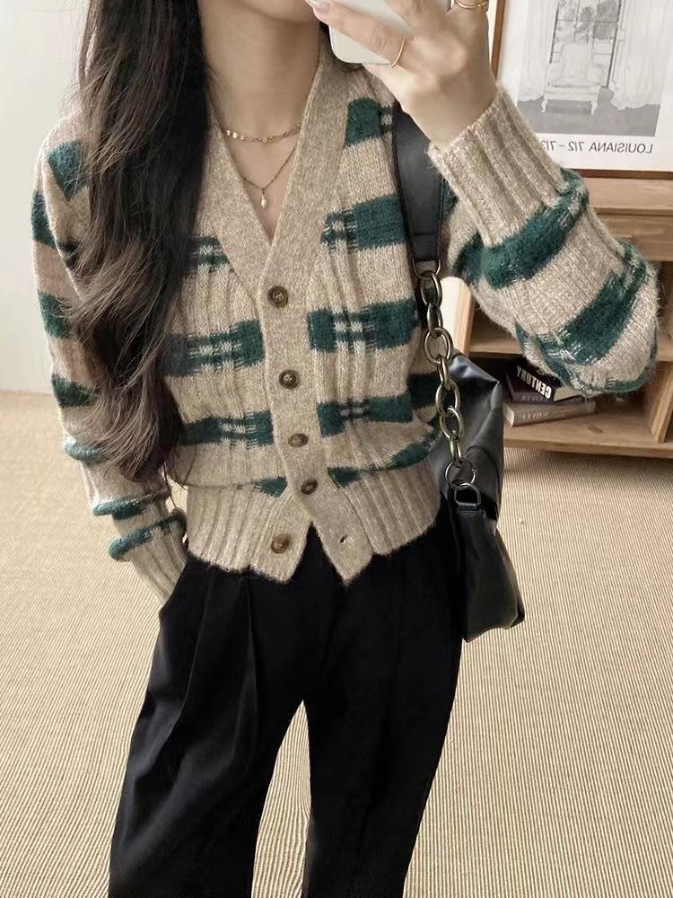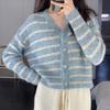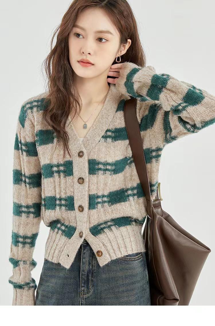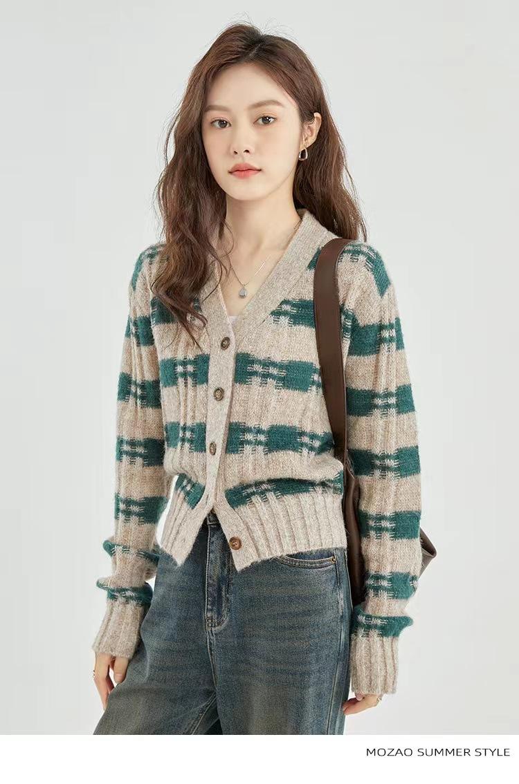 Nuevo Cárdigan Suéter Abrigo de Punto de Diseño Corto para Mujer con Cuello en V y Combinación de Colores a Rayas Top de Mohair