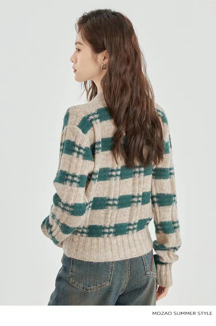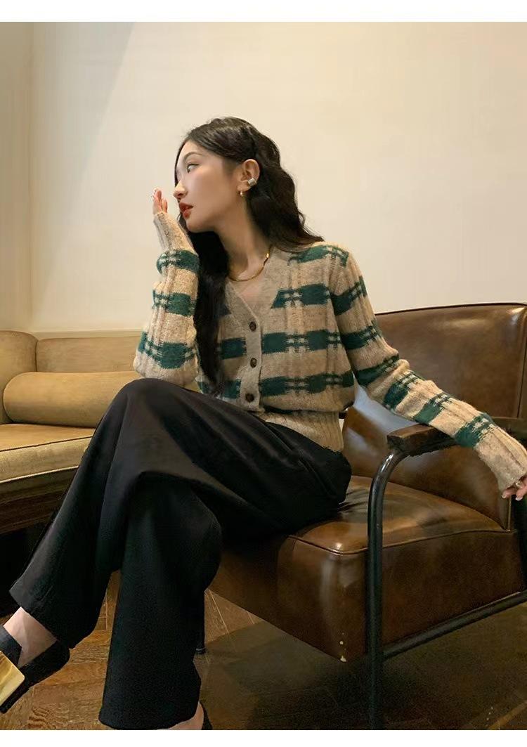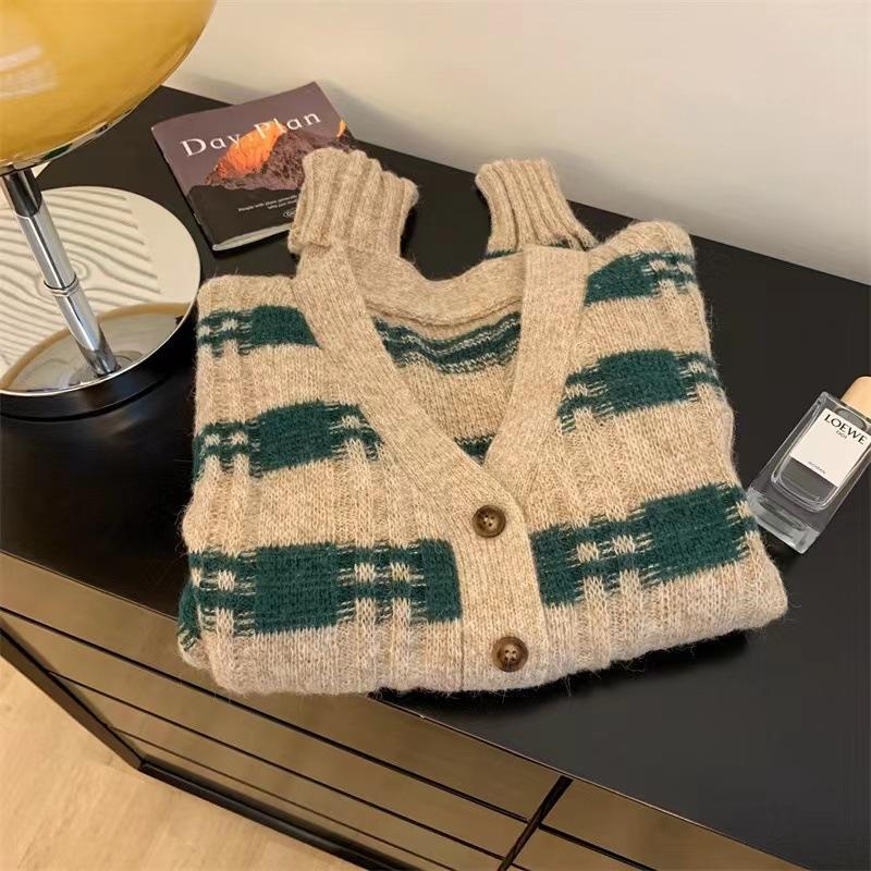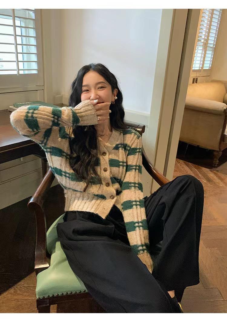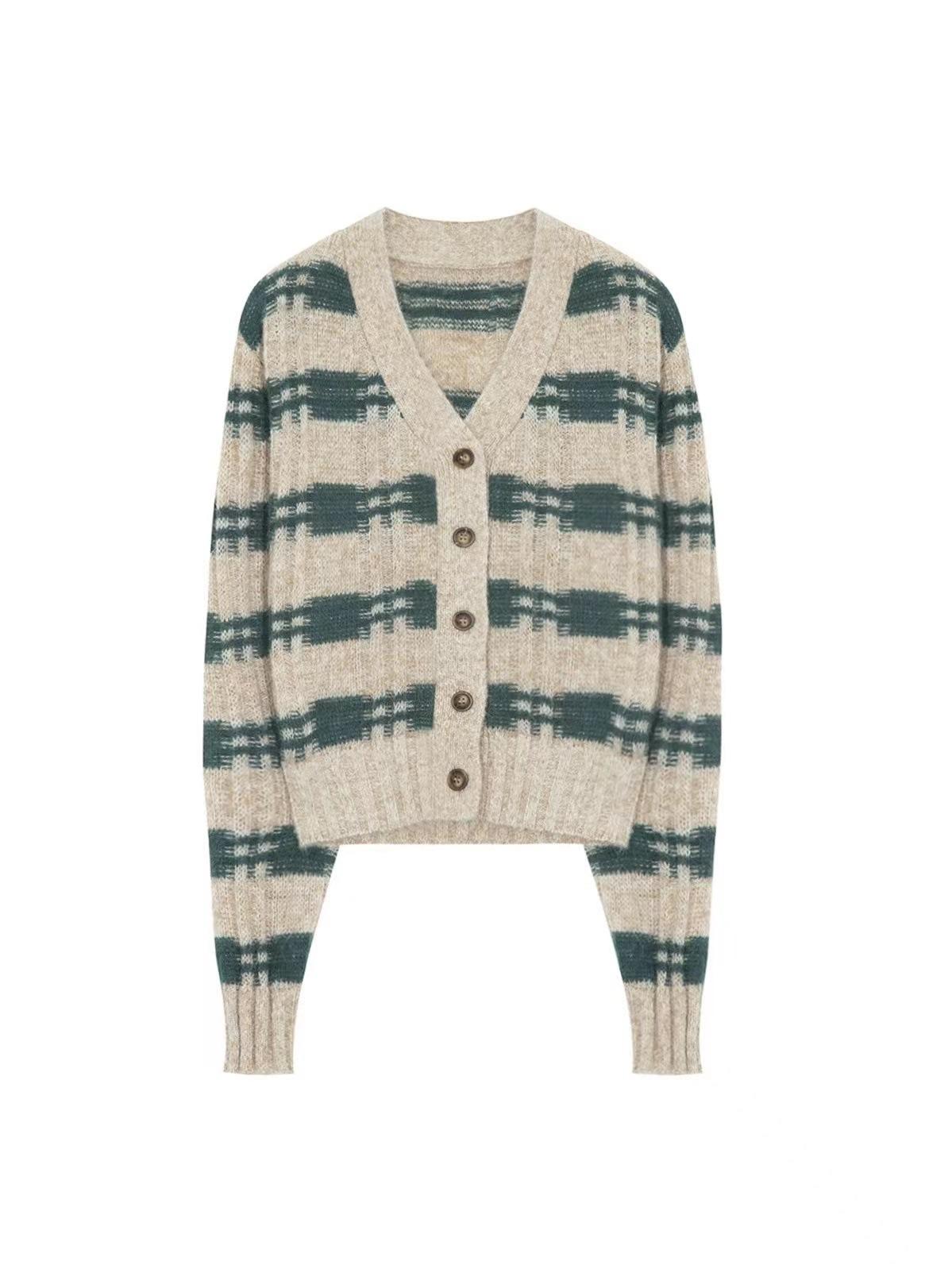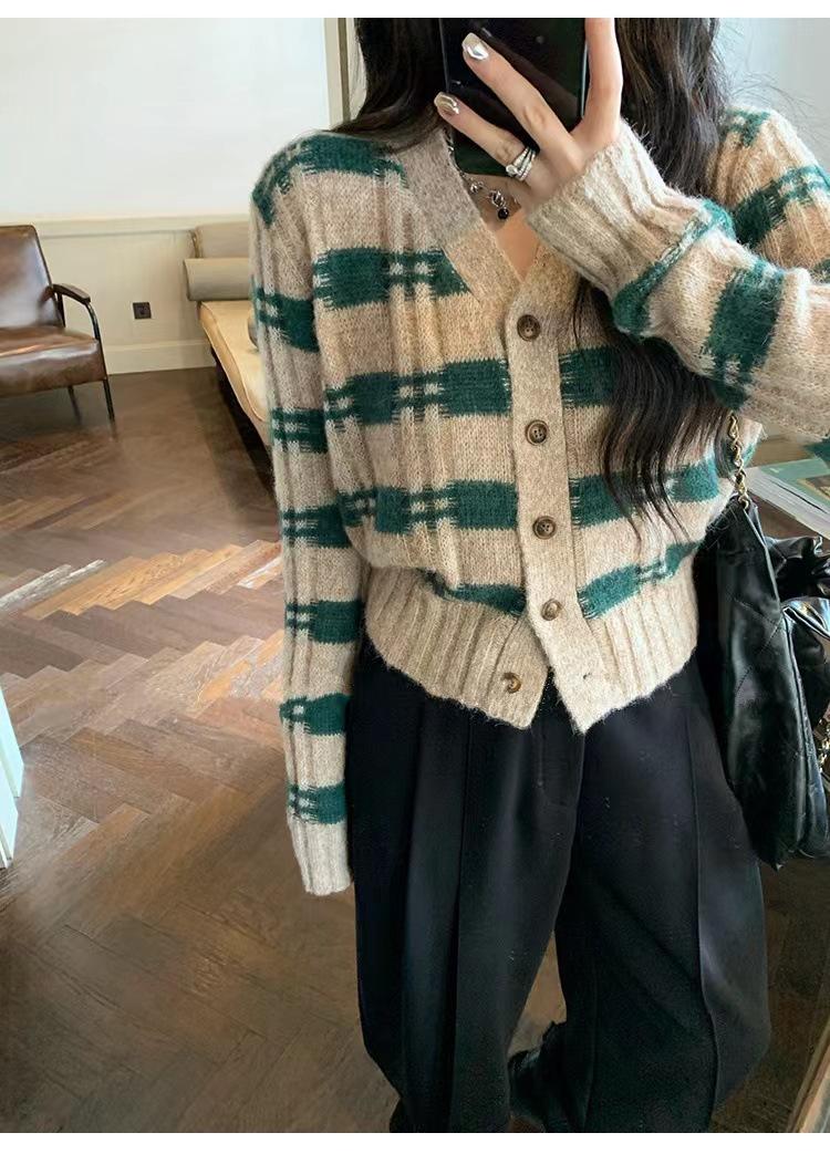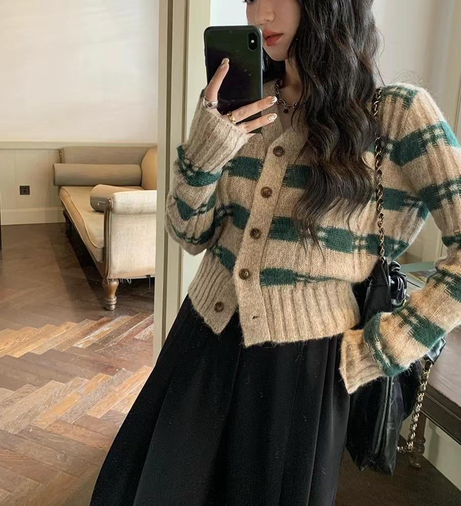 Nuevo Cárdigan Suéter Abrigo de Punto de Diseño Corto para Mujer con Cuello en V y Combinación de Colores a Rayas Top de Mohair