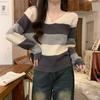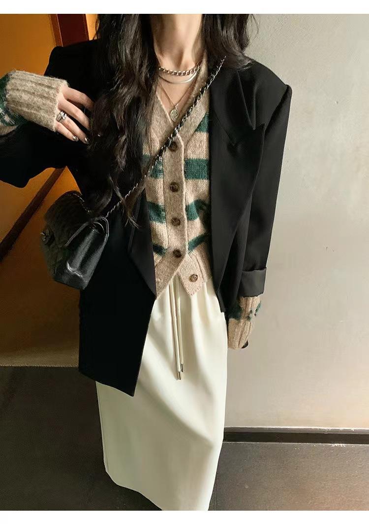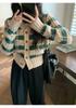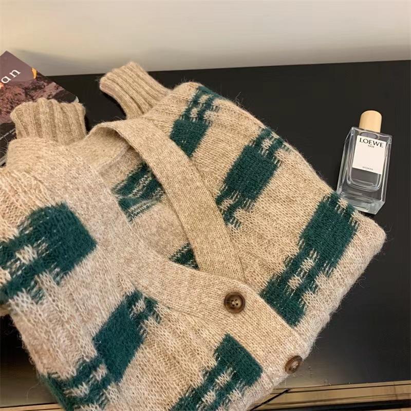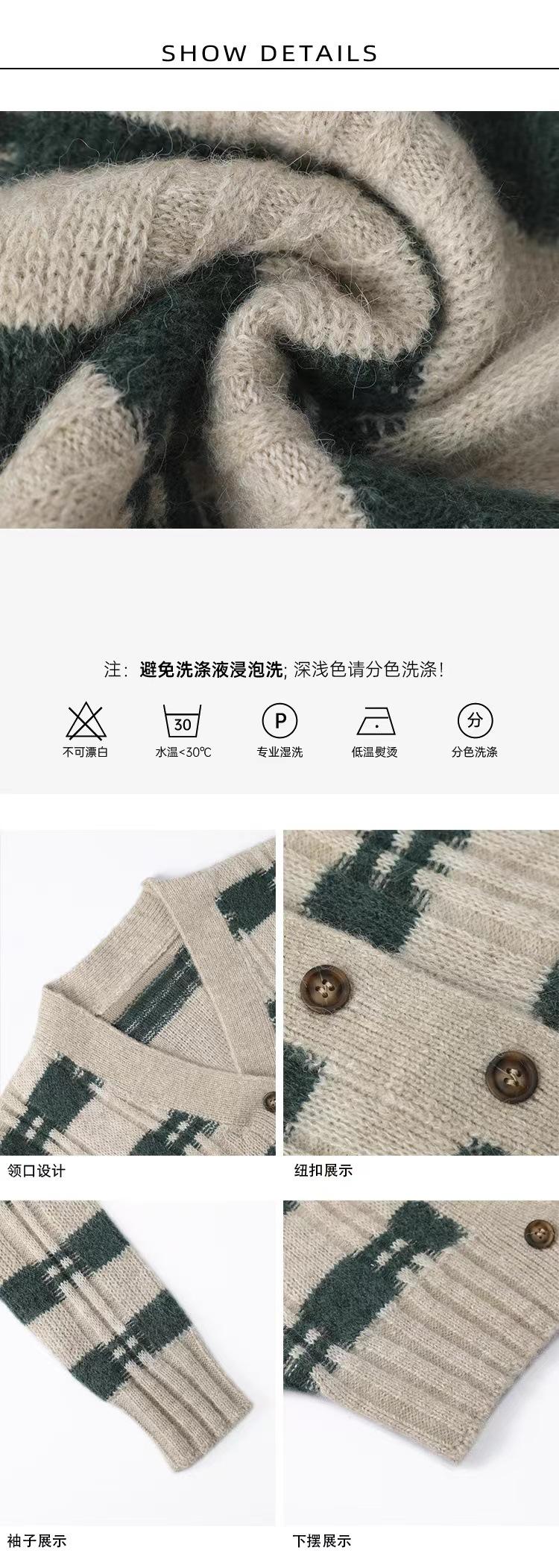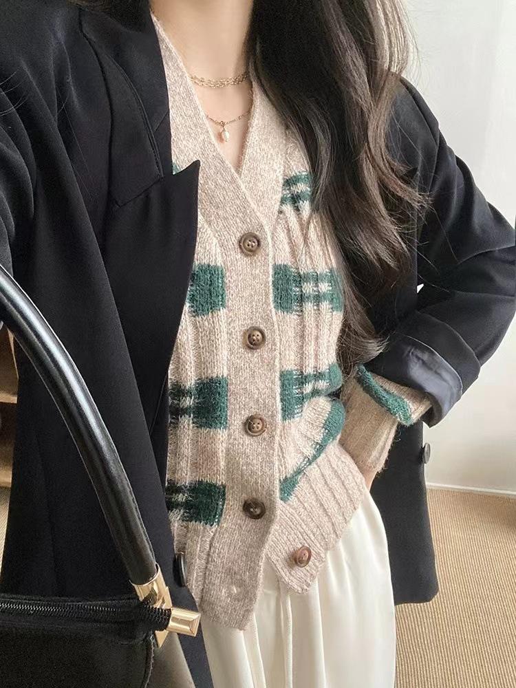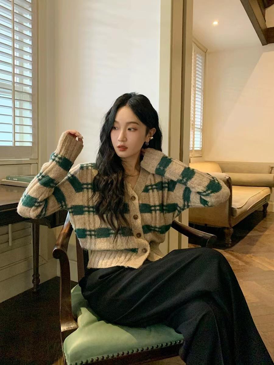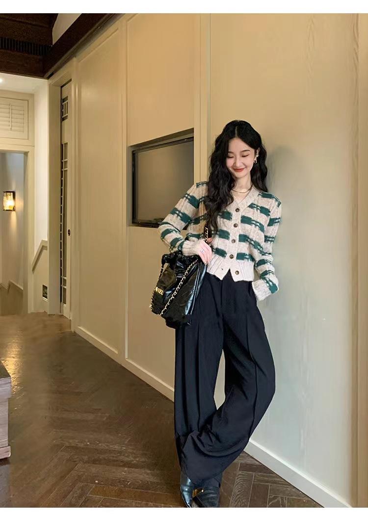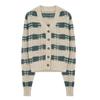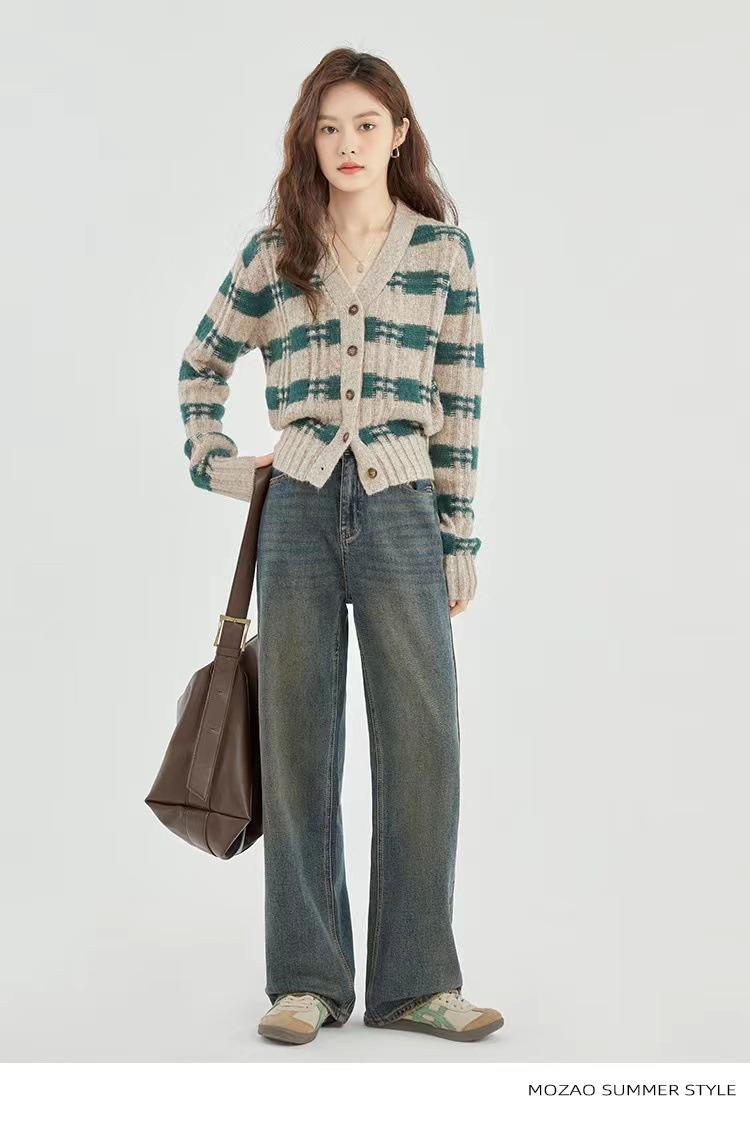 Nuevo Cárdigan Suéter Abrigo de Punto de Diseño Corto para Mujer con Cuello en V y Combinación de Colores a Rayas Top de Mohair