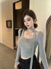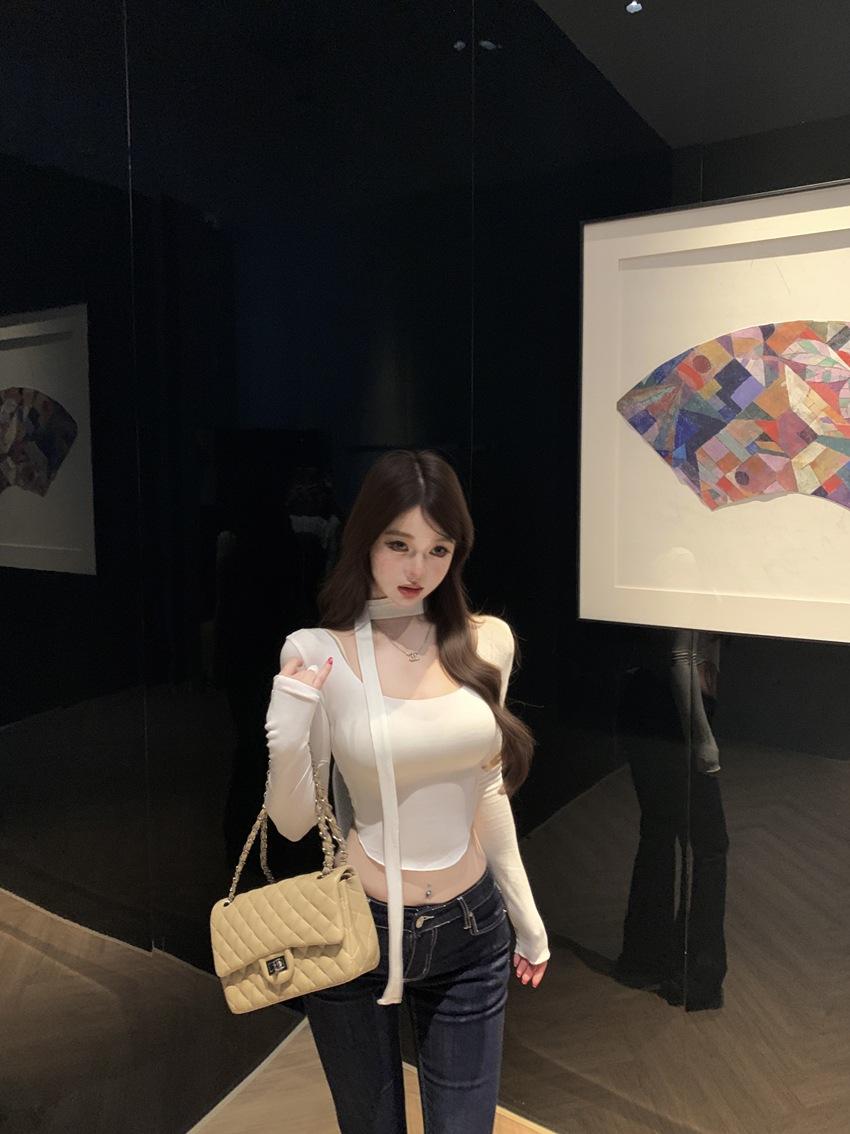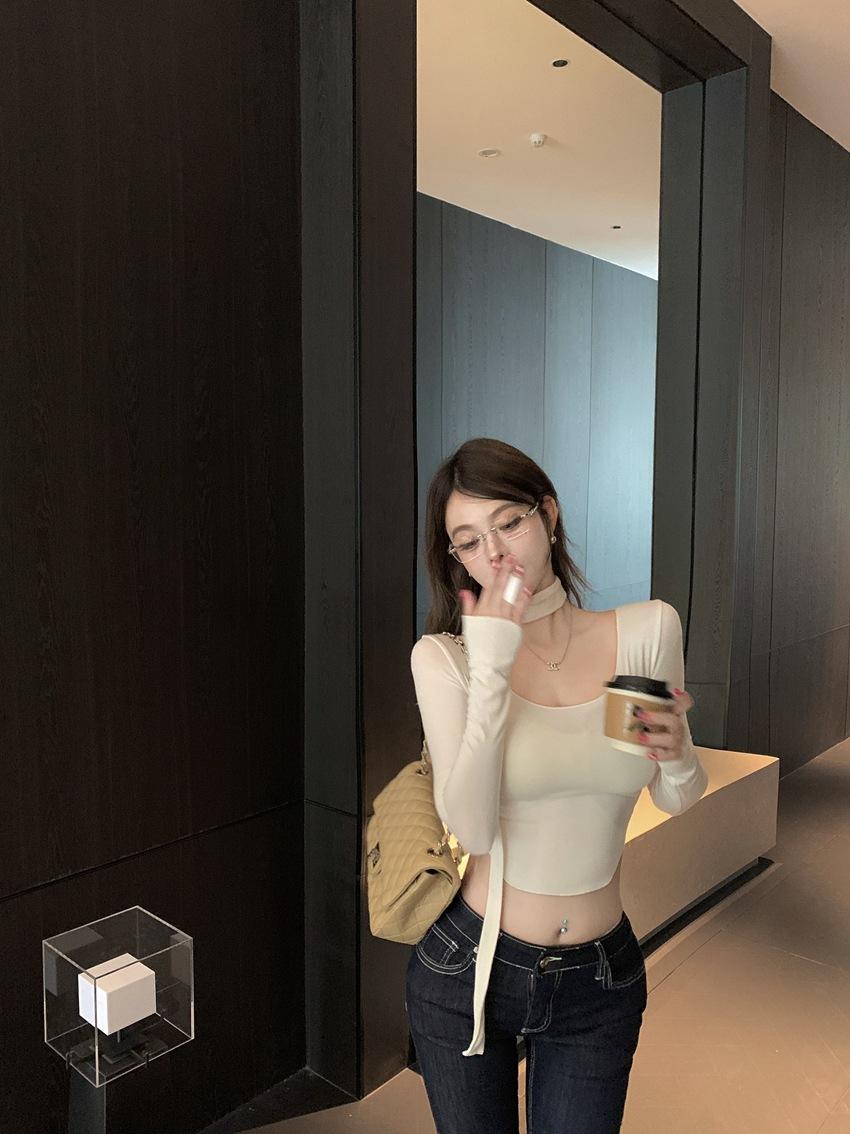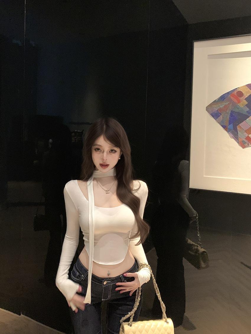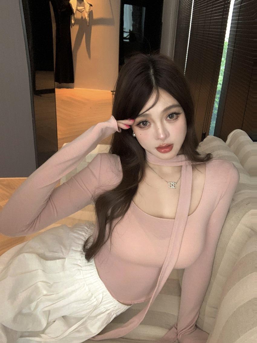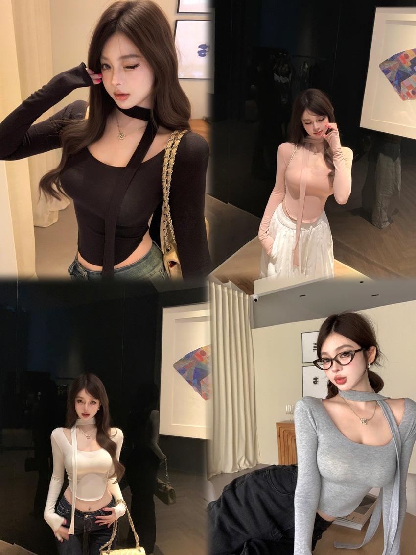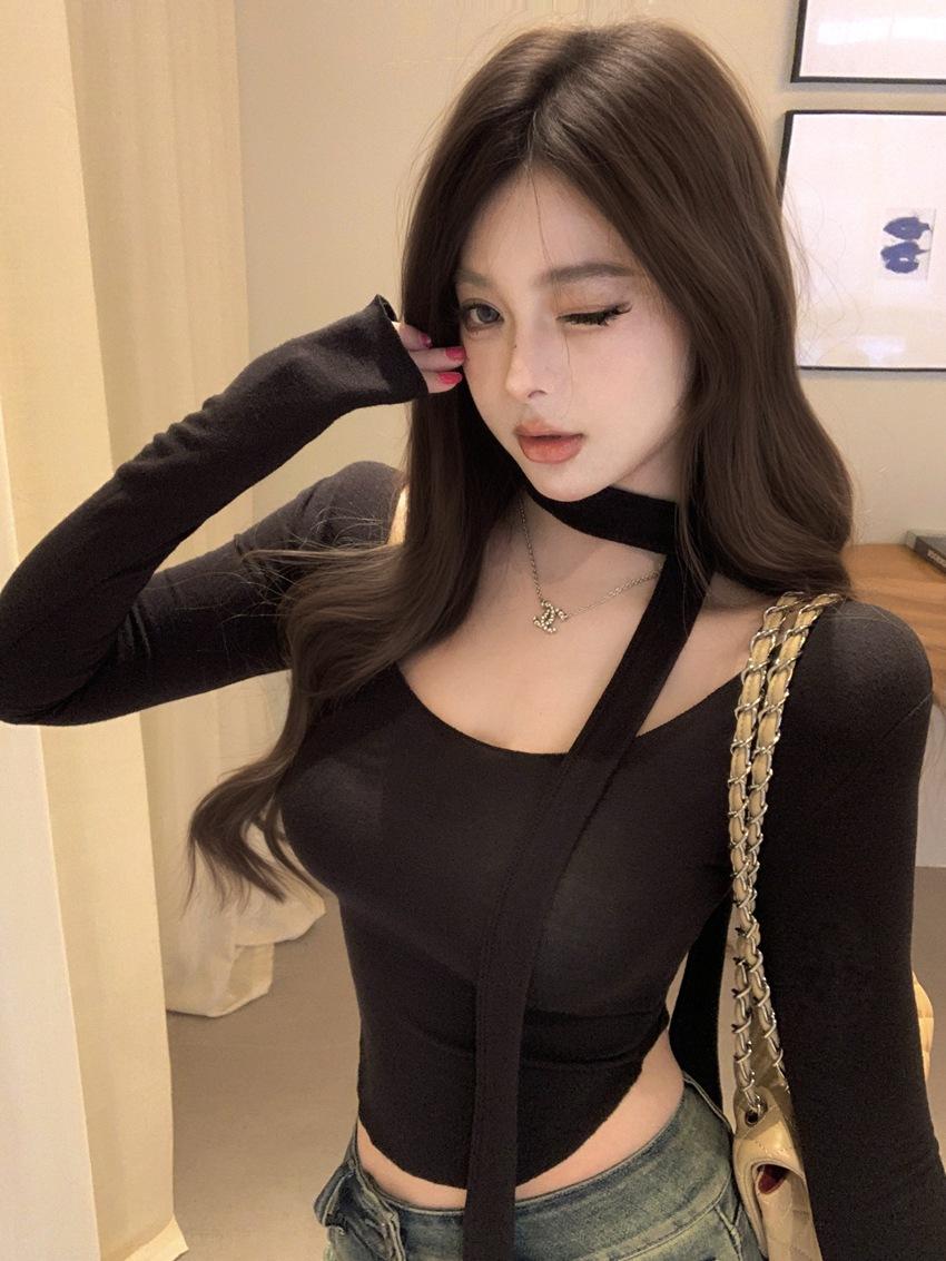 Foto Real 2025 Deseo Puro Estilo Chica Caliente Cuello U Cinta Manga Larga Camiseta Mujer Corta Adelgazante Elástica Top Camiseta Base