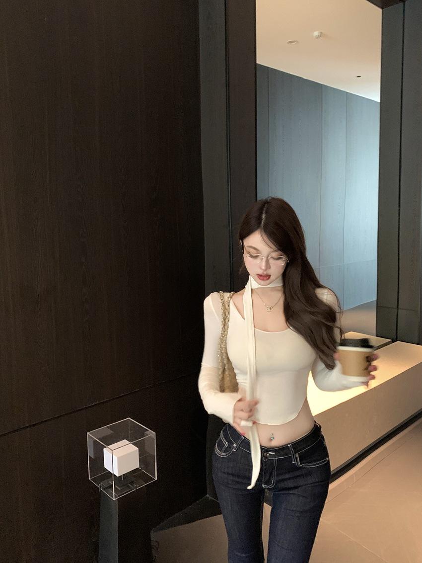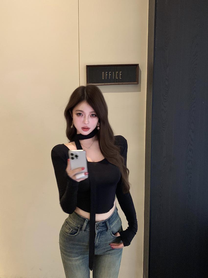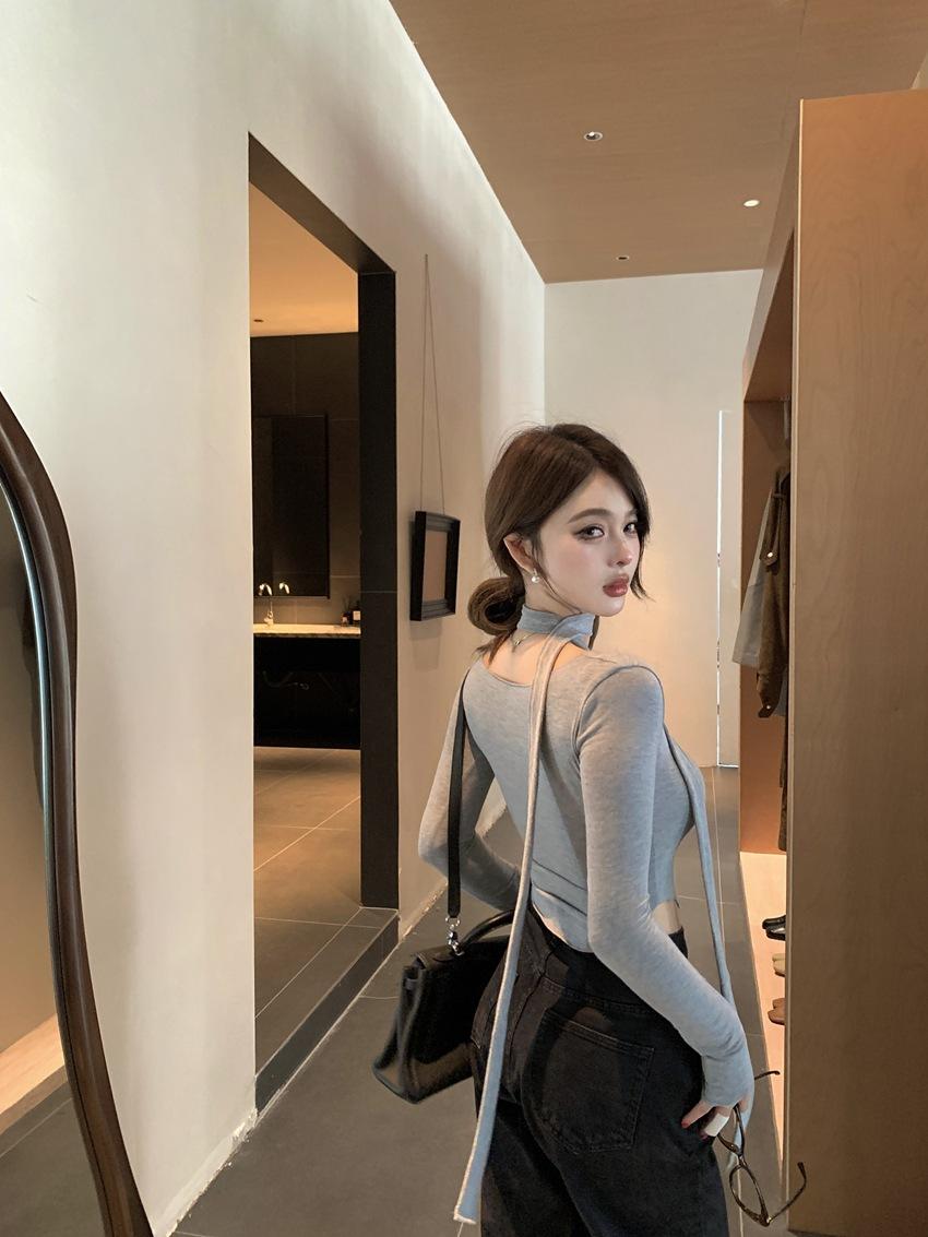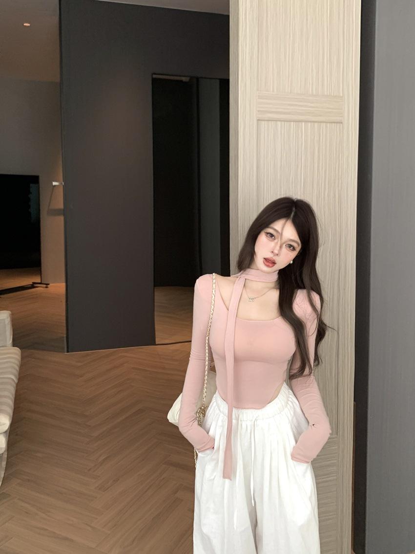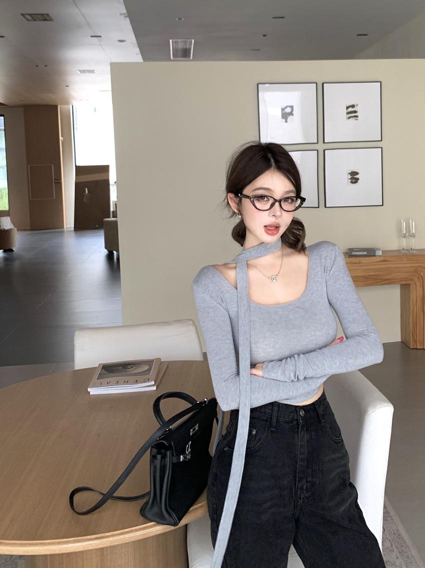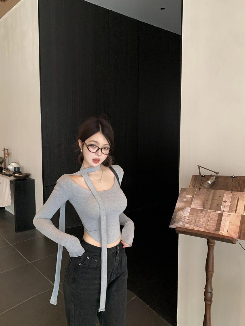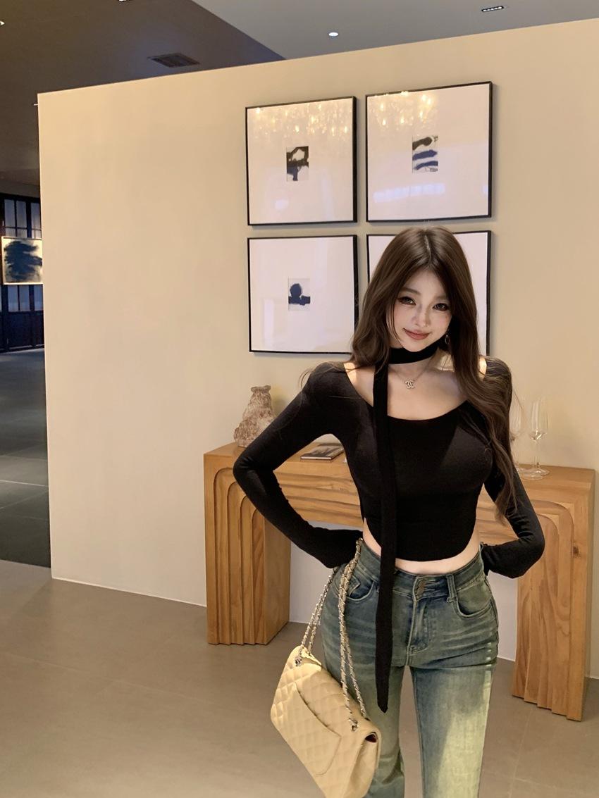 Foto Real 2025 Deseo Puro Estilo Chica Caliente Cuello U Cinta Manga Larga Camiseta Mujer Corta Adelgazante Elástica Top Camiseta Base