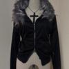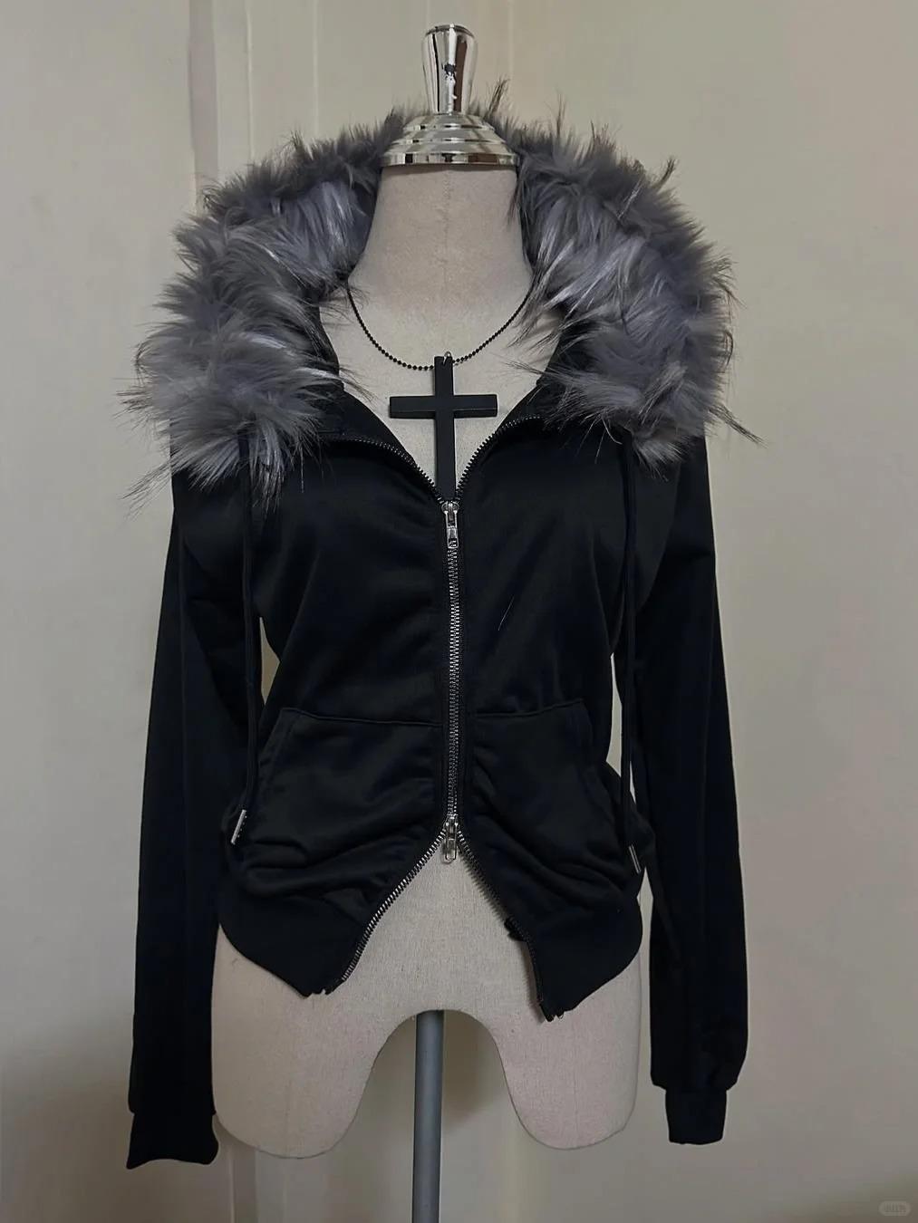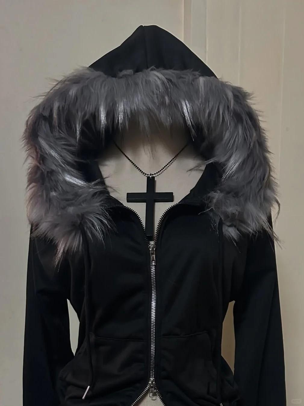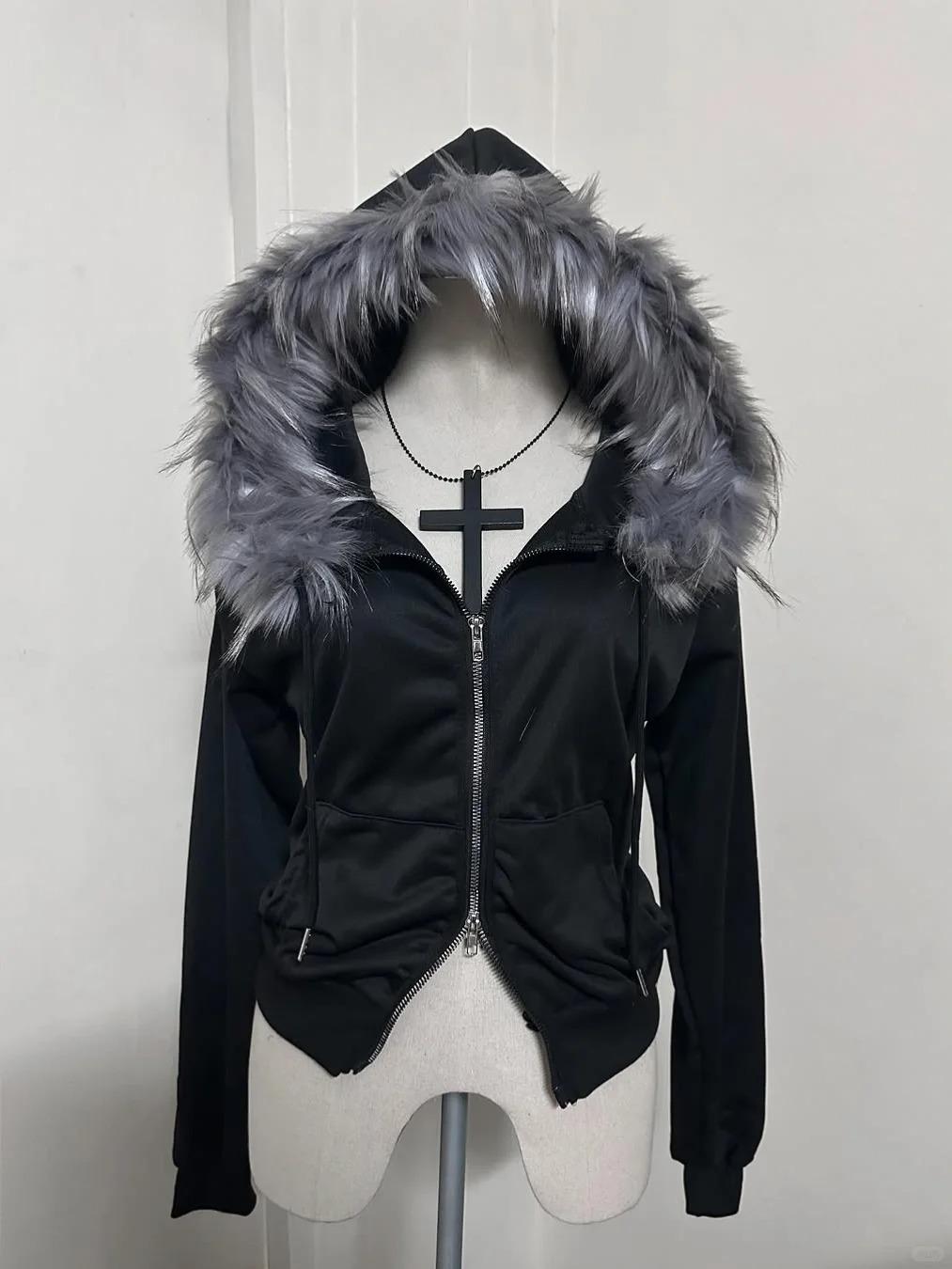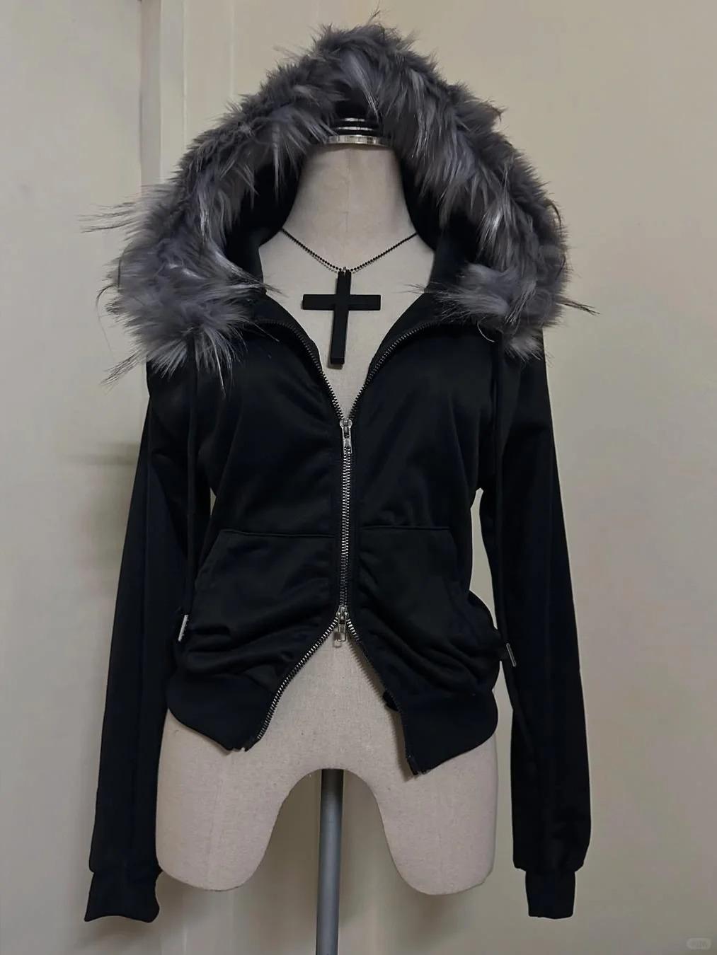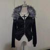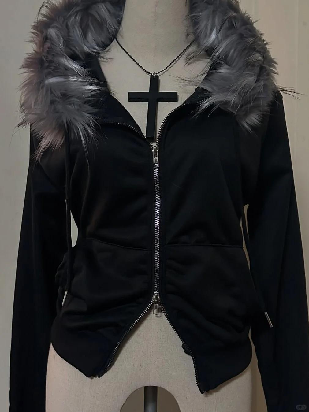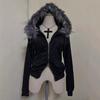 Americano Y2k Urbano Casual Estampado Parche de Piel Sintética Patchwork con Capucha Corto Adelgazante Chica Caliente Cordón en la Cintura Cierre con Cremallera Chaqueta Top