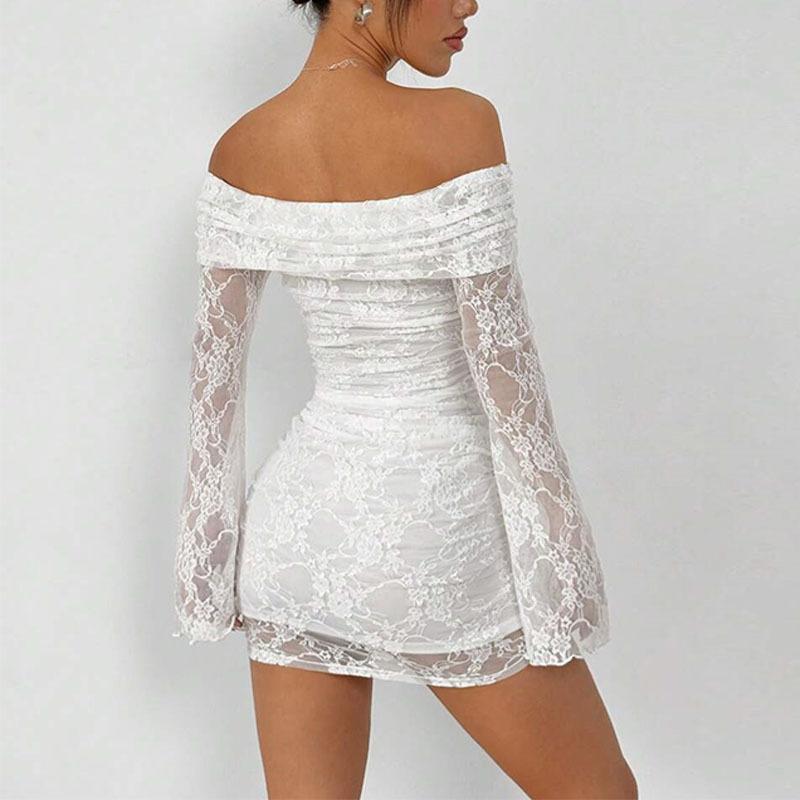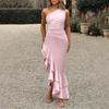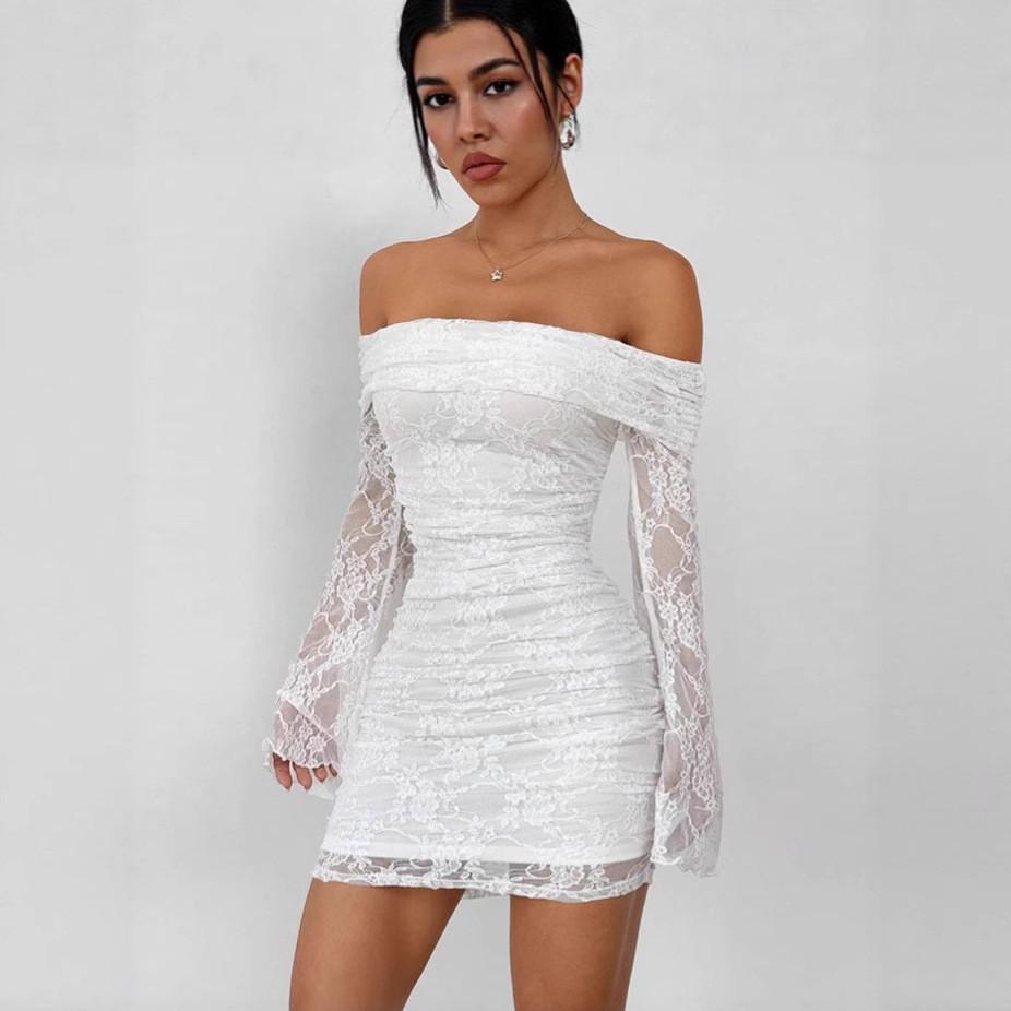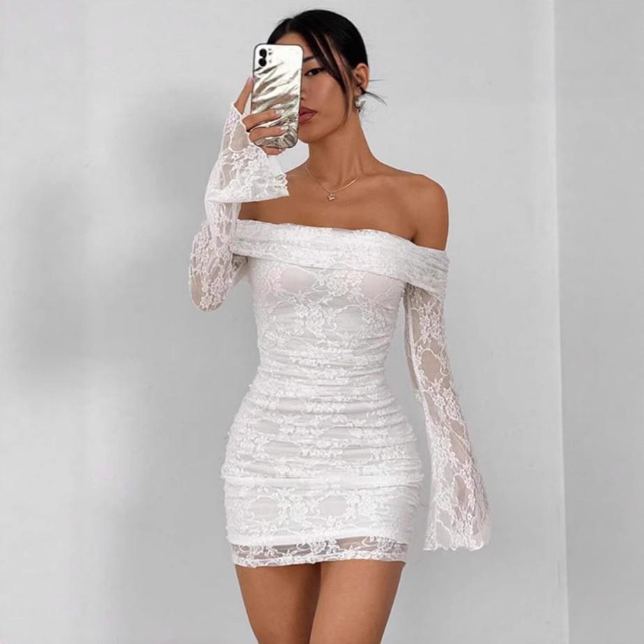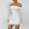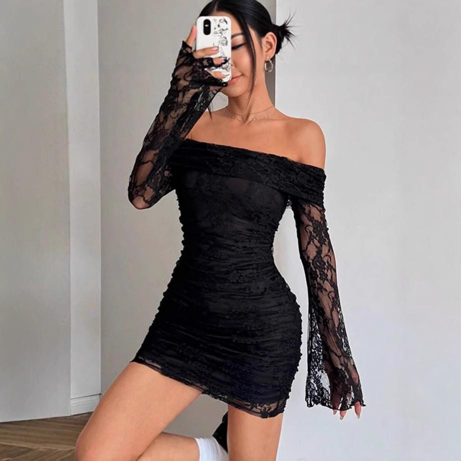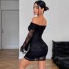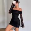 Vestido de mujer estilo ins transfronterizo europeo y americano sexy moda encaje malla costuras hombros descubiertos corte ajustado versátil color sólido