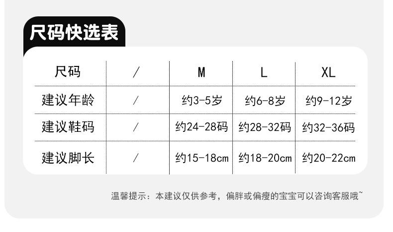 3-5 years old [recommended shoe size 24-27], 6-8 years old [recommended shoe size 27-31], 9-12 years old [reco...