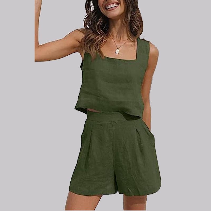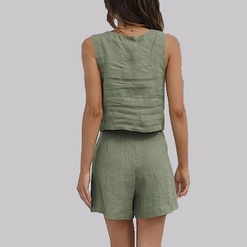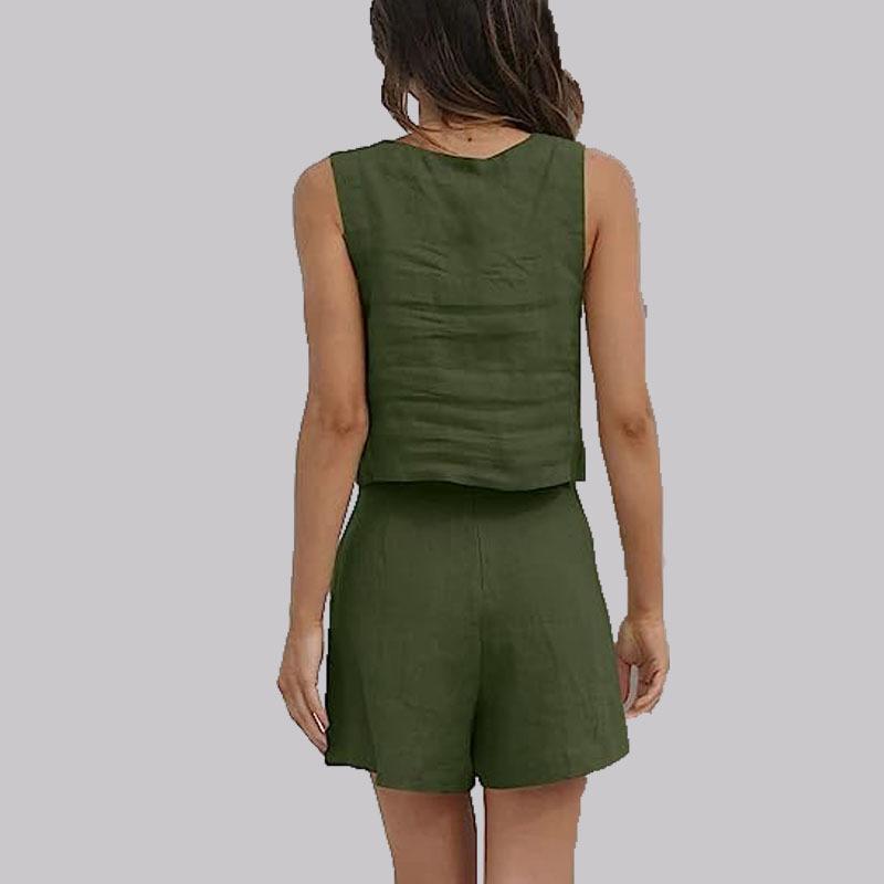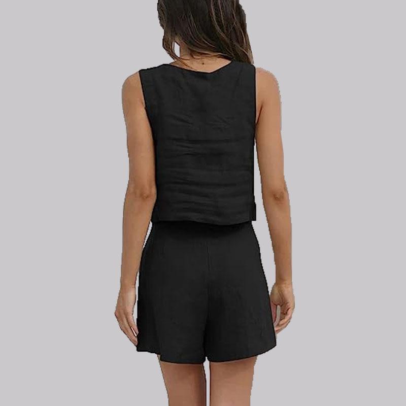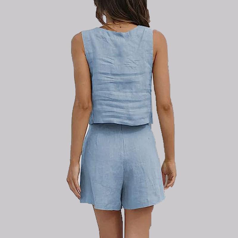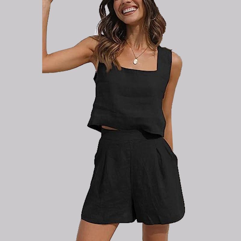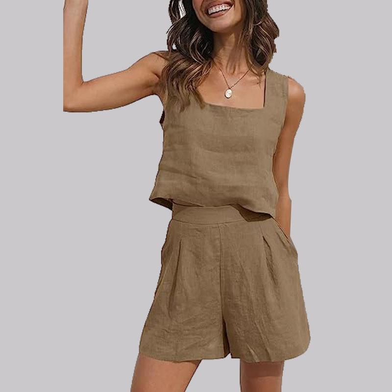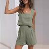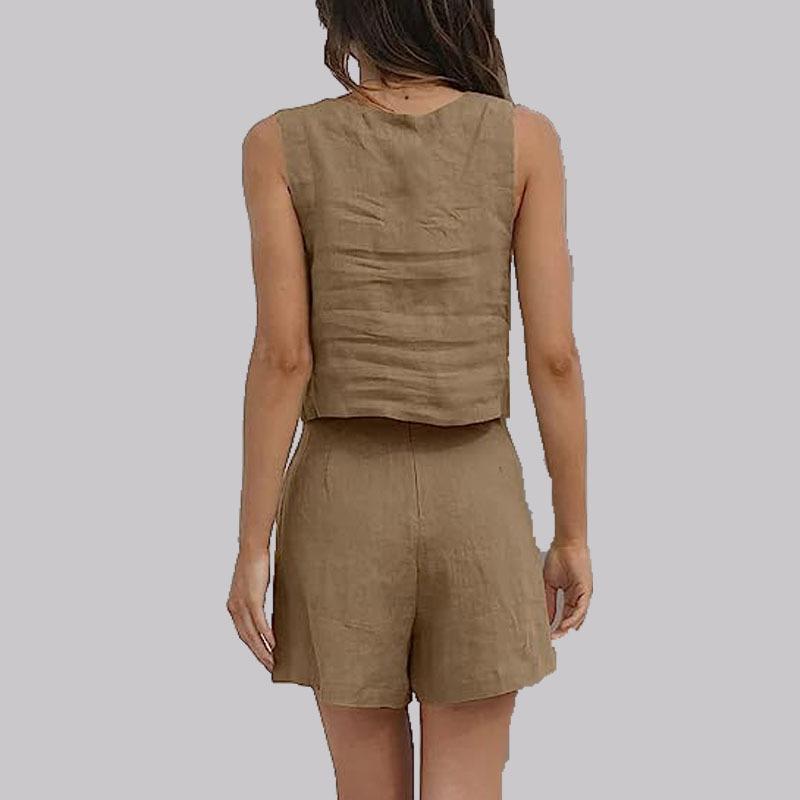 Conjunto de dos piezas casual a la moda 2024 Shorts de lino Crop top Conjunto para vacaciones de verano Elegante Versátil