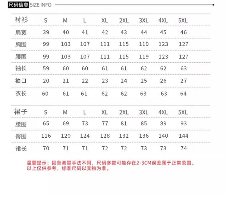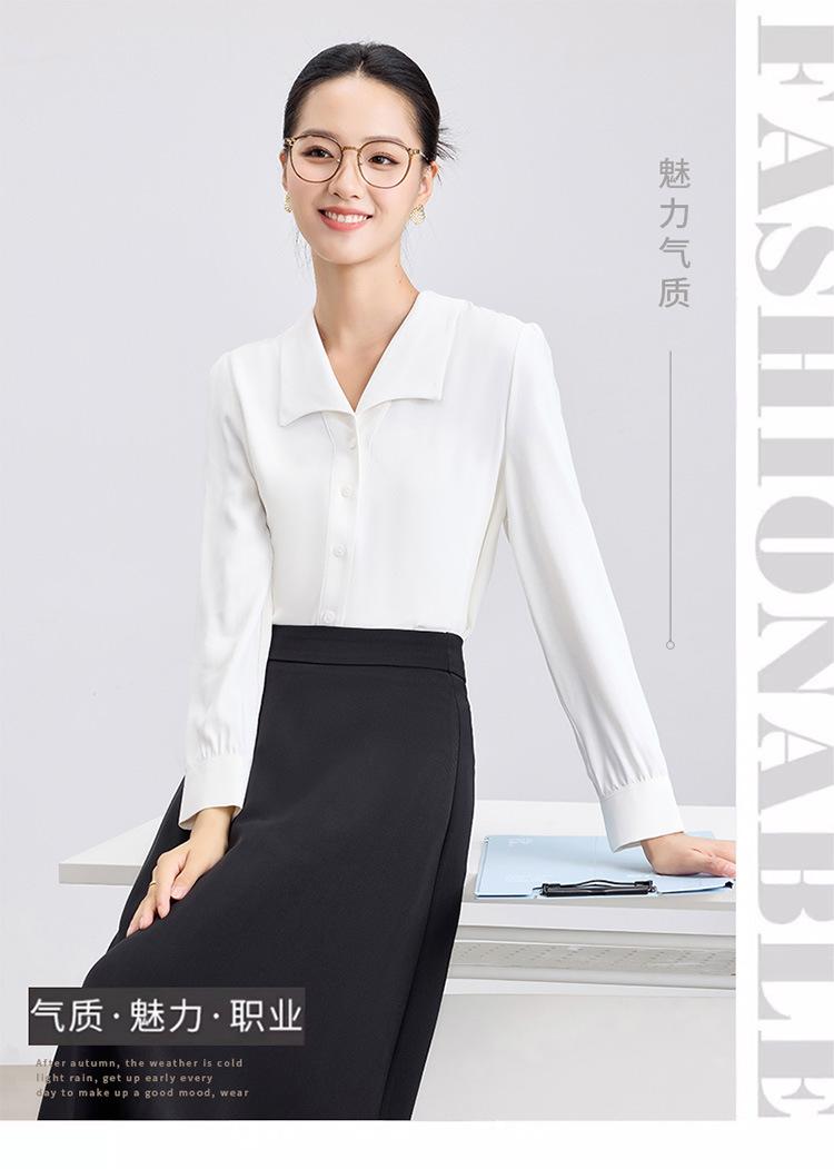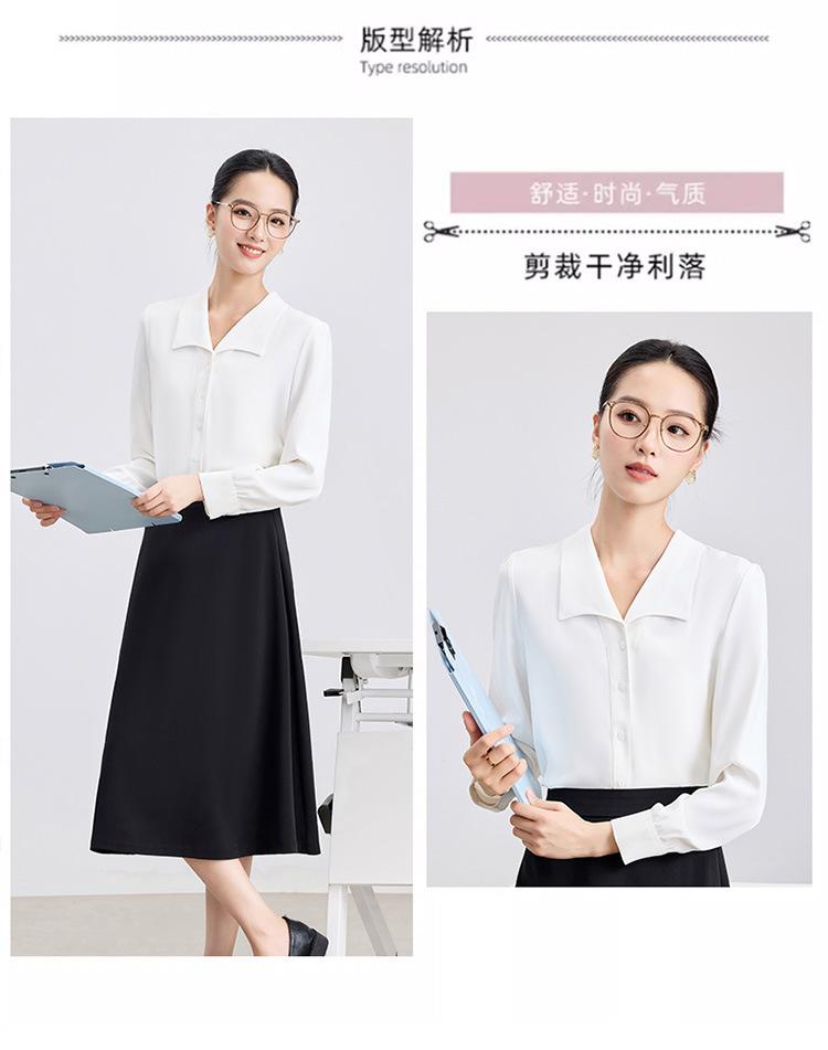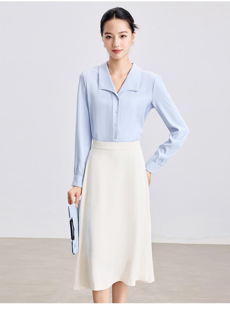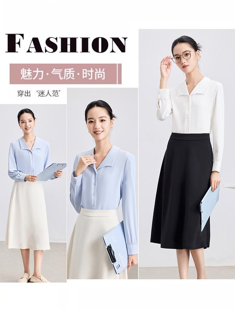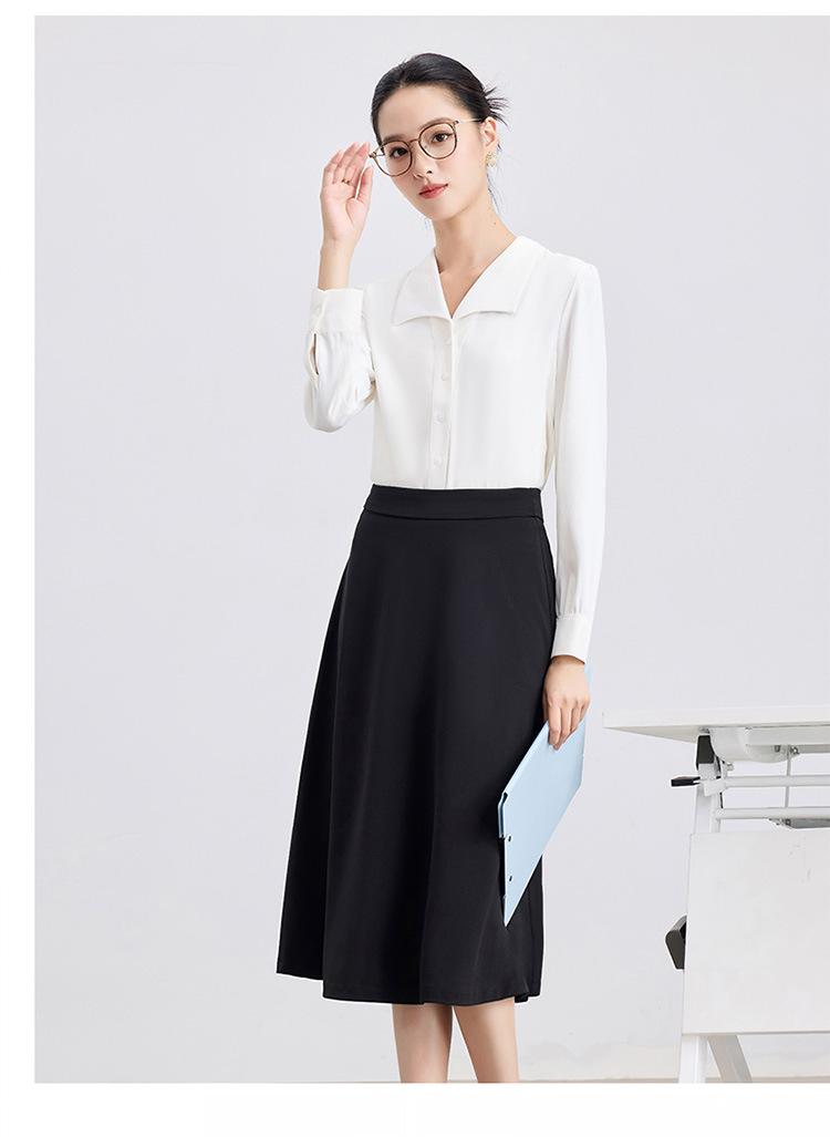 White shirt, Blue Shirt, black A-line skirt, apricot A-line skirt