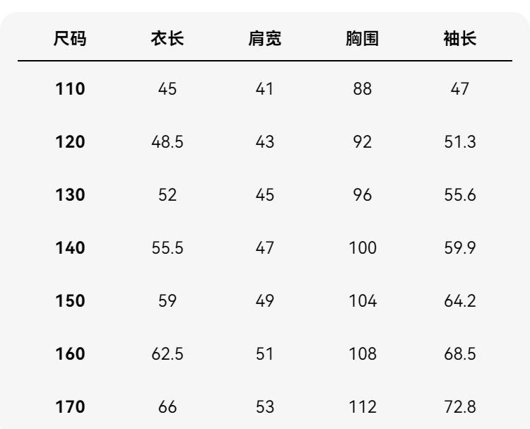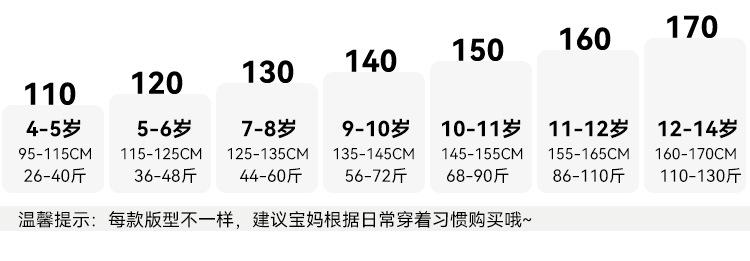 110cm, 120cm, 130cm, 140cm, 150cm, 160cm