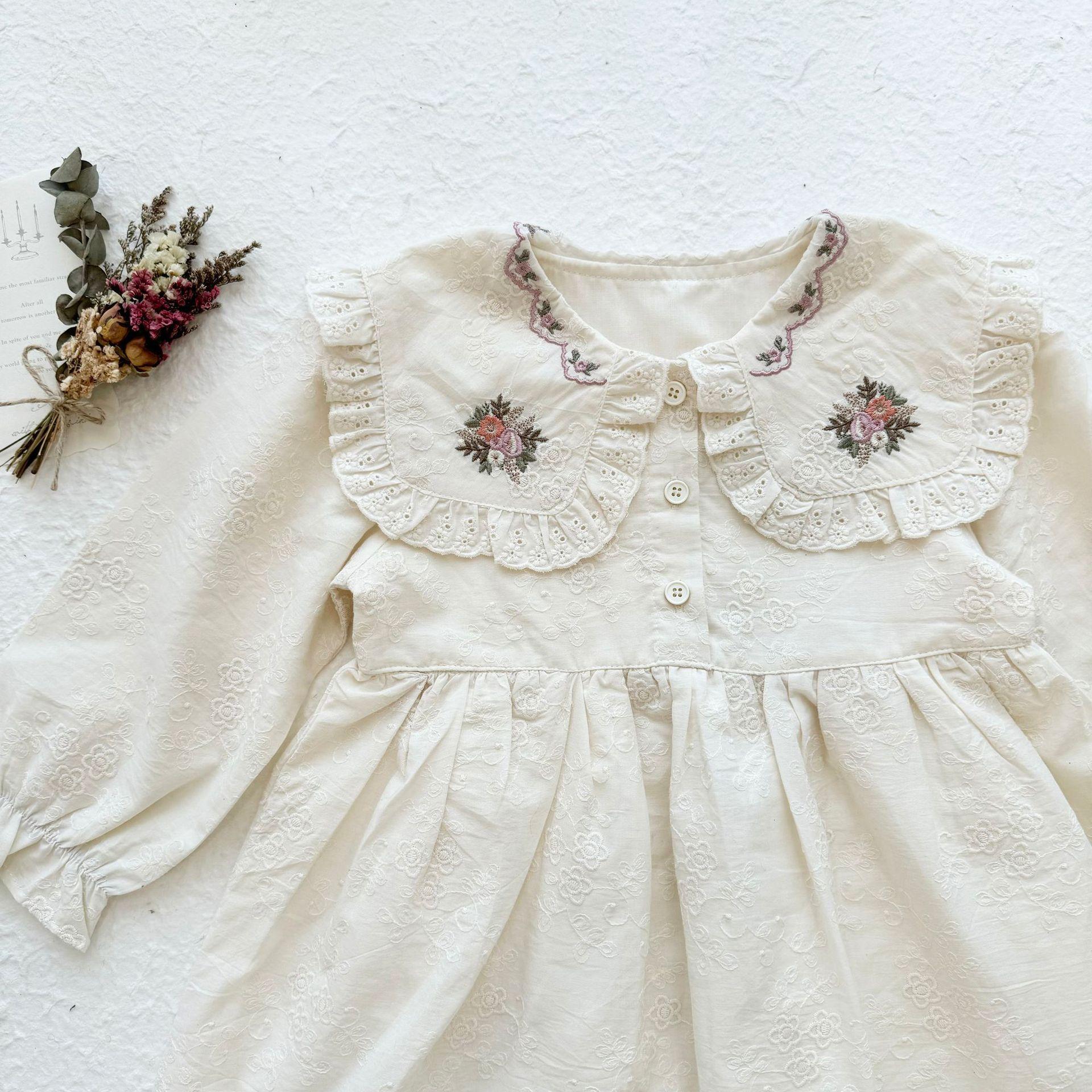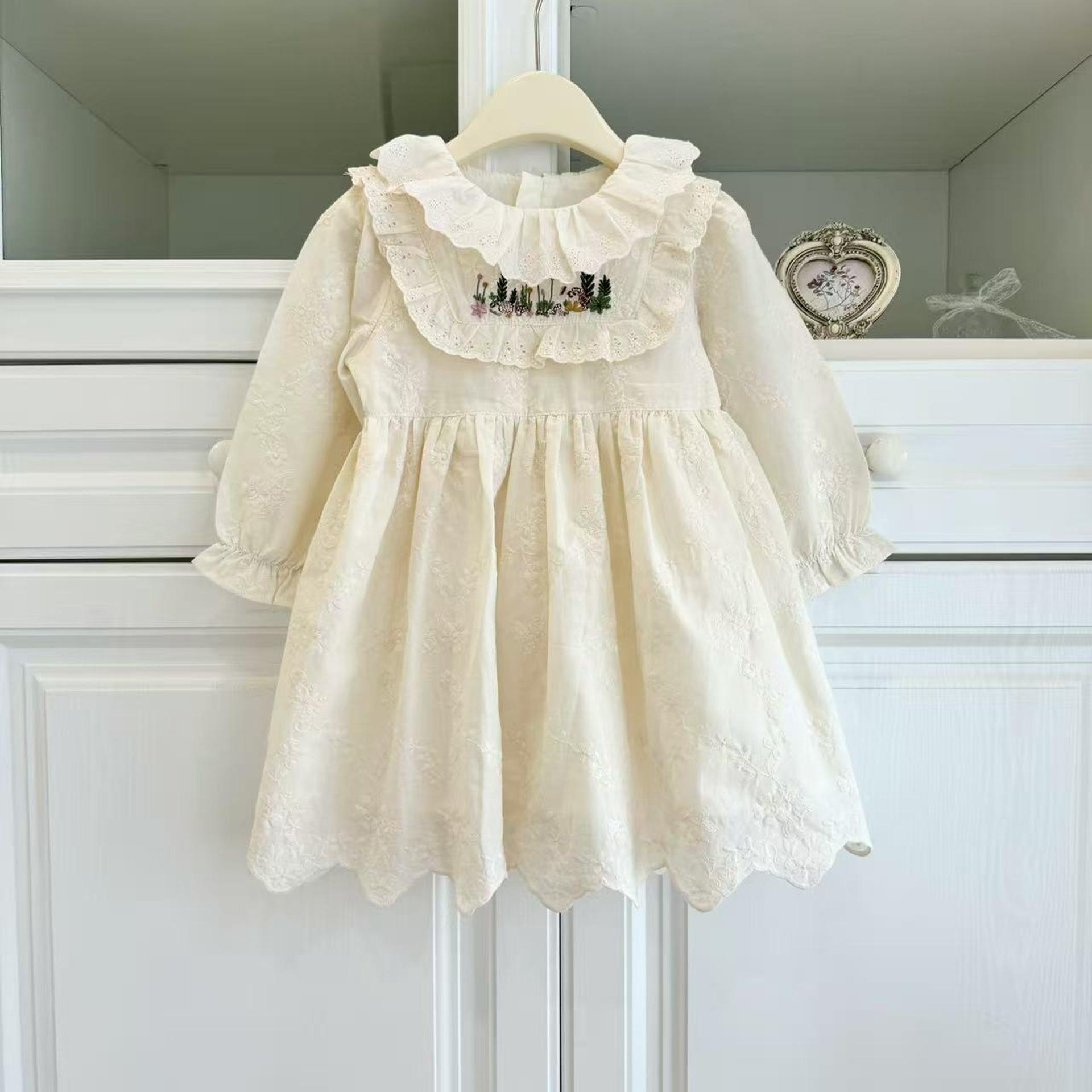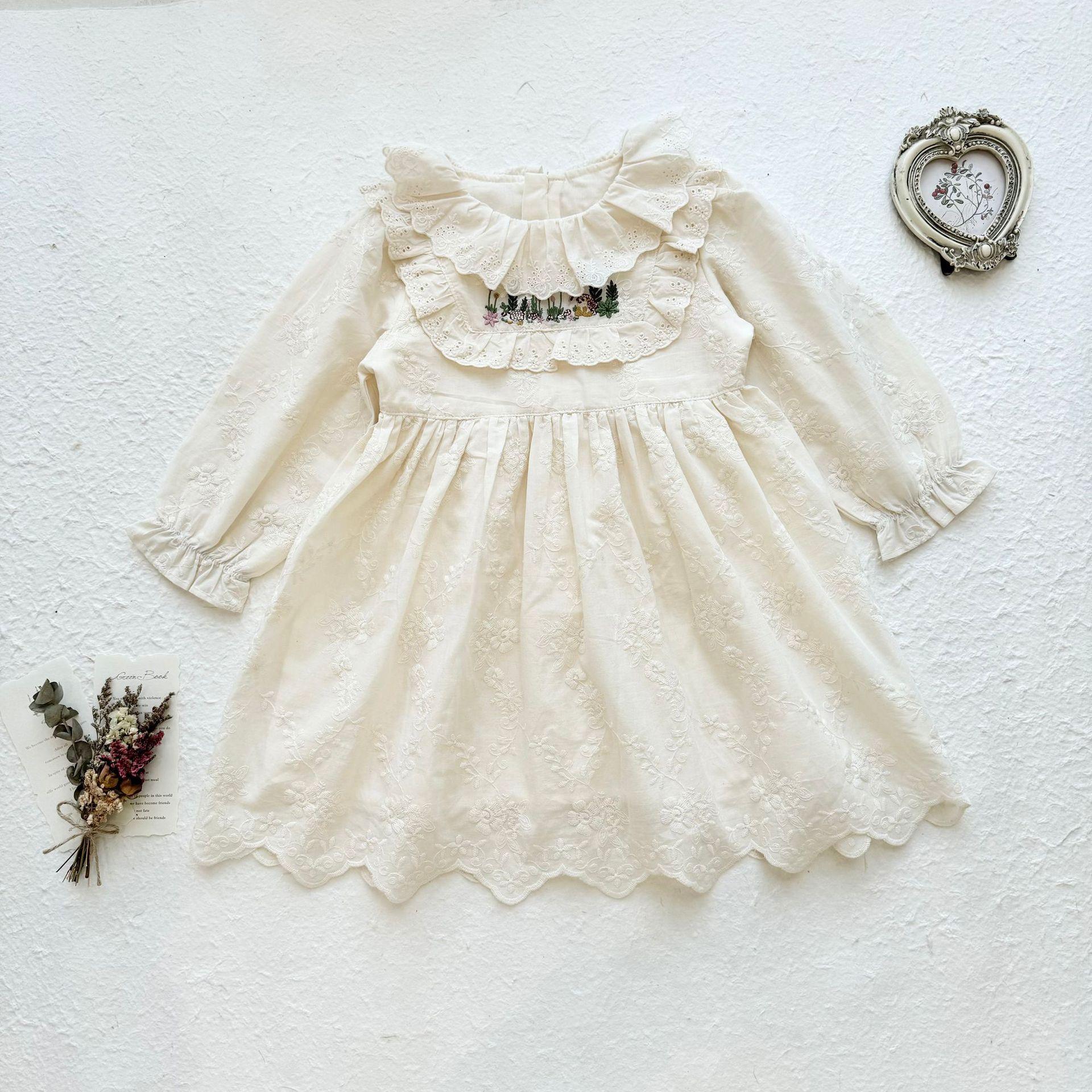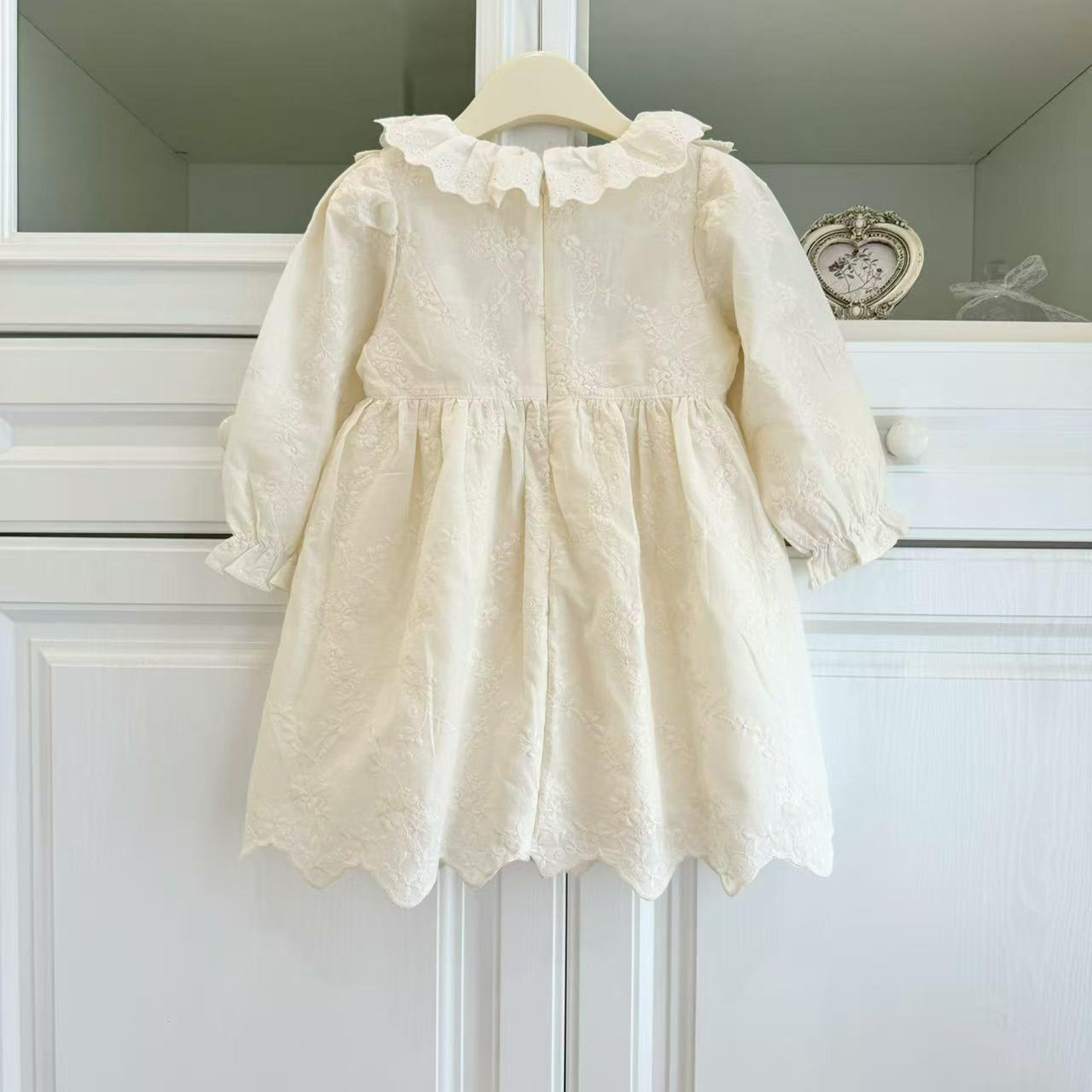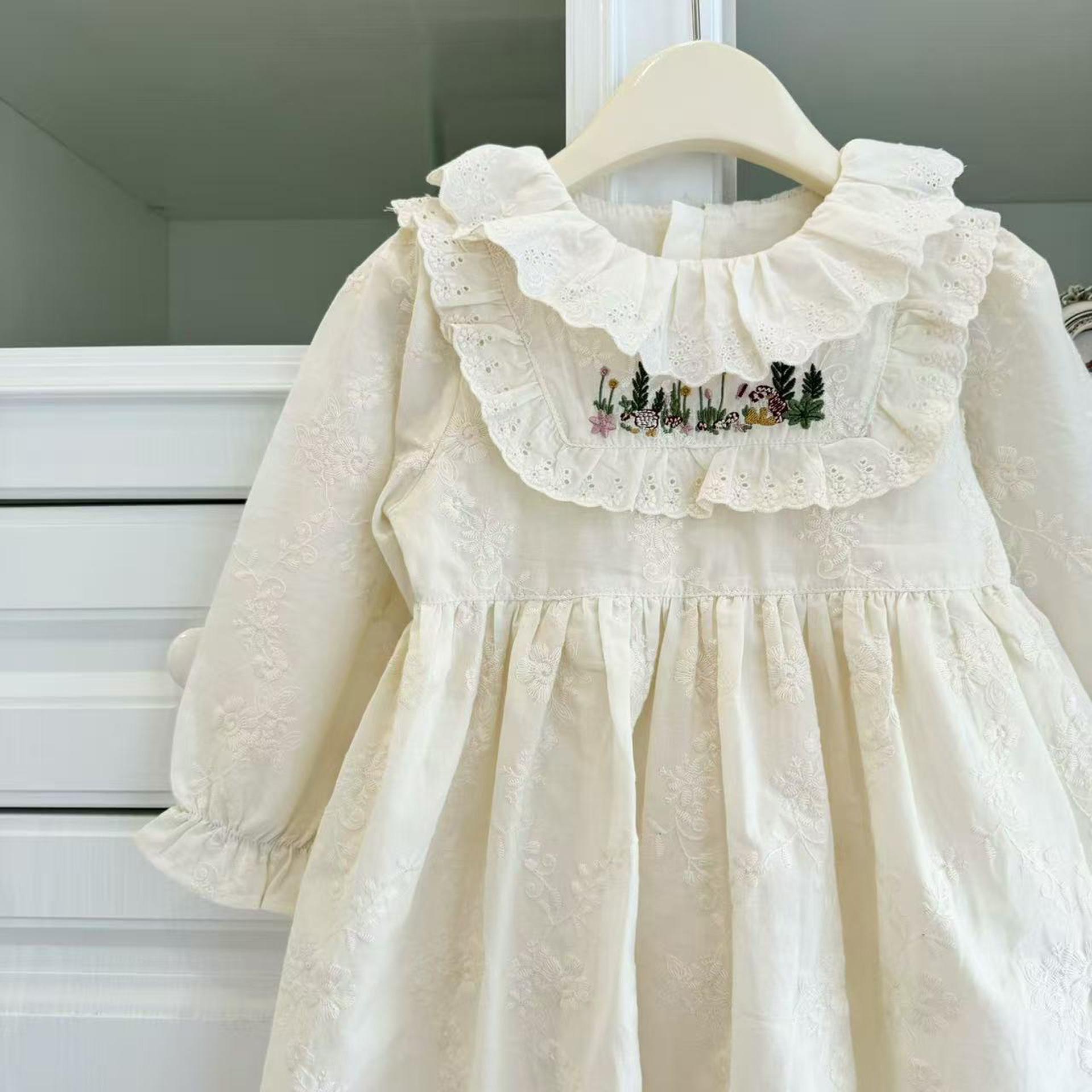 Vestido de Otoño para Niñas 2025 Nuevo Vestido Dulce de Encaje de Manga Larga con Cuello de Volantes Bordado