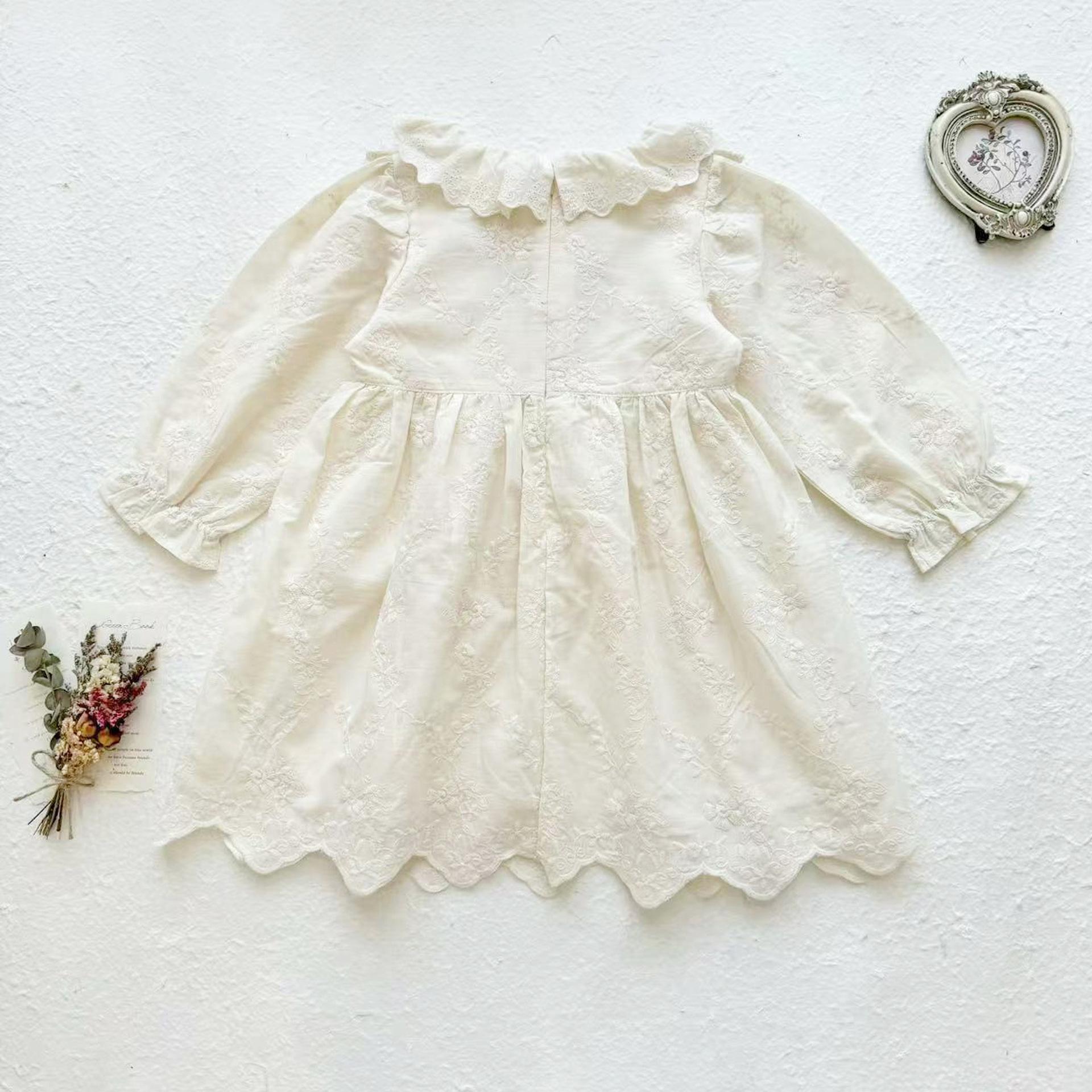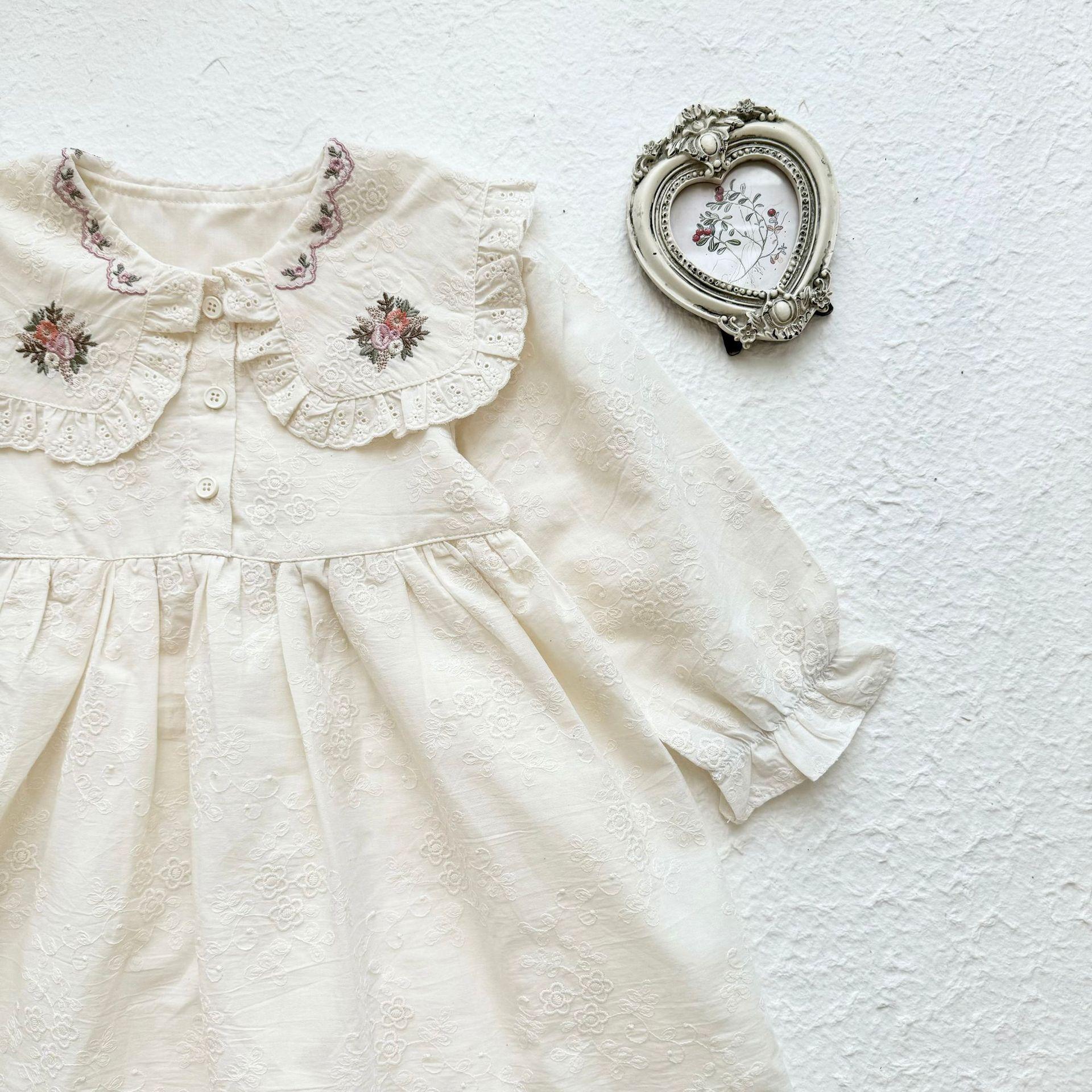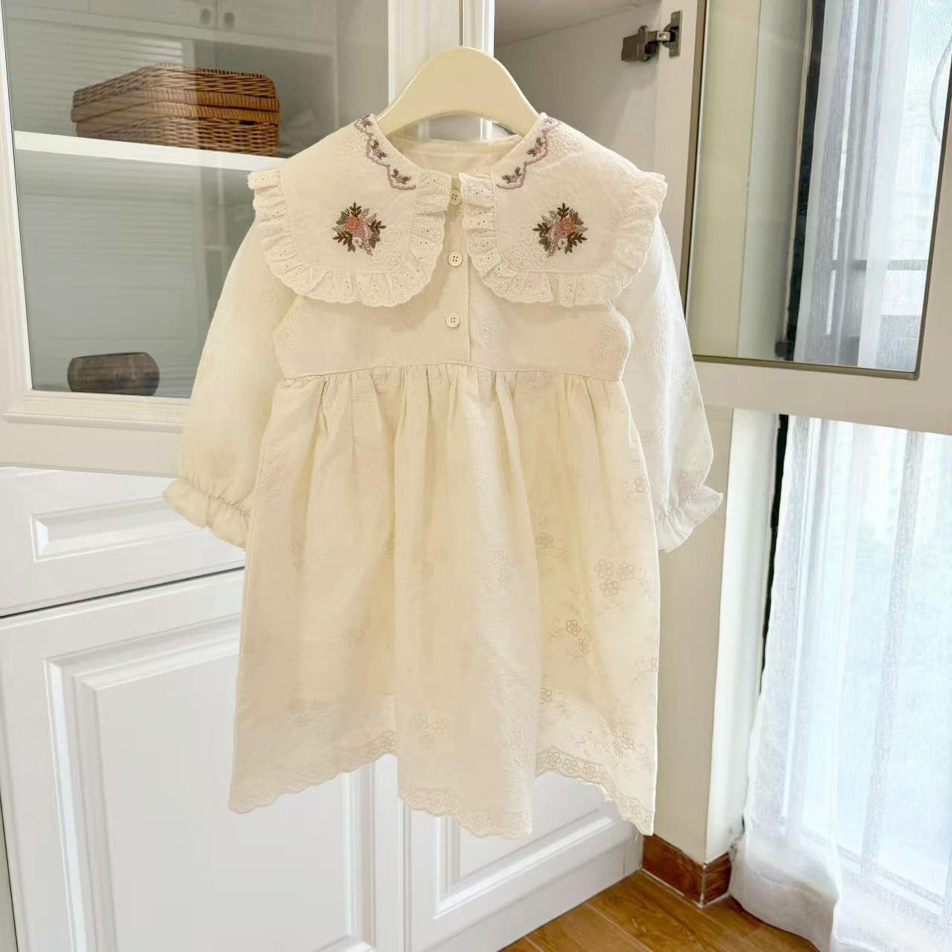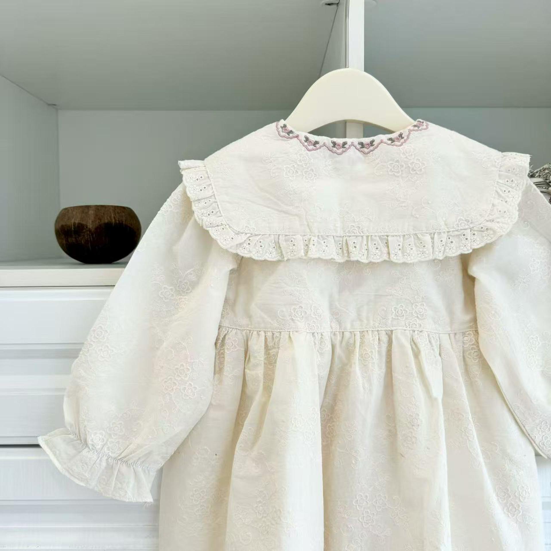 Vestido de Otoño para Niñas 2025 Nuevo Vestido Dulce de Encaje de Manga Larga con Cuello de Volantes Bordado