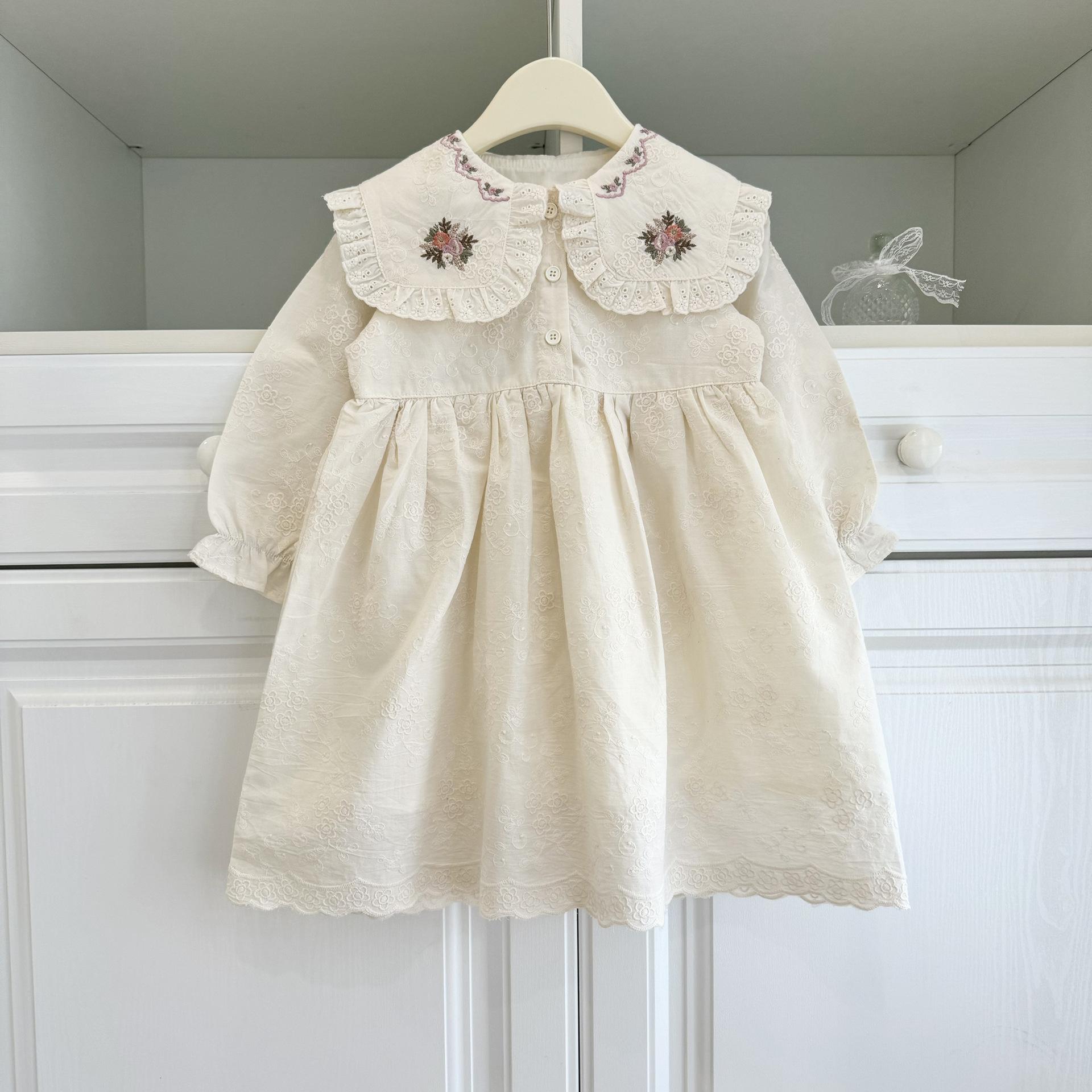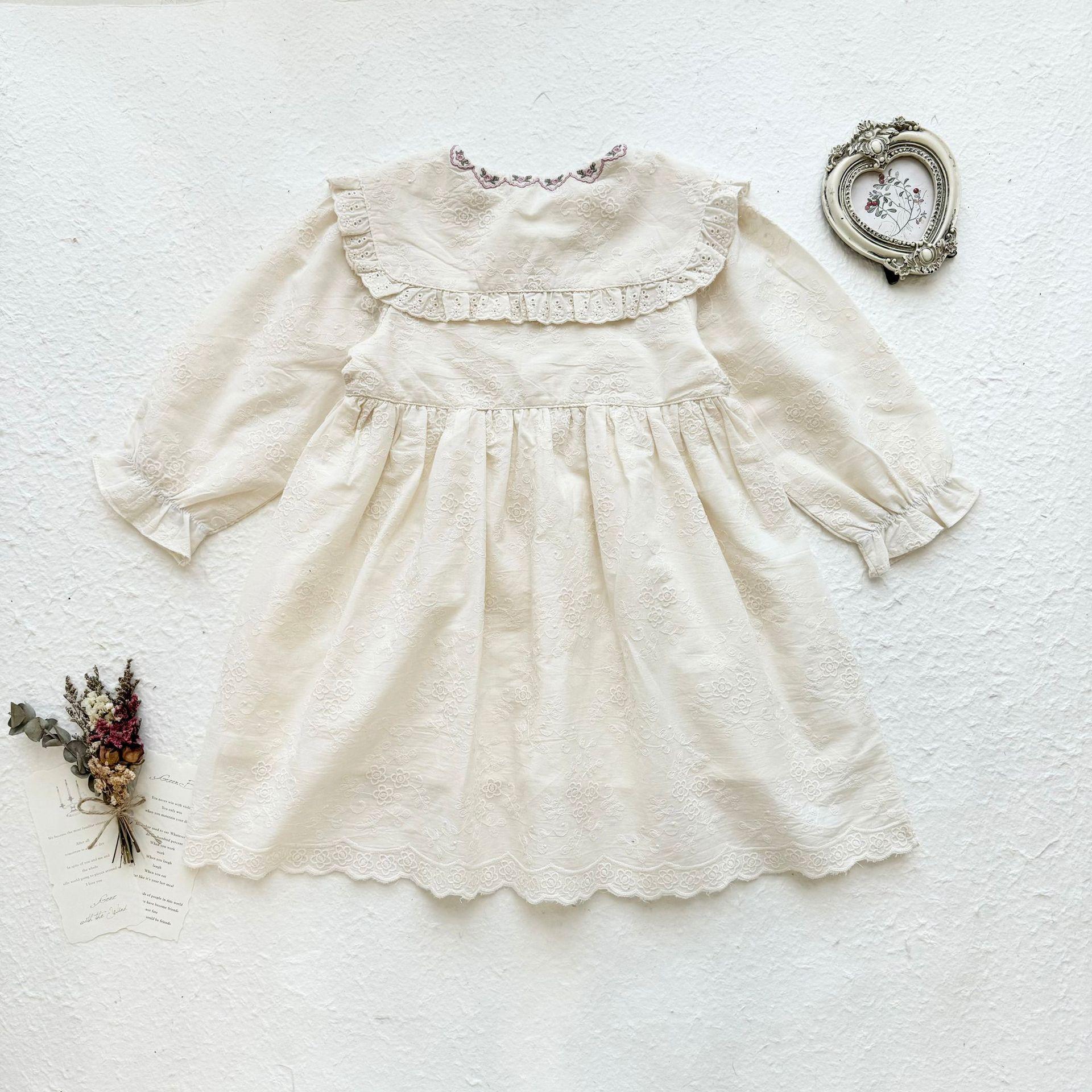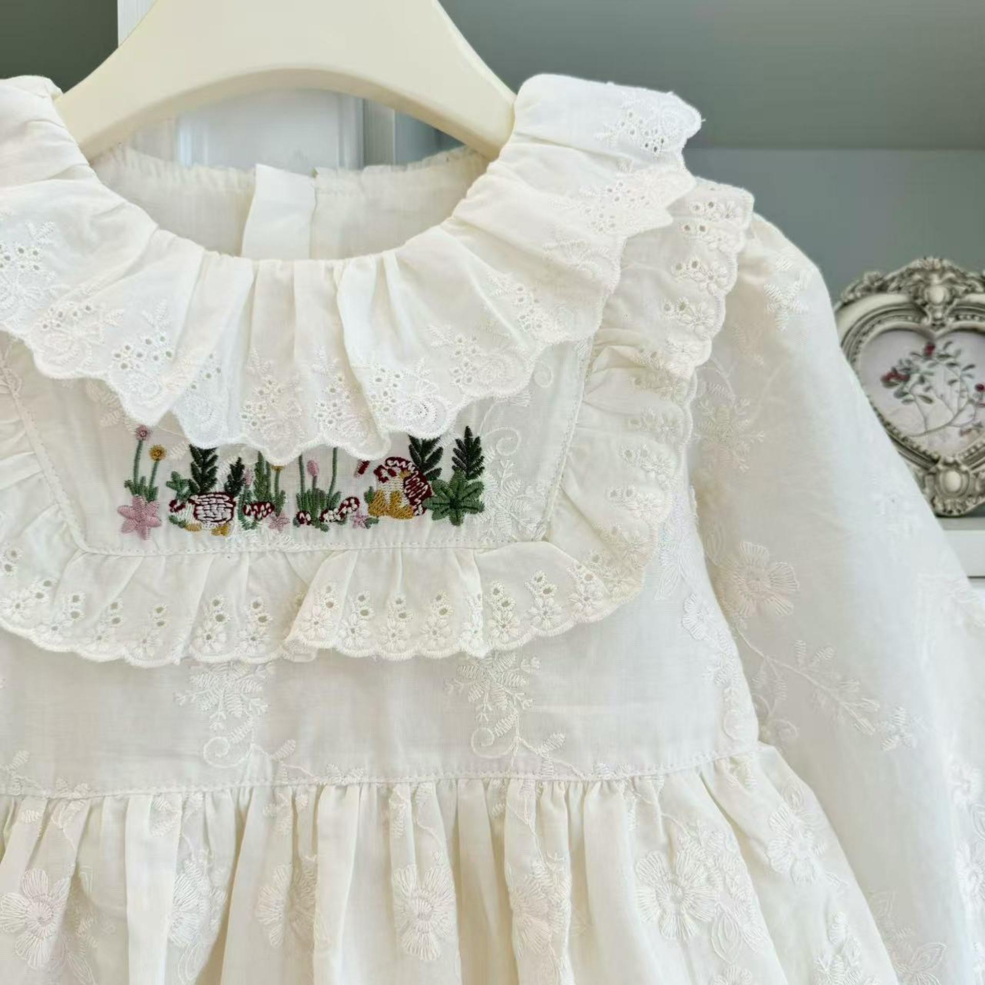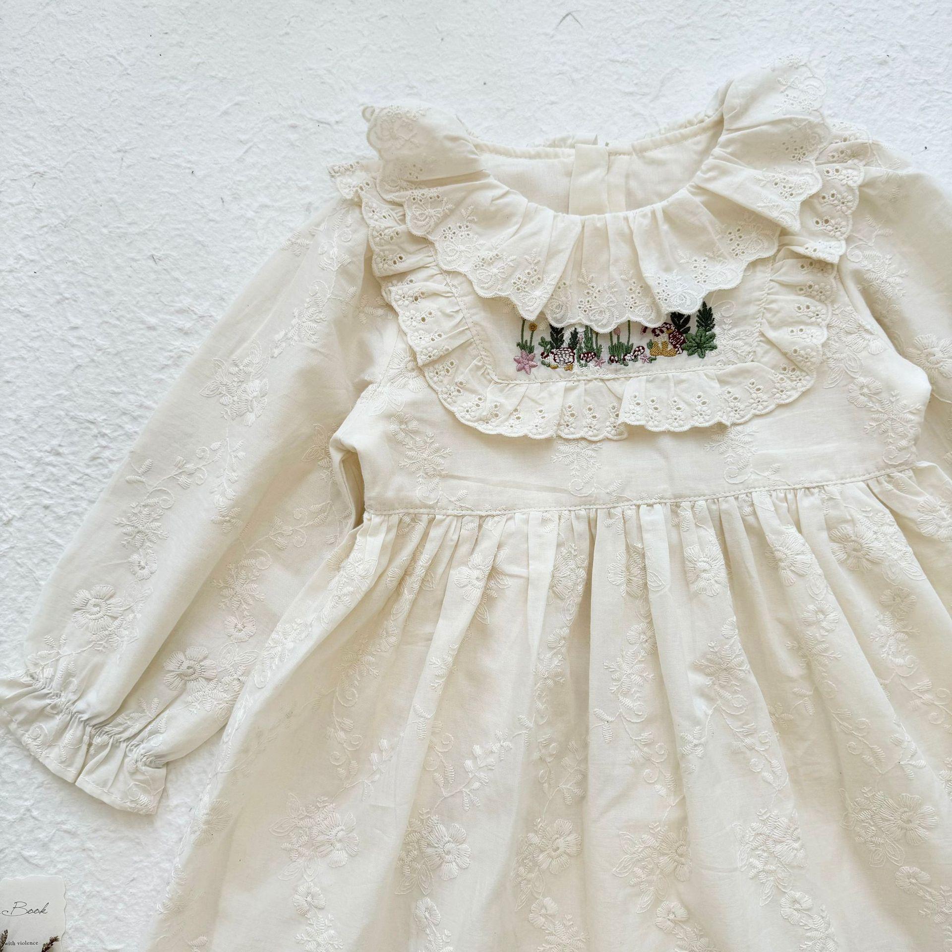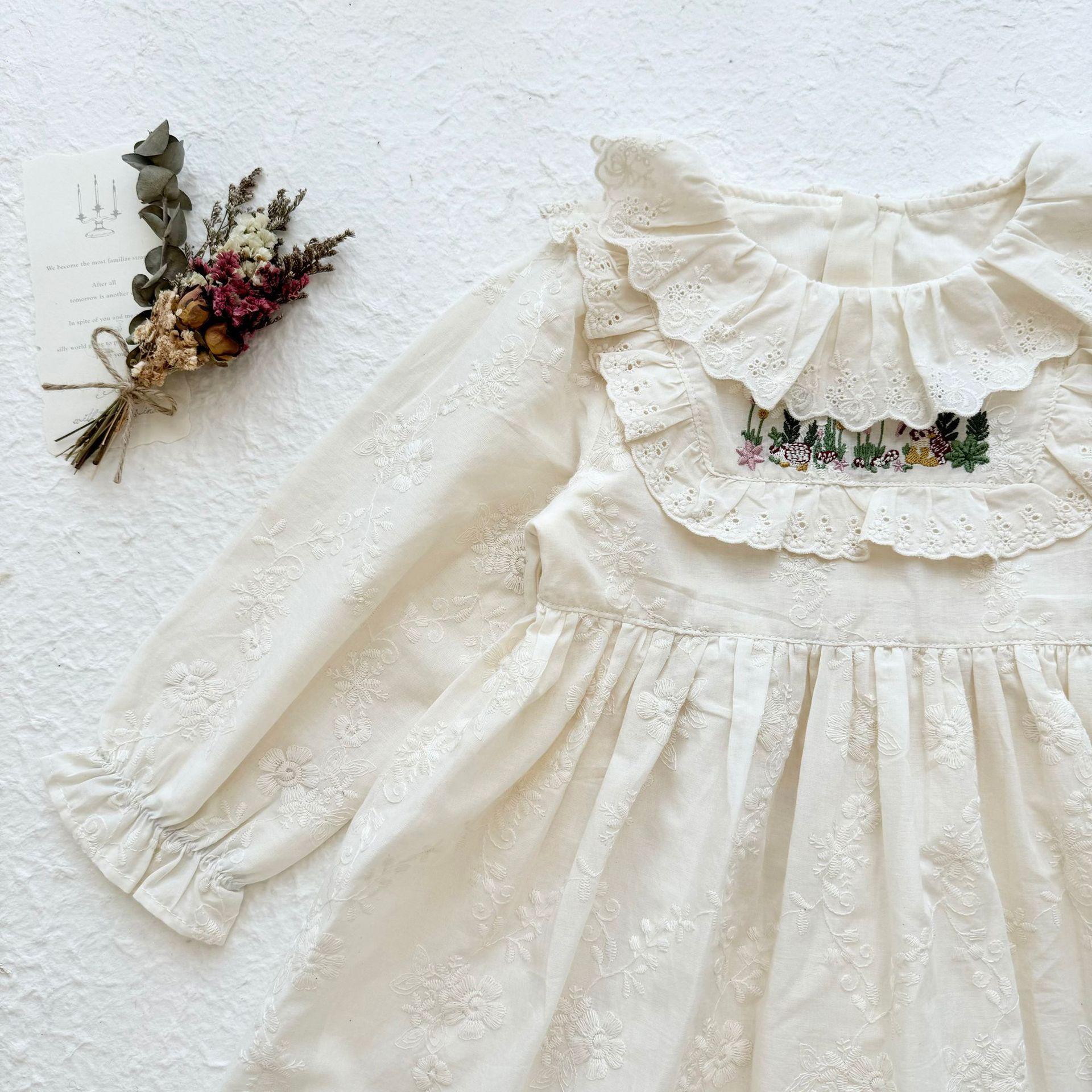 Vestido de Otoño para Niñas 2025 Nuevo Vestido Dulce de Encaje de Manga Larga con Cuello de Volantes Bordado