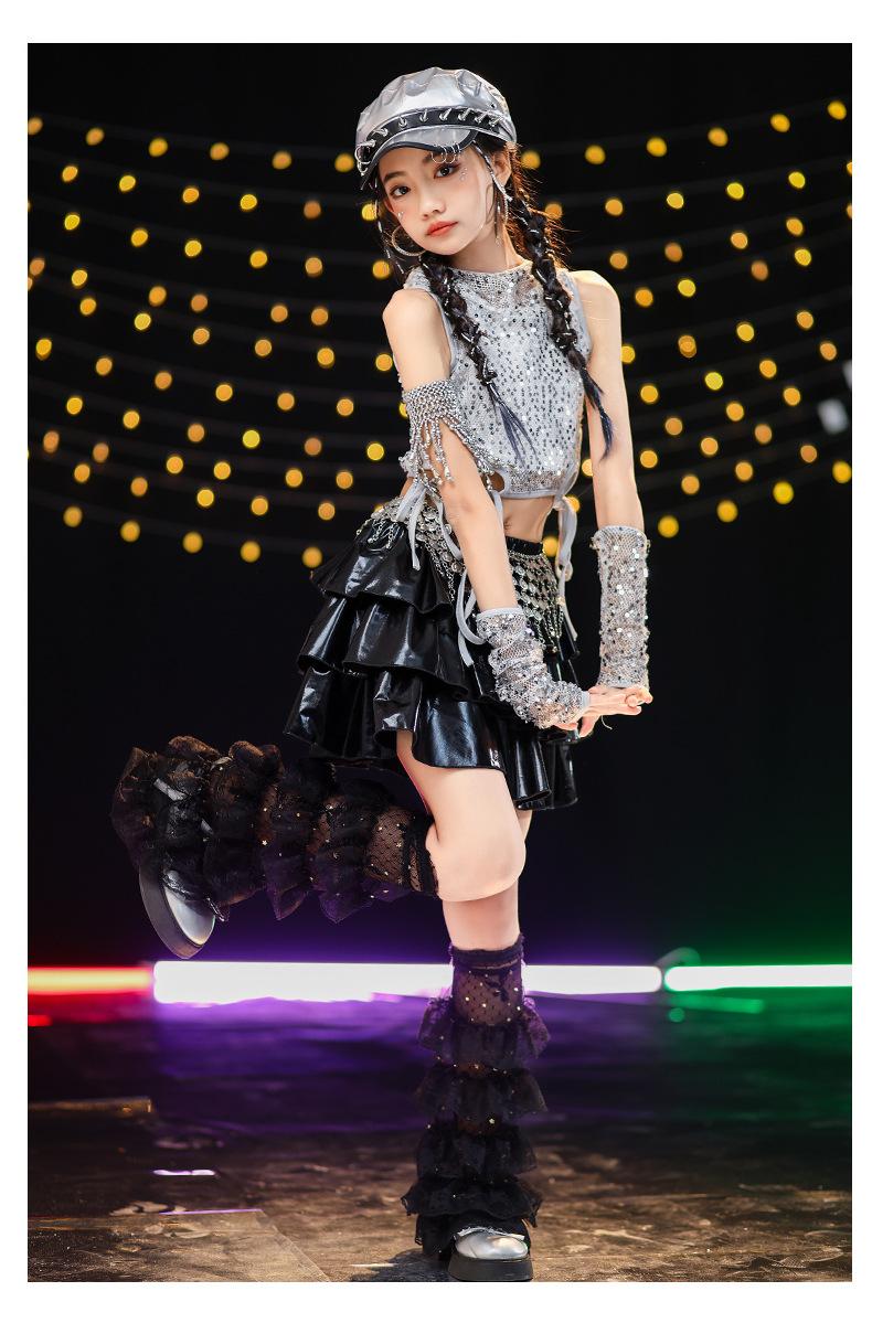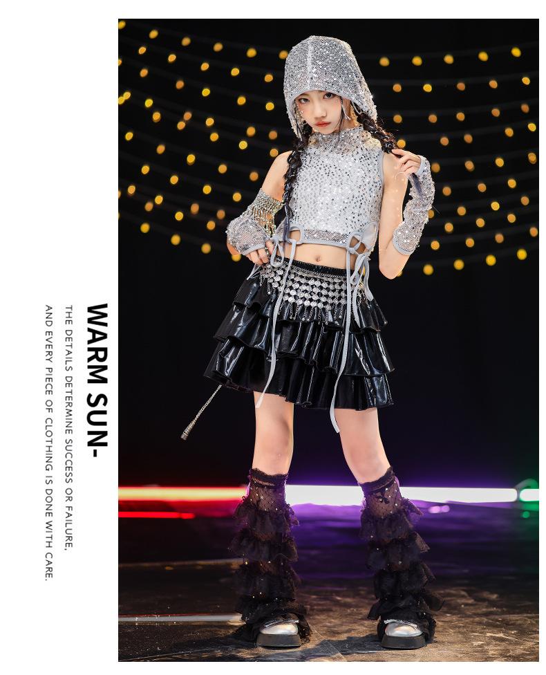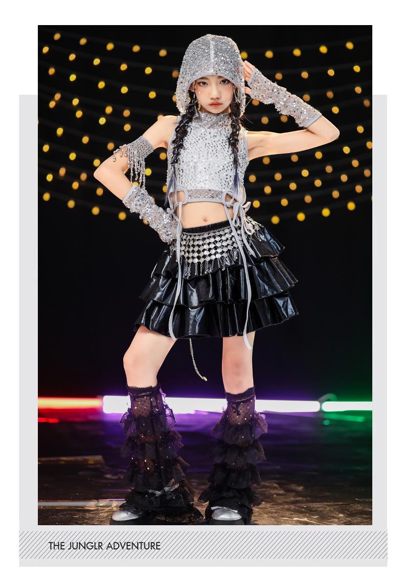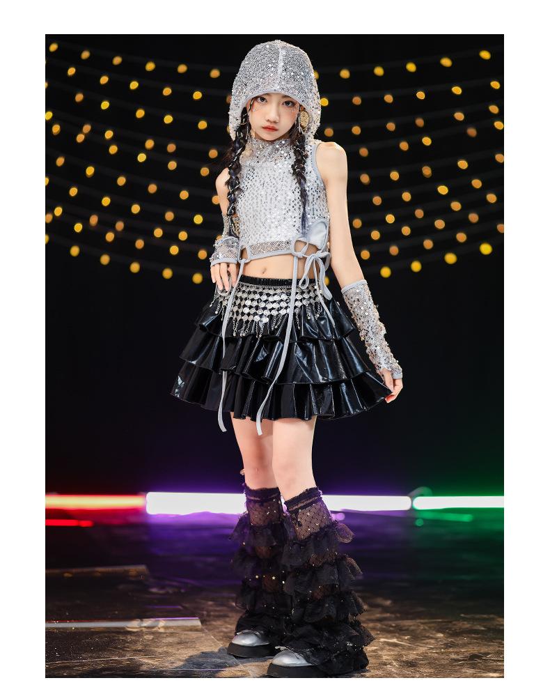 D49 silver sequin mesh hooded vest (with rhinestone silver sleeves) + 7156 black pleated skirt, D49 silver seq...