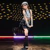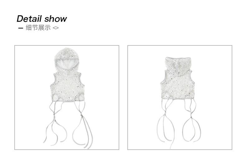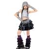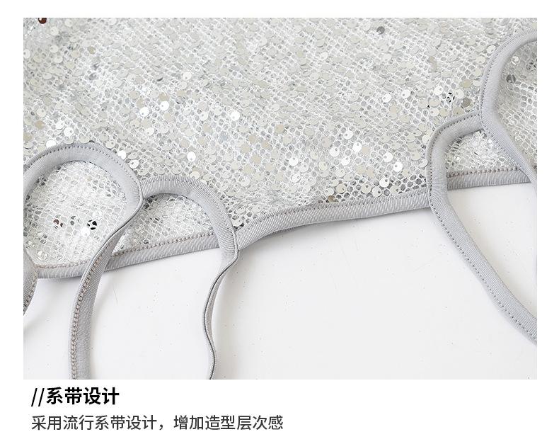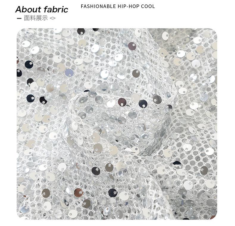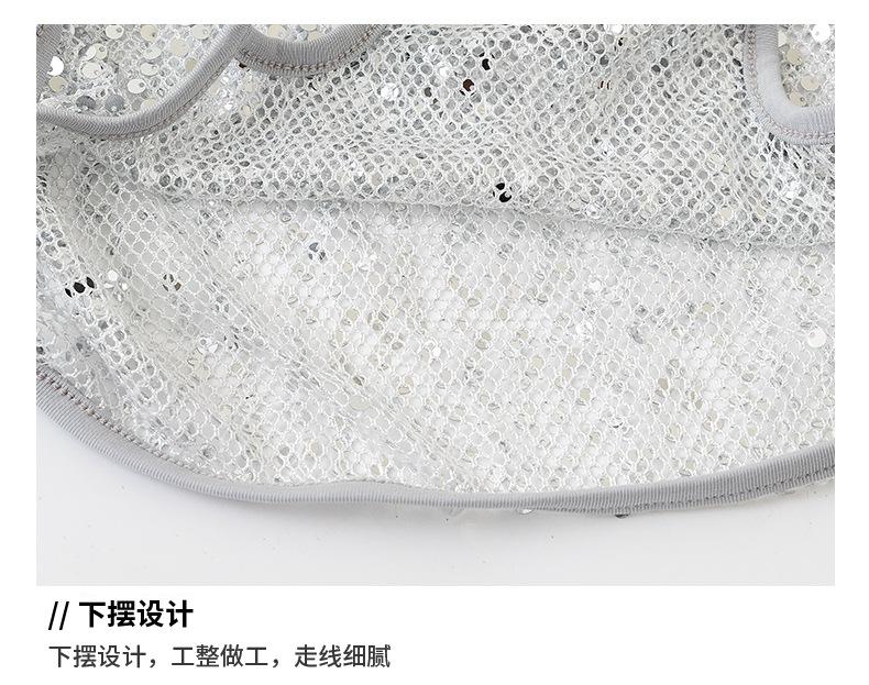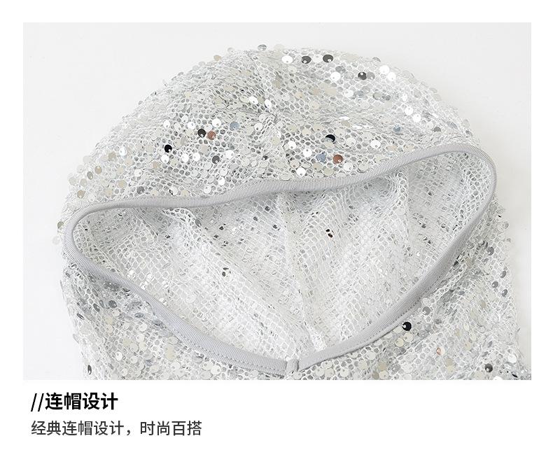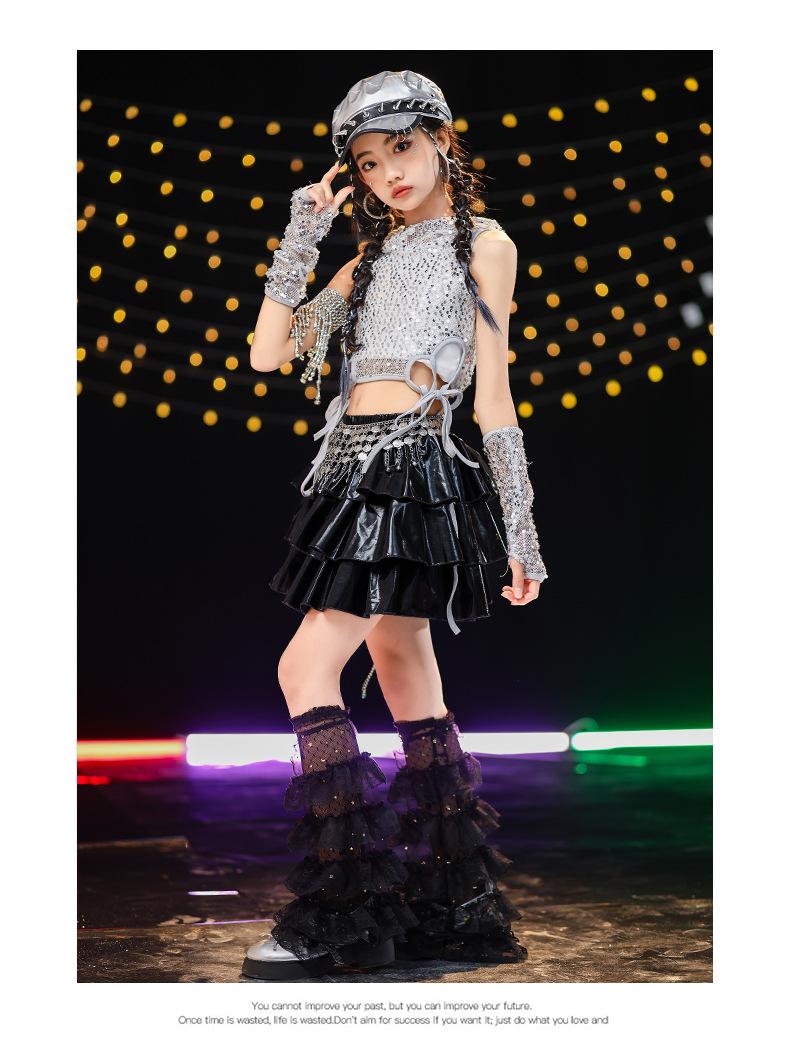 D49 silver sequin mesh hooded vest (with rhinestone silver sleeves) + 7156 black pleated skirt, D49 silver seq...