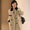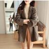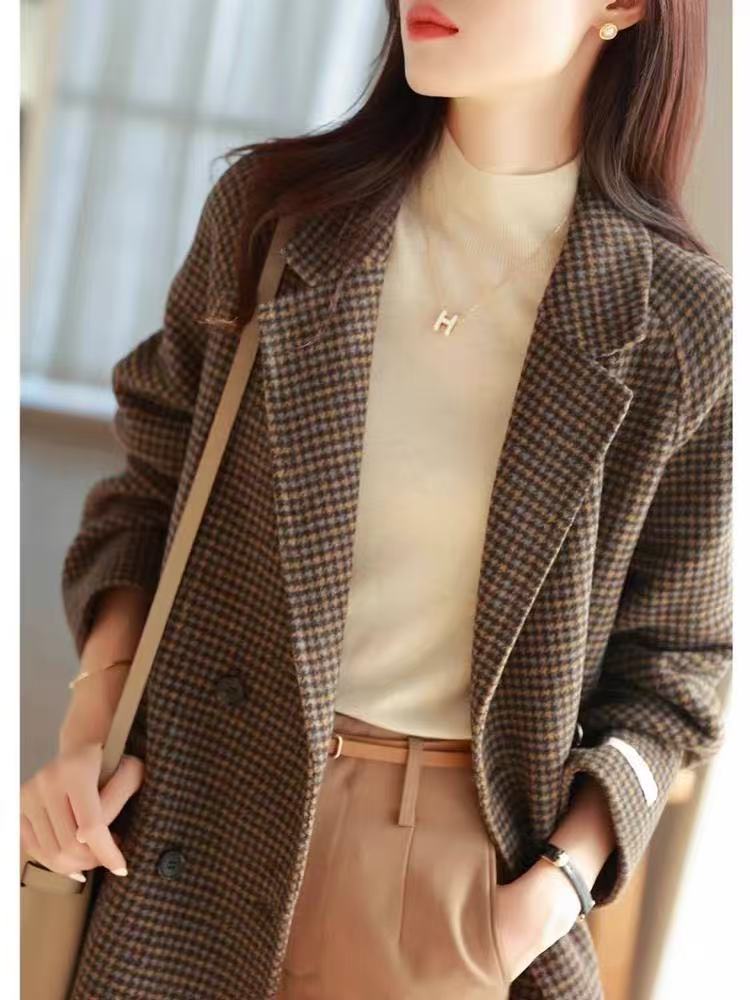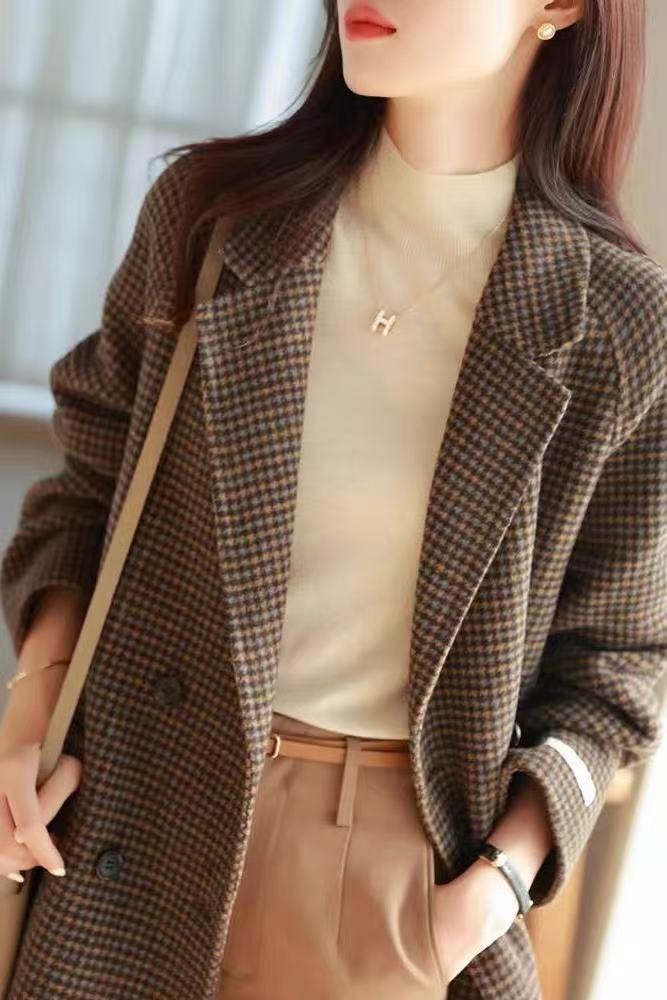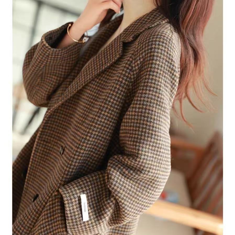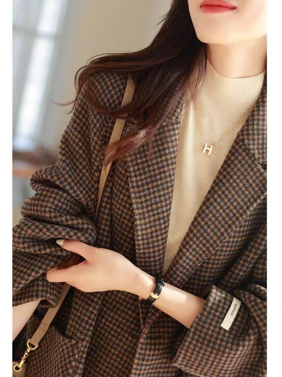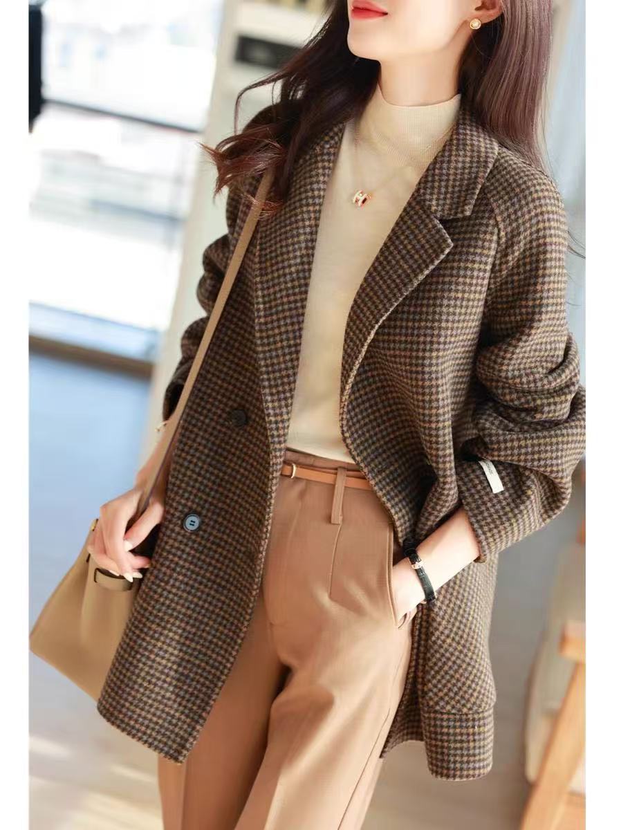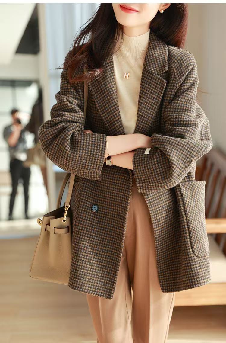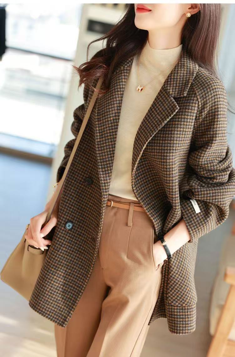 2025 Otoño/Invierno Nuevo Sentido Hecho a Mano Abrigo de Lana de Largo Medio Cuello de Traje Petite Lana Suelta Sobretodo de Cuadros para Mujer