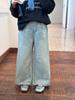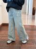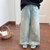 Aimo Beibei Jeans de Mezclilla de Algodón Slub Lavado con Bordado Exquisito de Alta Resistencia para Niñas, Lazo, Retro Desgastados, Pierna Recta, a la Moda