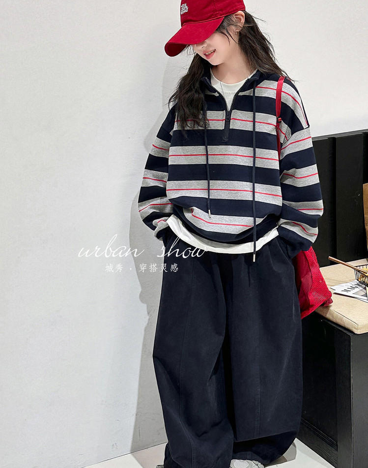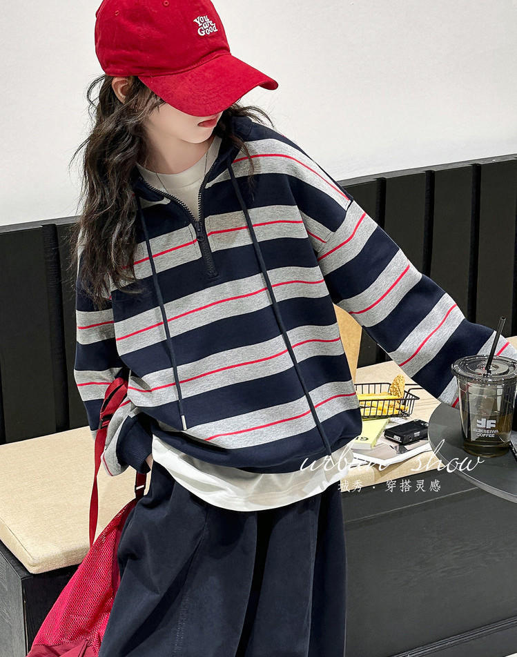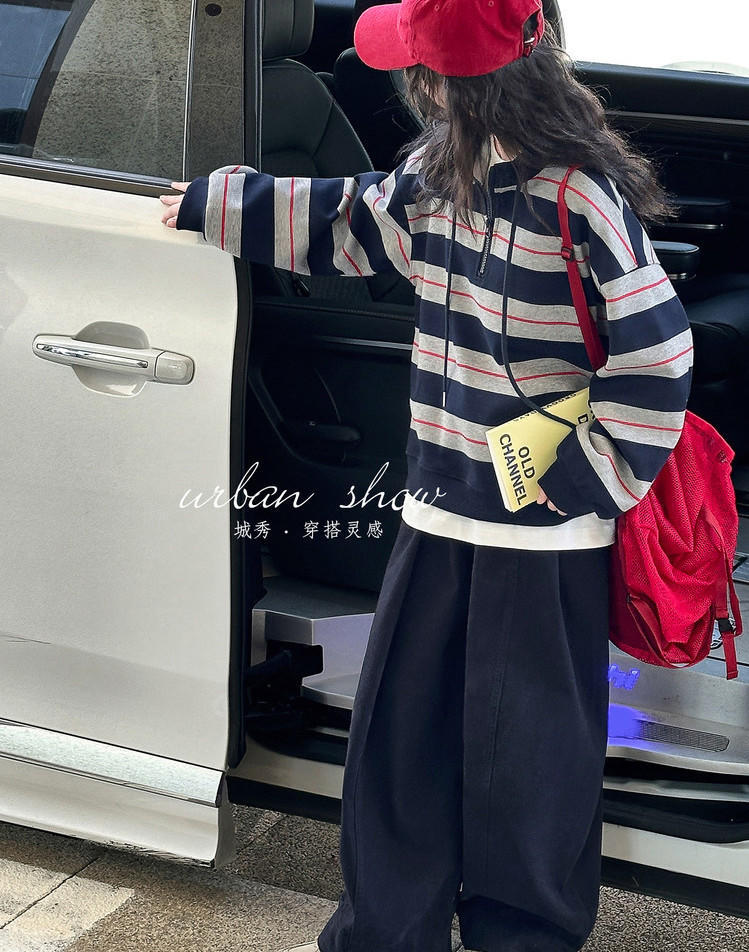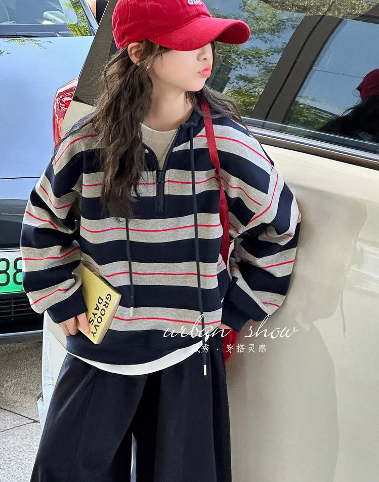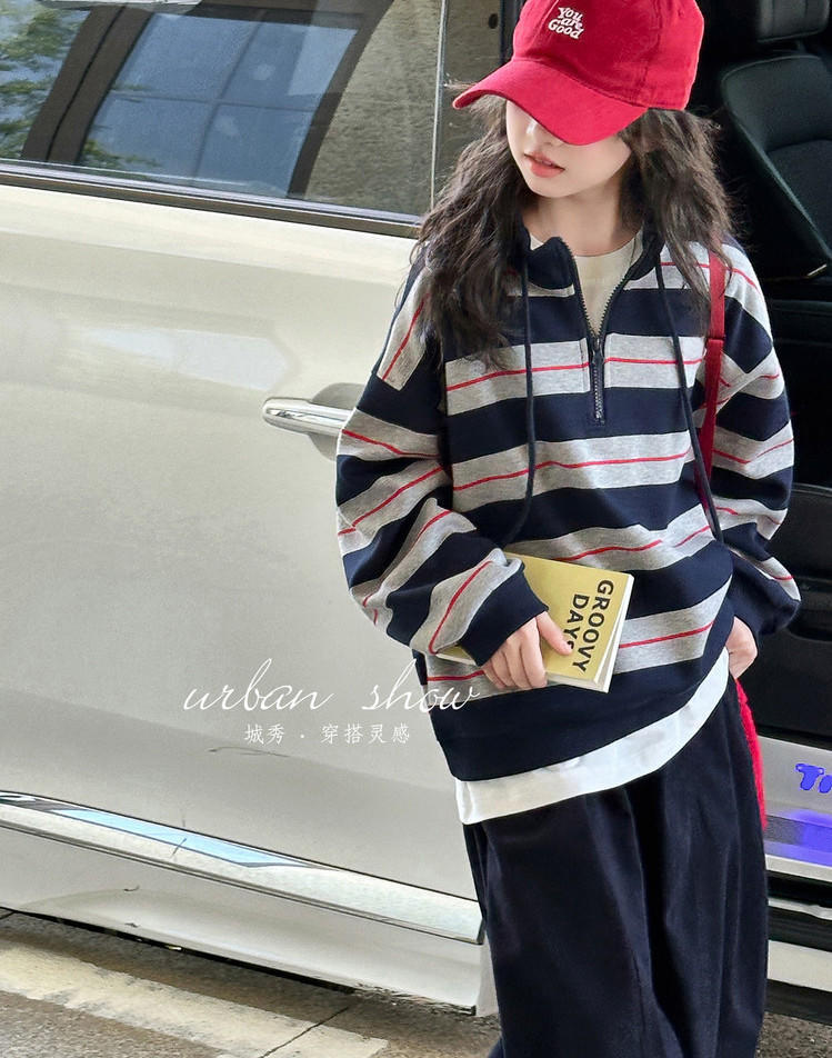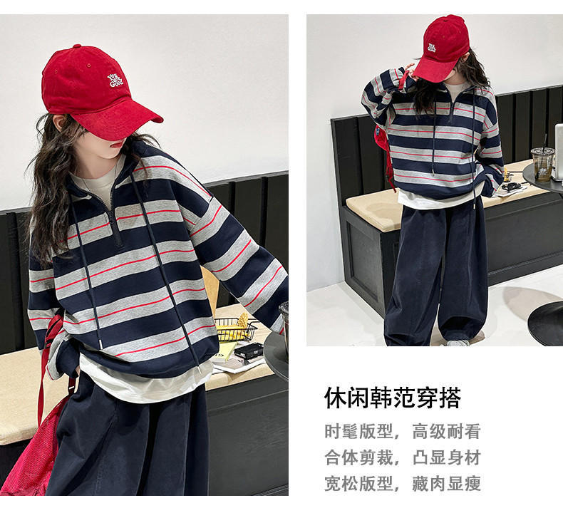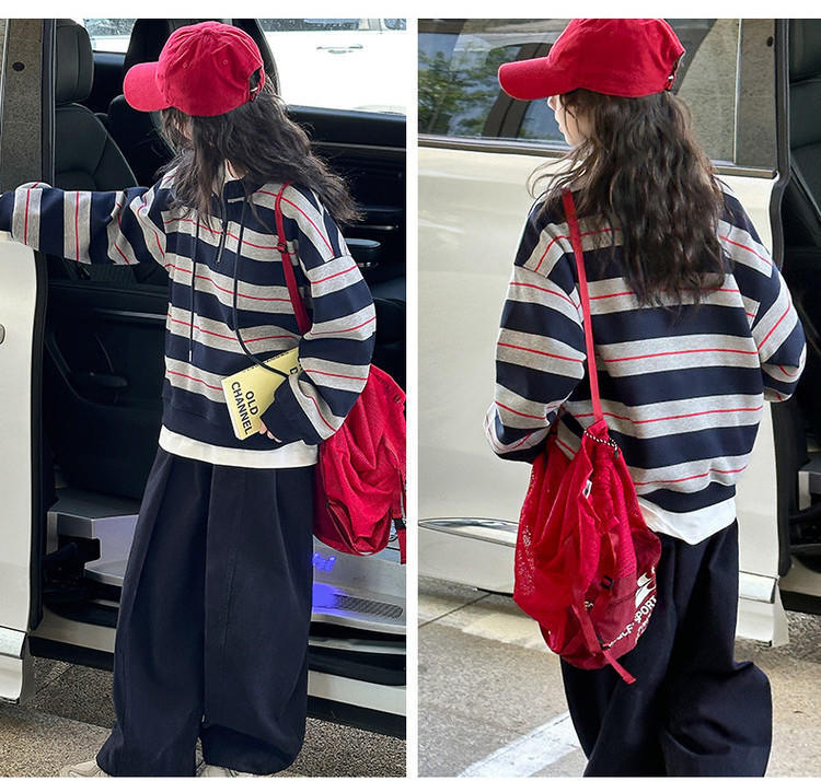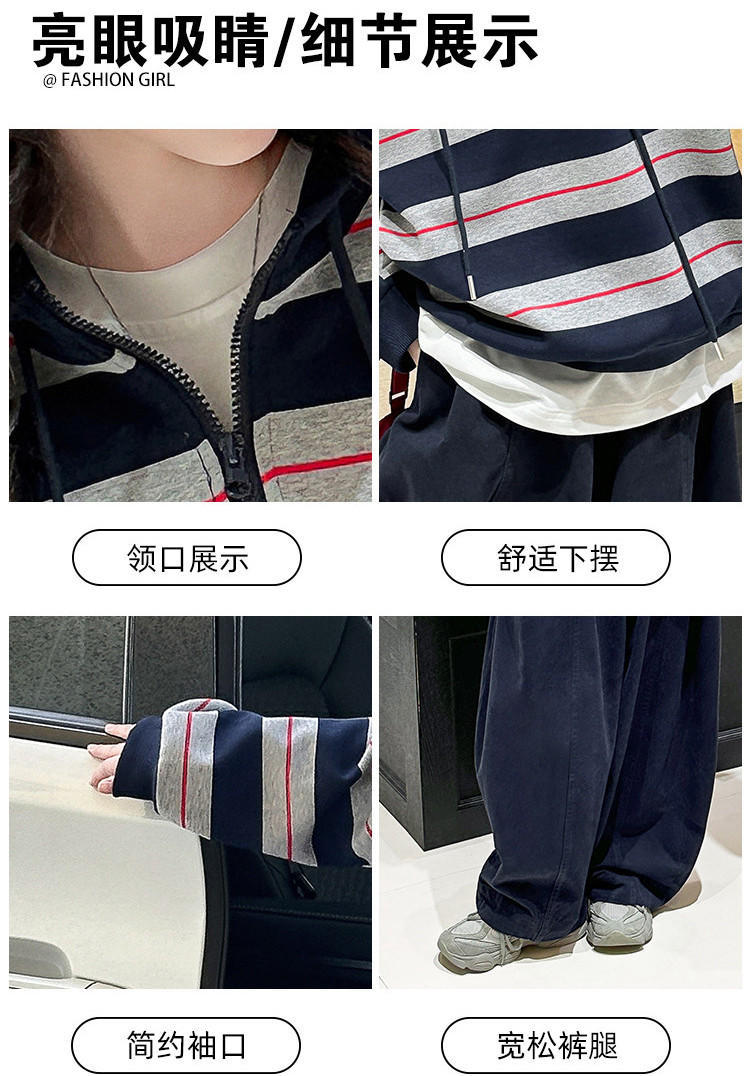 Conjunto Sudadera Simple Rayada Otoño Moda Niñas Top Versátil Casual con Capucha Estilo Coreano ins Estilo Perezoso