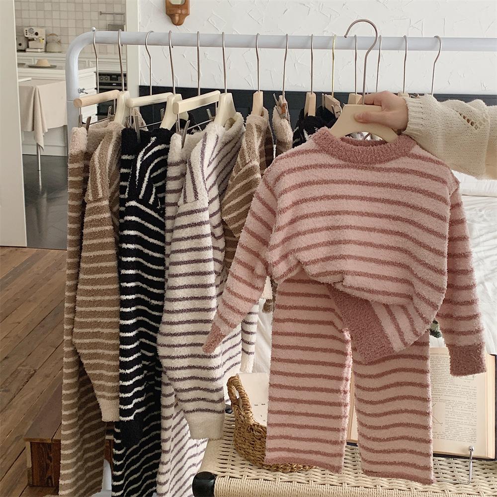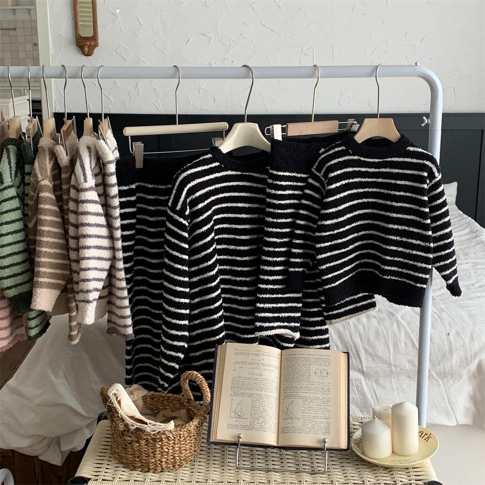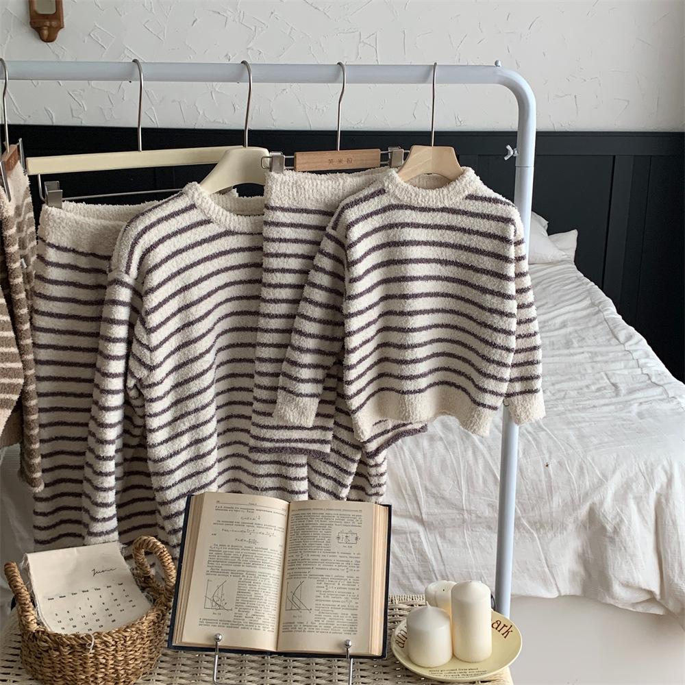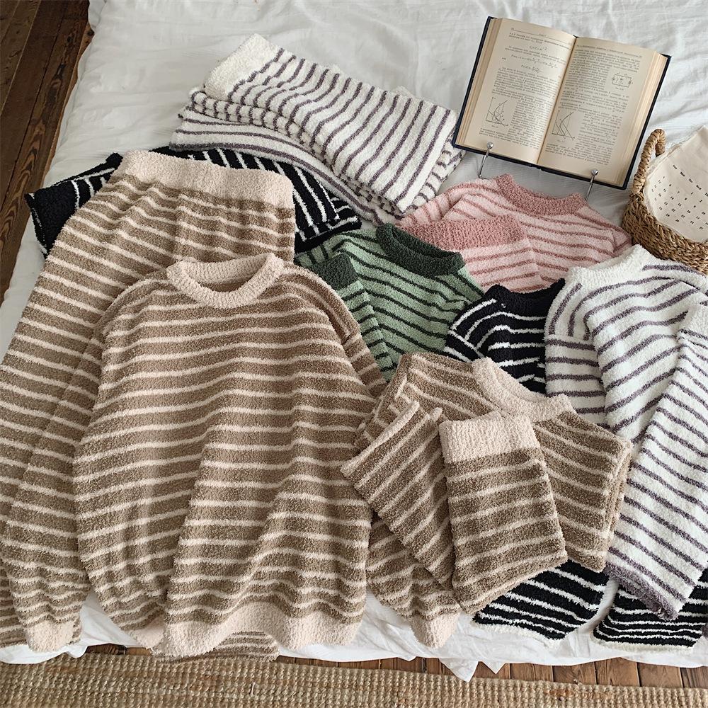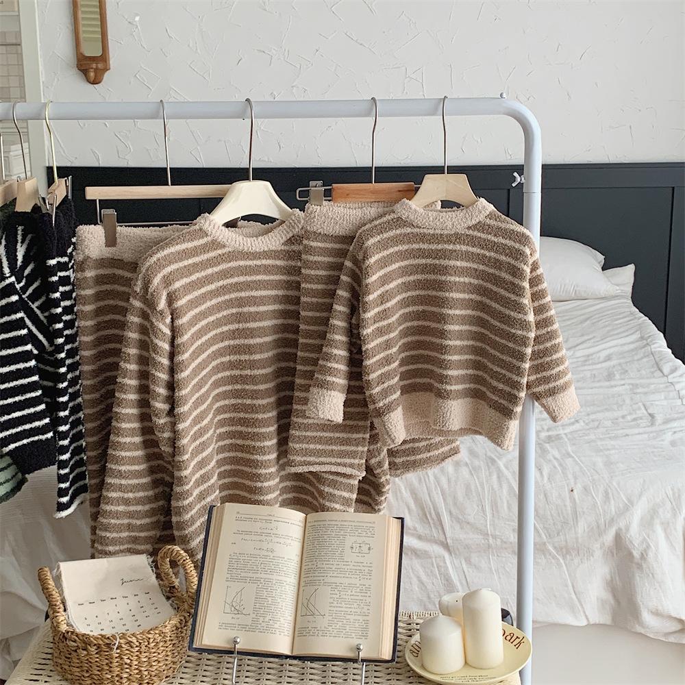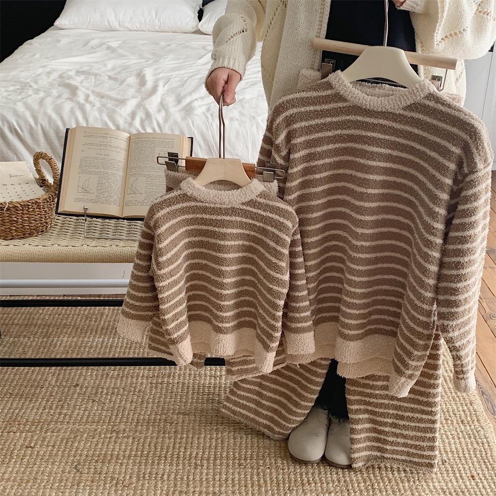 Montaigne Ropa de Casa de Forro Polar Nube al Tacto para Padres e Hijos Otoño e Invierno Nuevo Rayado Forro Polar de Media Cara Niños y Niñas Conjunto de Pijama Cálido y Agradable para la Piel