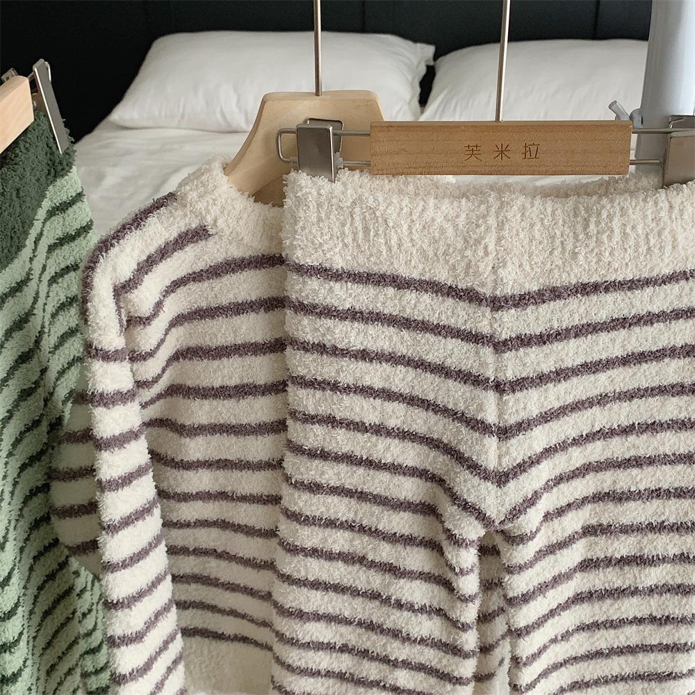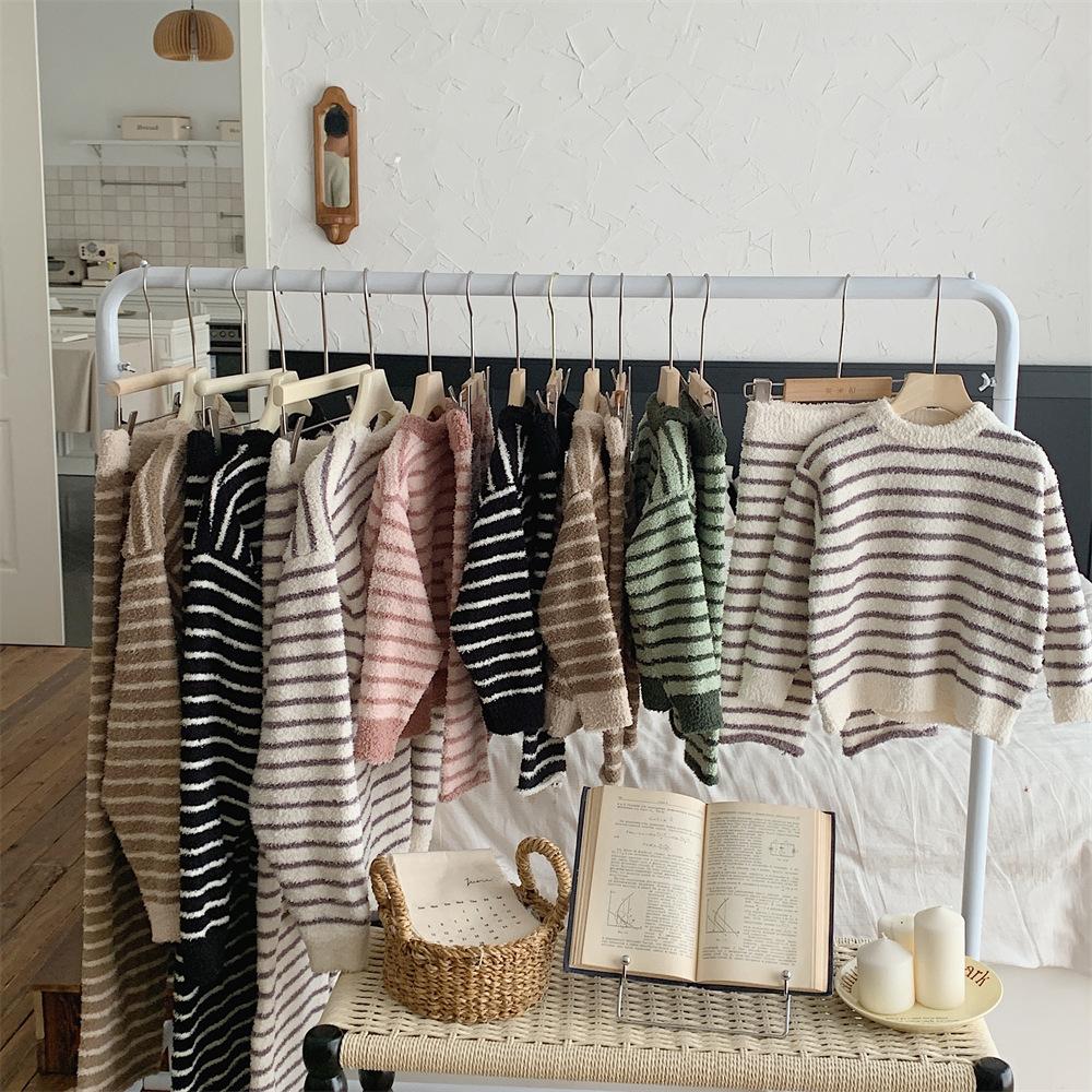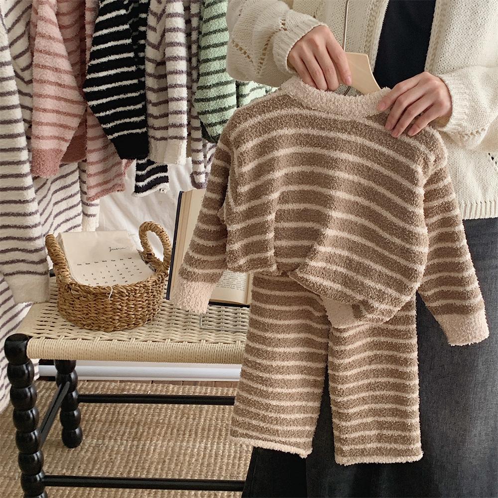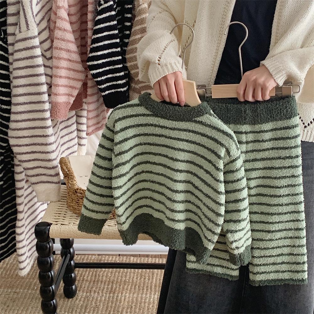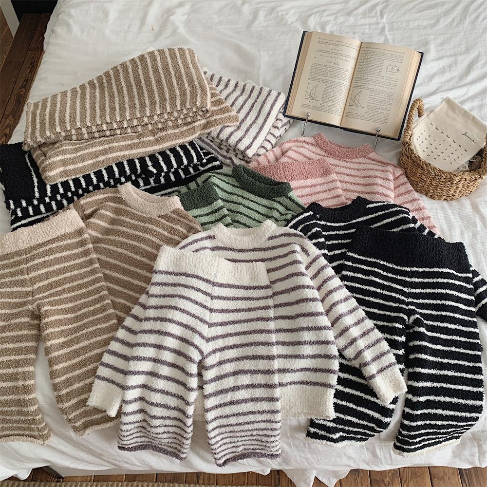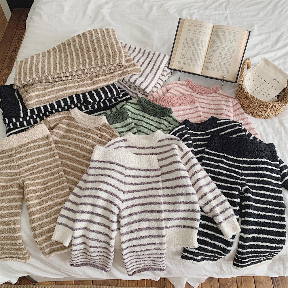 Montaigne Ropa de Casa de Forro Polar Nube al Tacto para Padres e Hijos Otoño e Invierno Nuevo Rayado Forro Polar de Media Cara Niños y Niñas Conjunto de Pijama Cálido y Agradable para la Piel