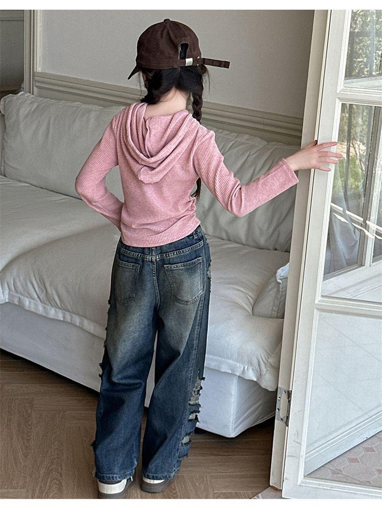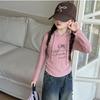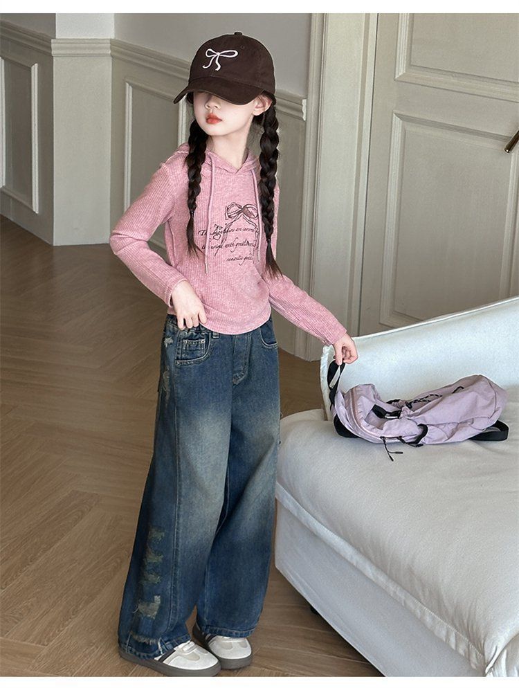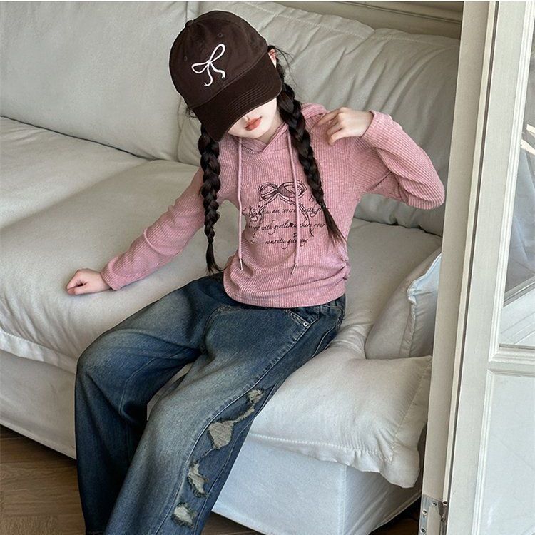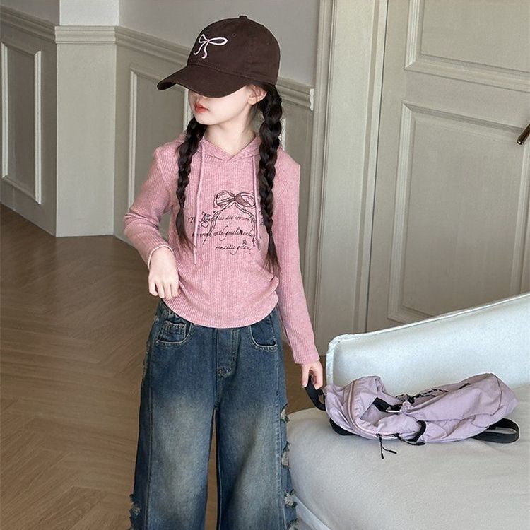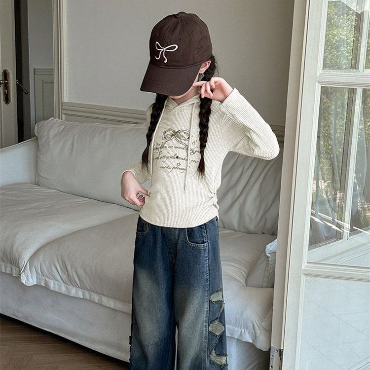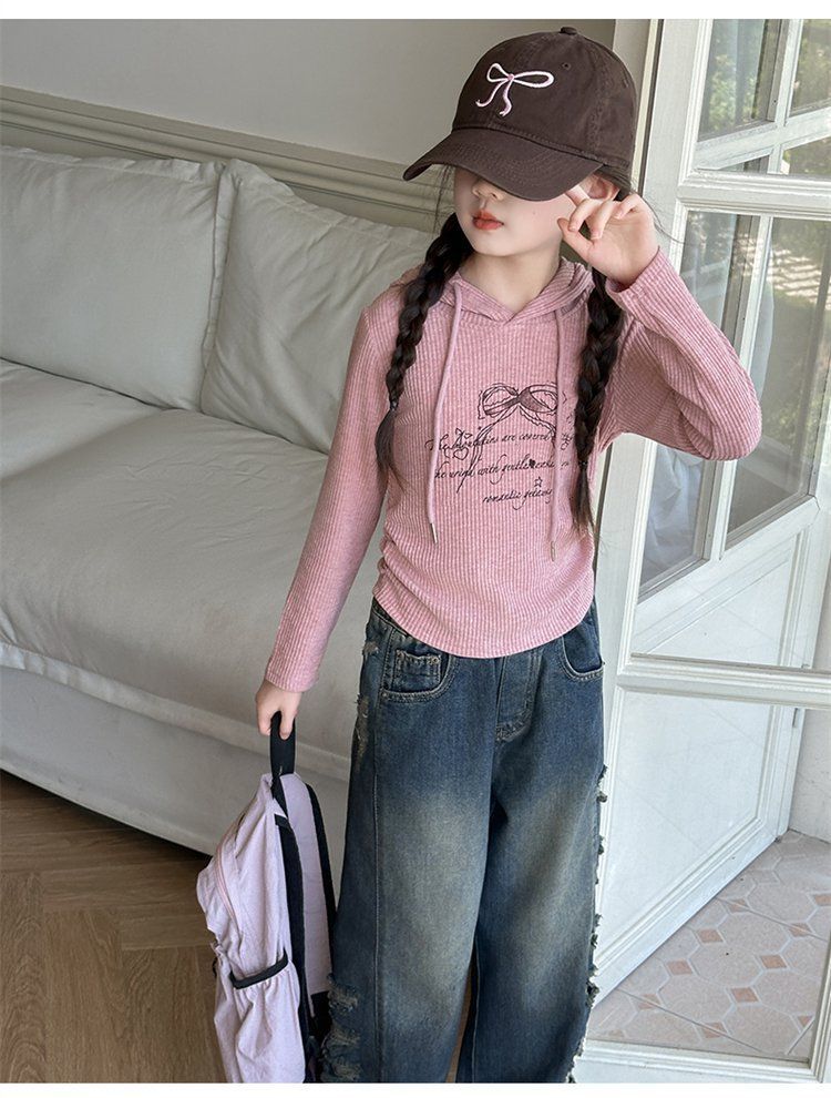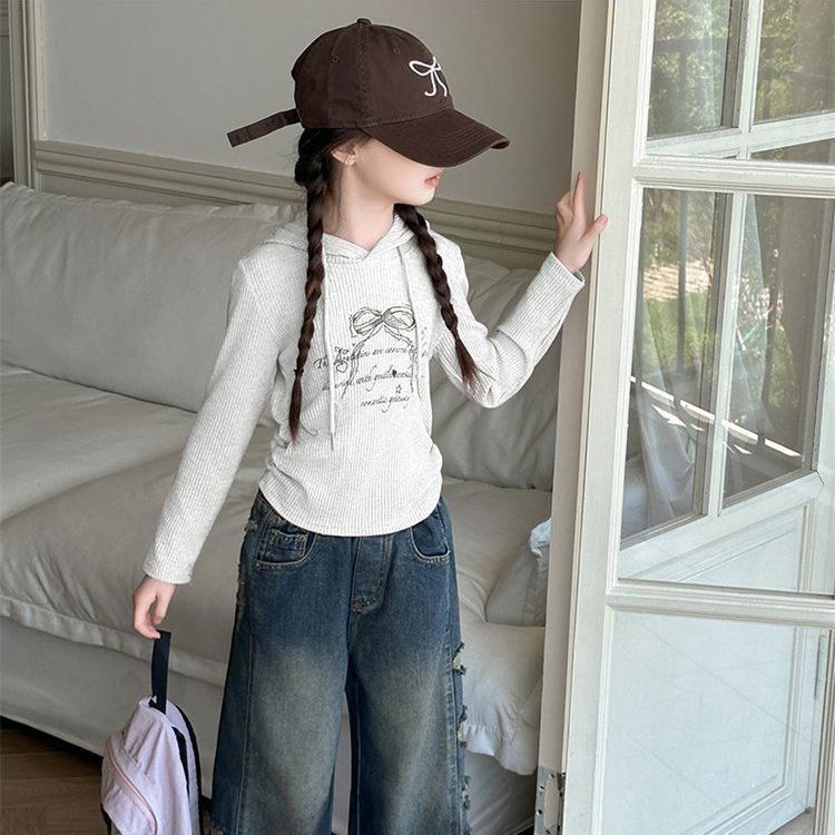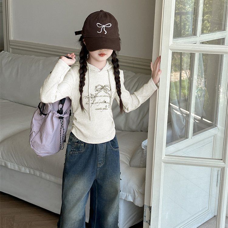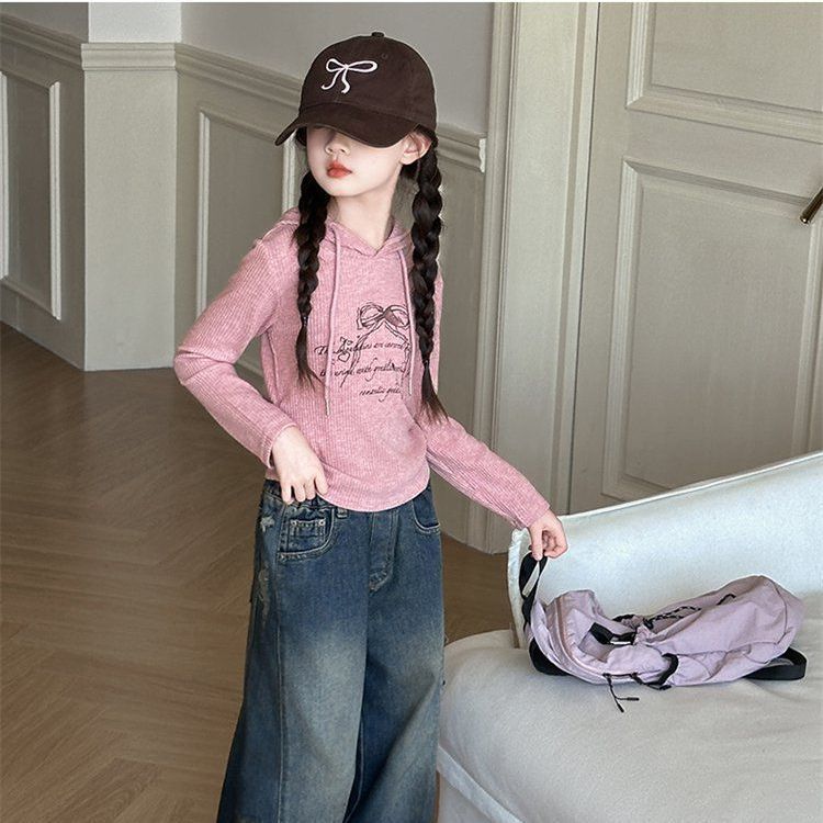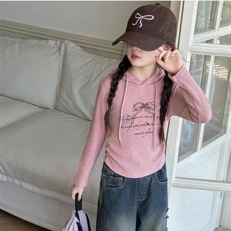 Primavera y Otoño Nuevo Estilo Camiseta Base para Niñas Top con Capucha Estampado de Moda Camiseta Corta Ajustada para Niños Sudadera de Manga Larga Trendy
