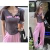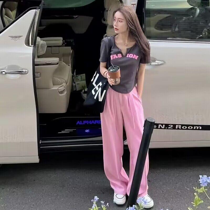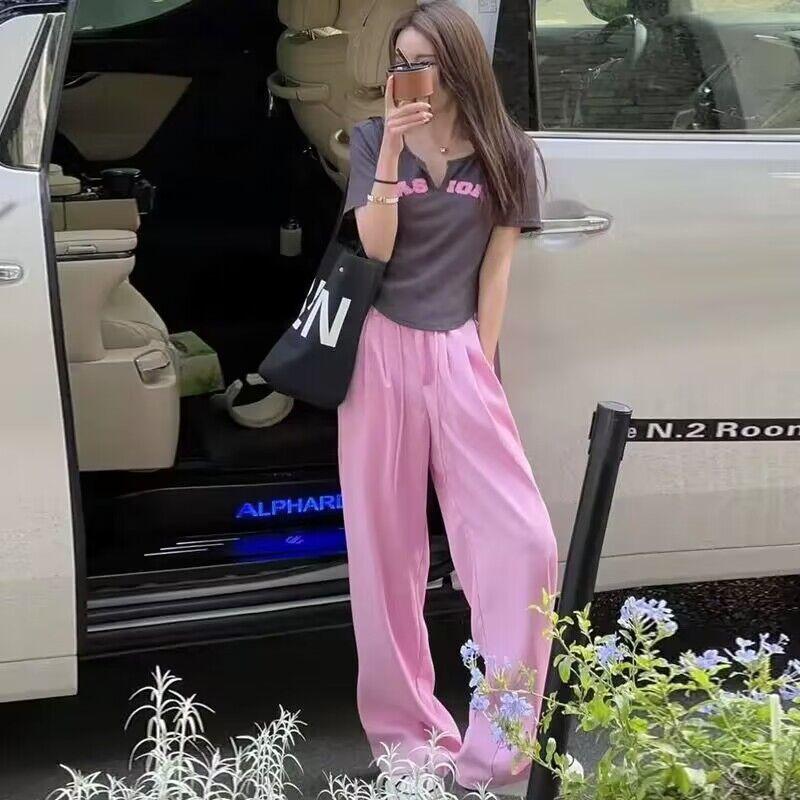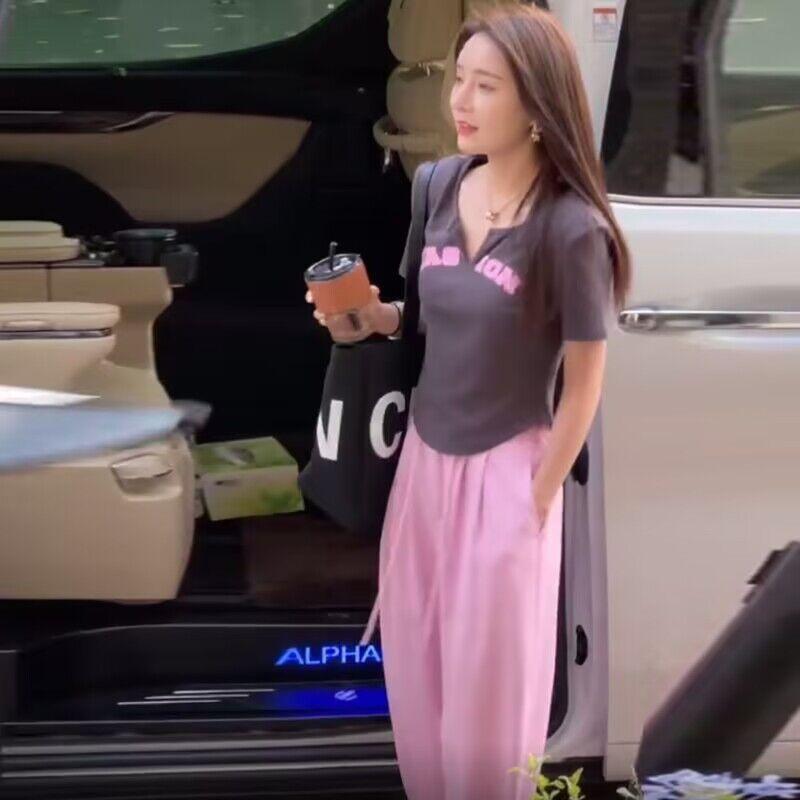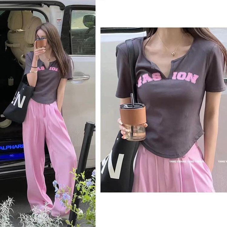 248 # Traje de Celebridad de Internet Verano Nuevo Dulce Sexy Asimétrico Camiseta de Manga Corta + Pantalones Casuales Pantalones de Pierna Ancha Conjunto de Dos Piezas para Mujer