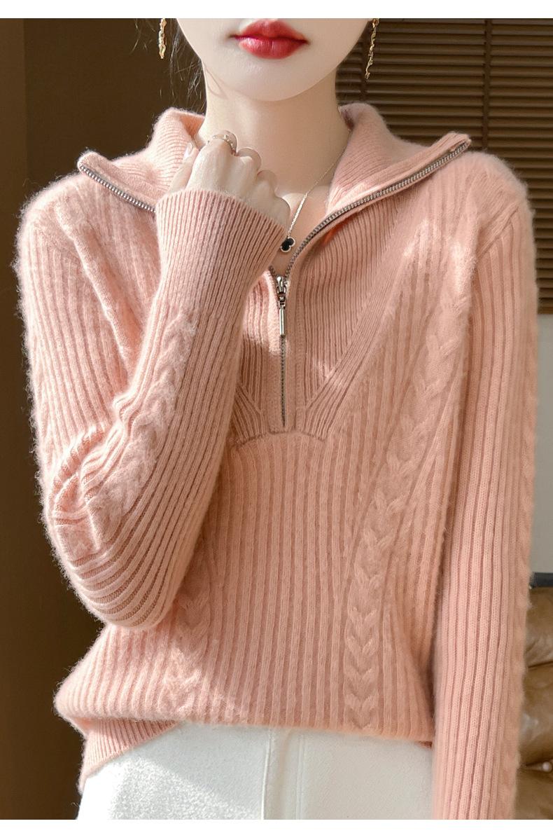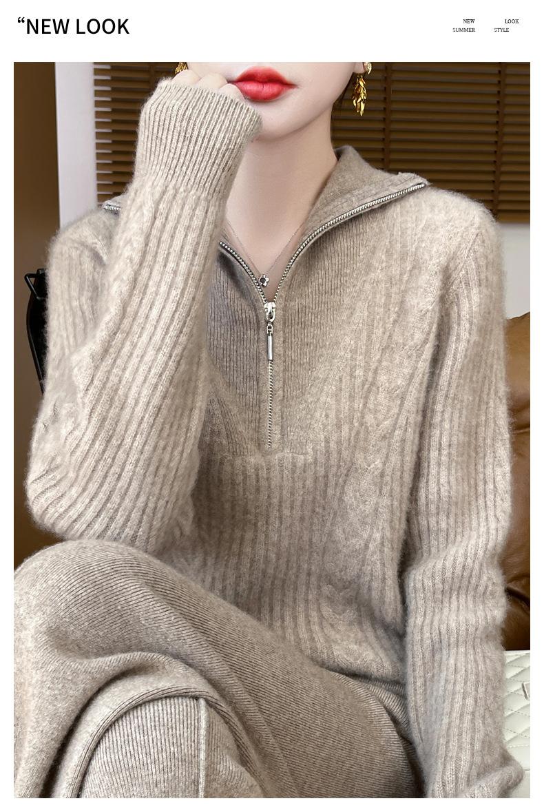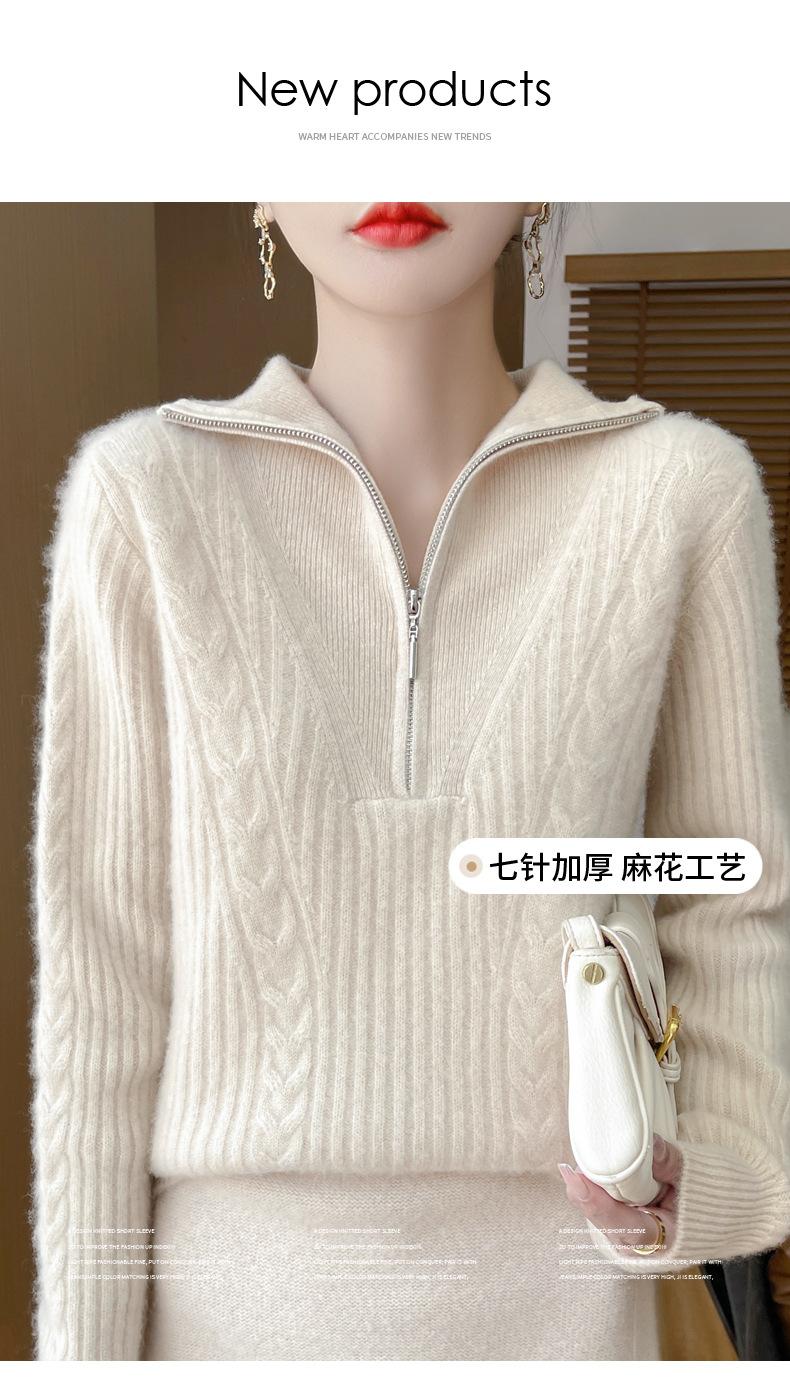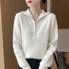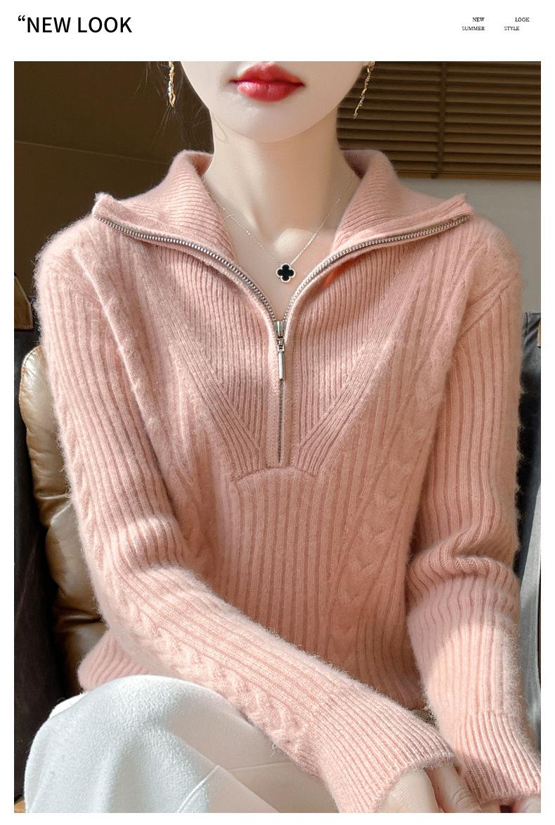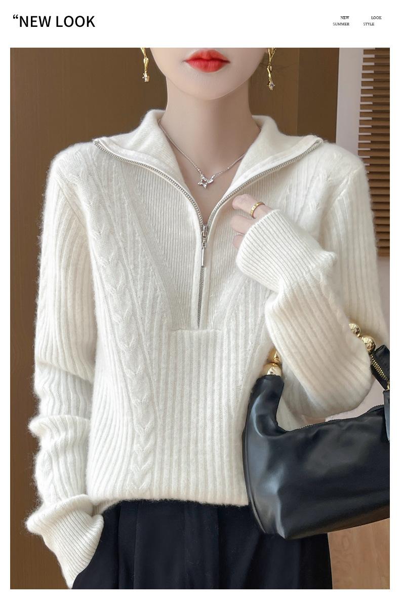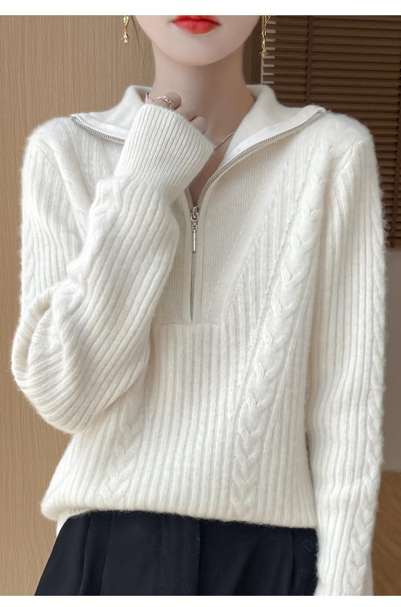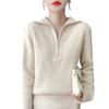 Nuevo Otoño/Invierno para Mujer Diseño Holgado Lana Pura Solapa Media Cremallera Top Suéter Tejido de Cable