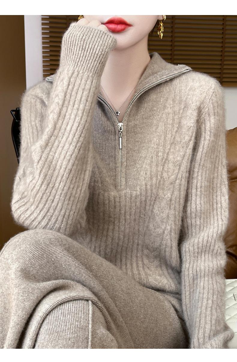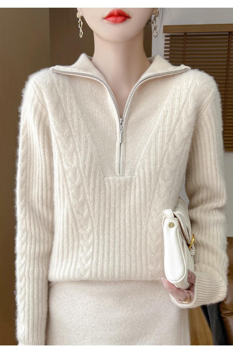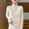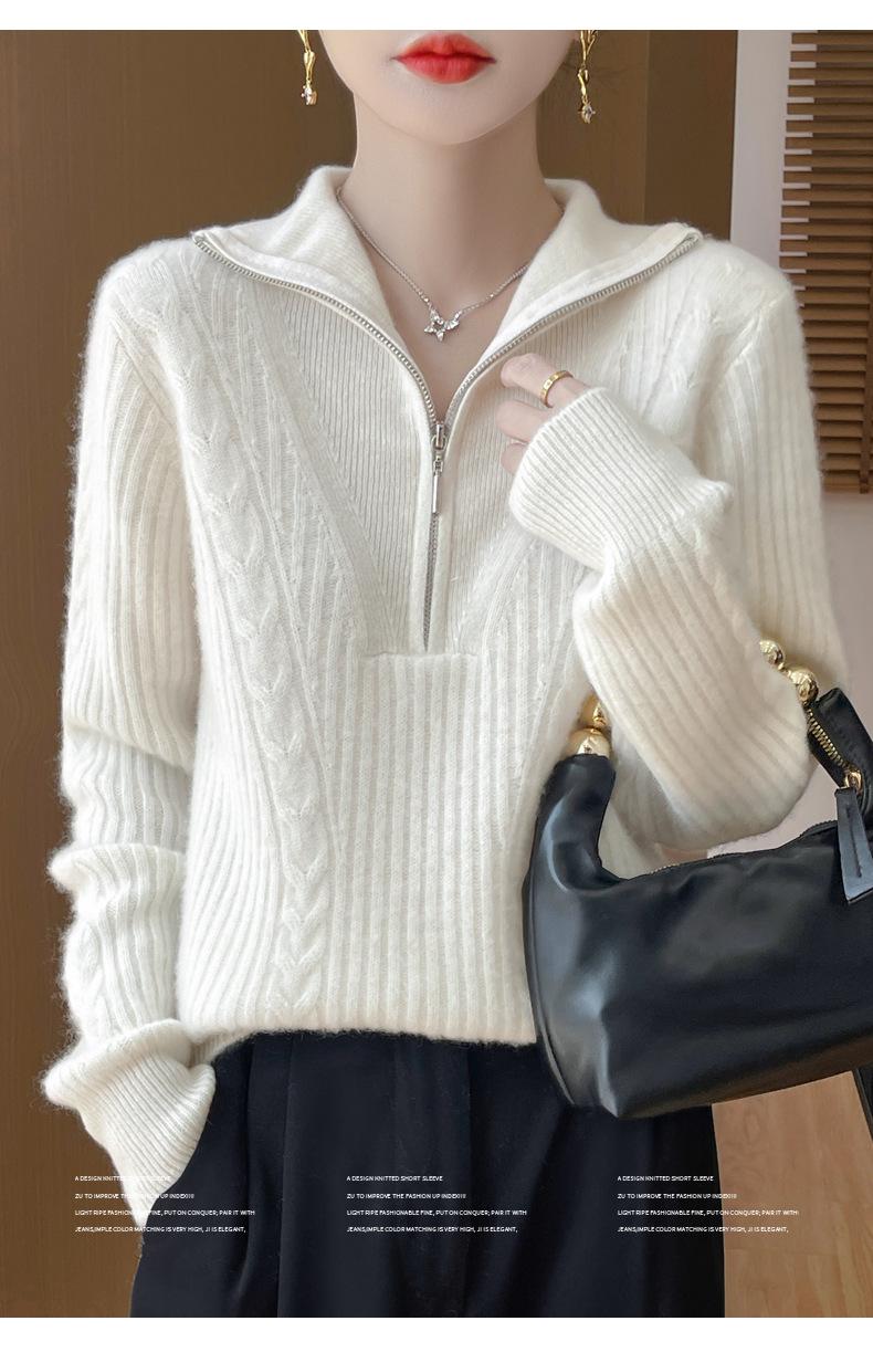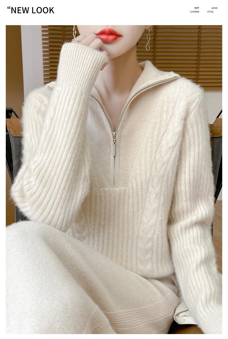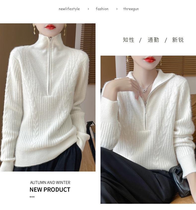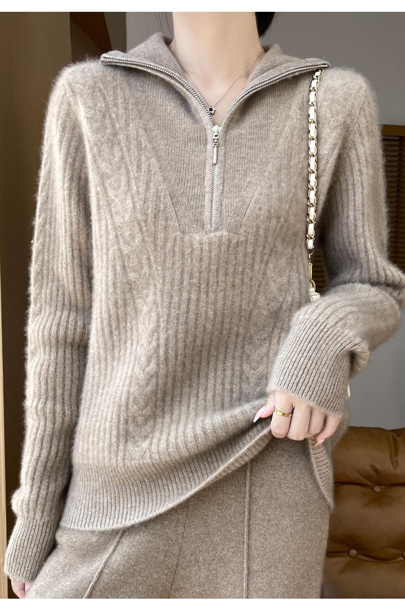 Nuevo Otoño/Invierno para Mujer Diseño Holgado Lana Pura Solapa Media Cremallera Top Suéter Tejido de Cable