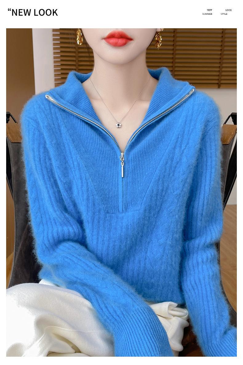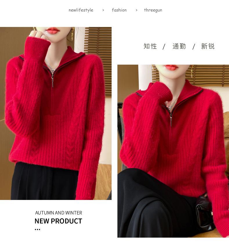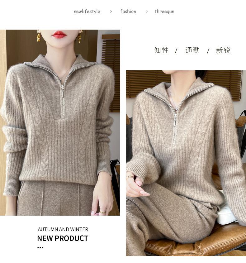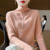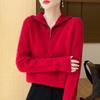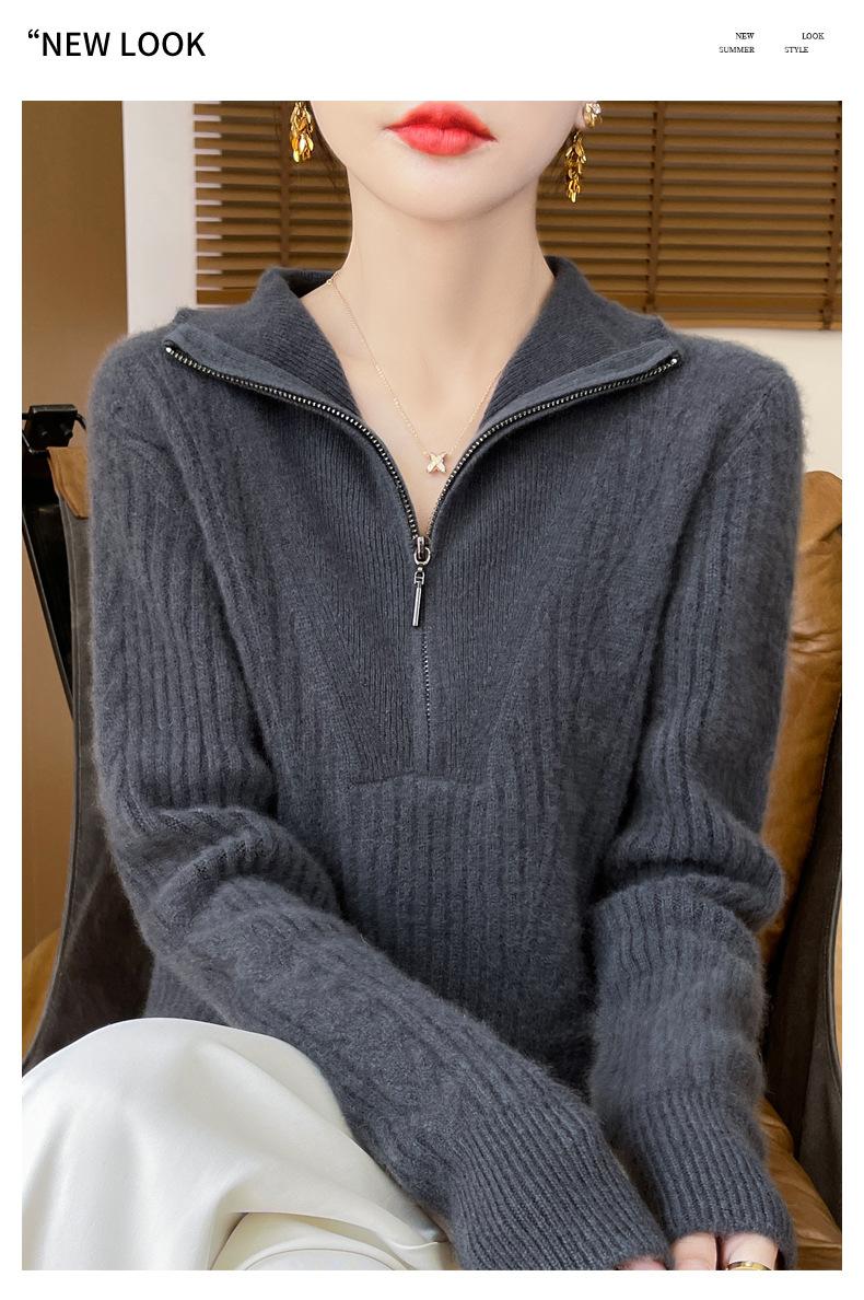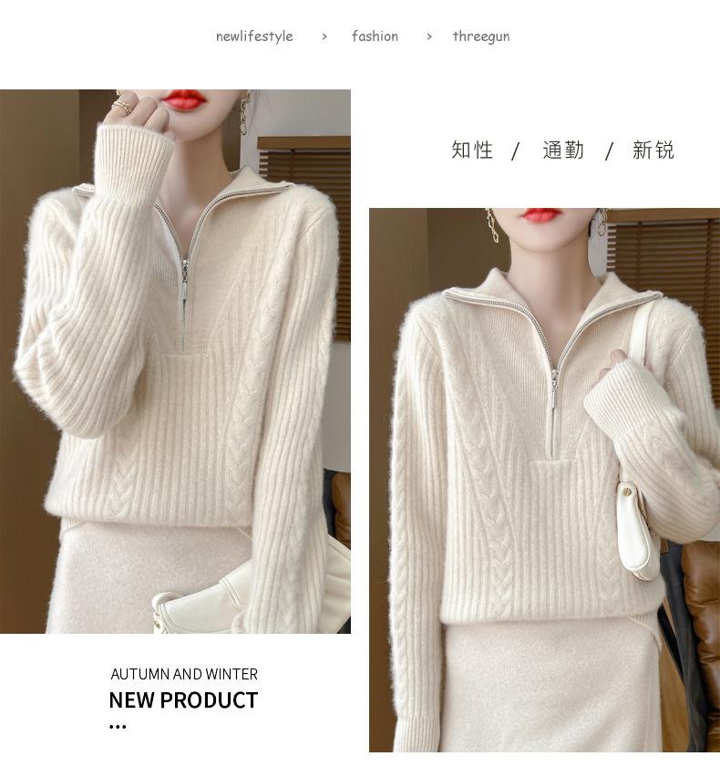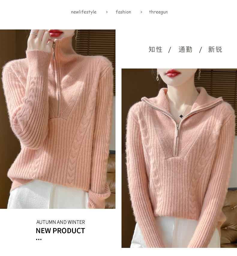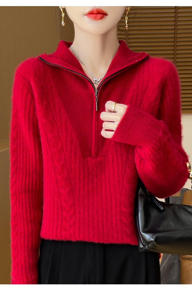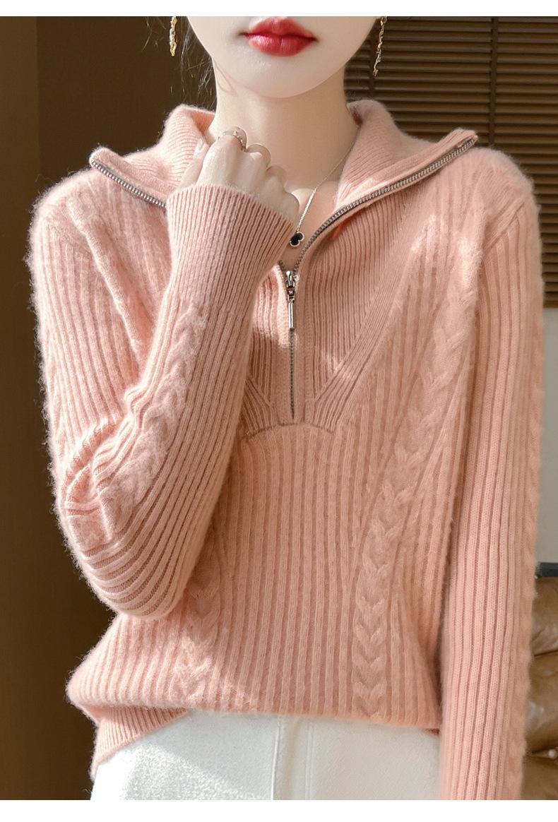 Nuevo Otoño/Invierno para Mujer Diseño Holgado Lana Pura Solapa Media Cremallera Top Suéter Tejido de Cable