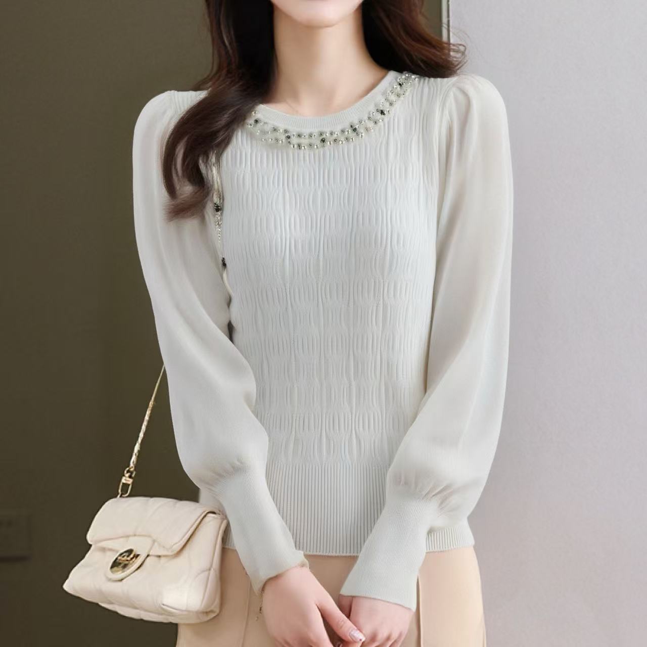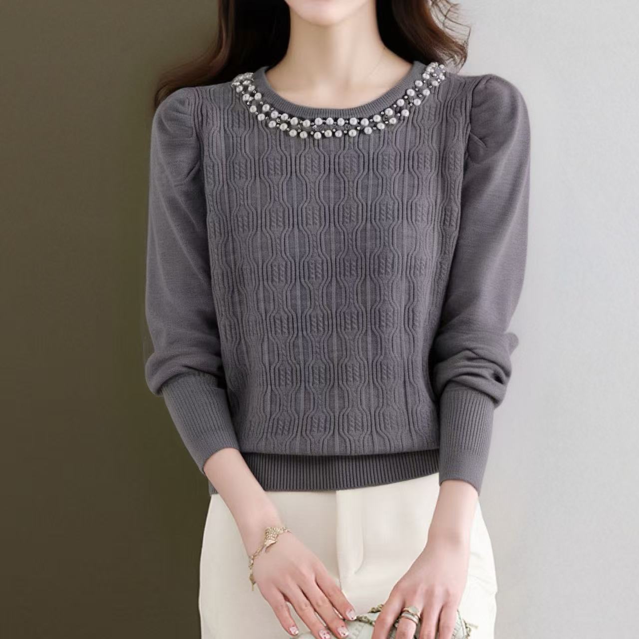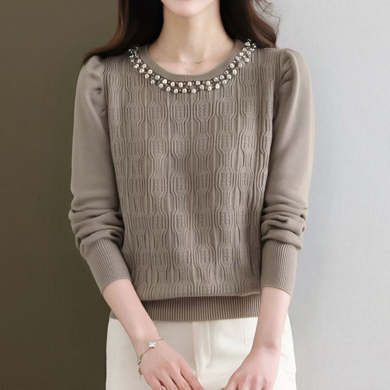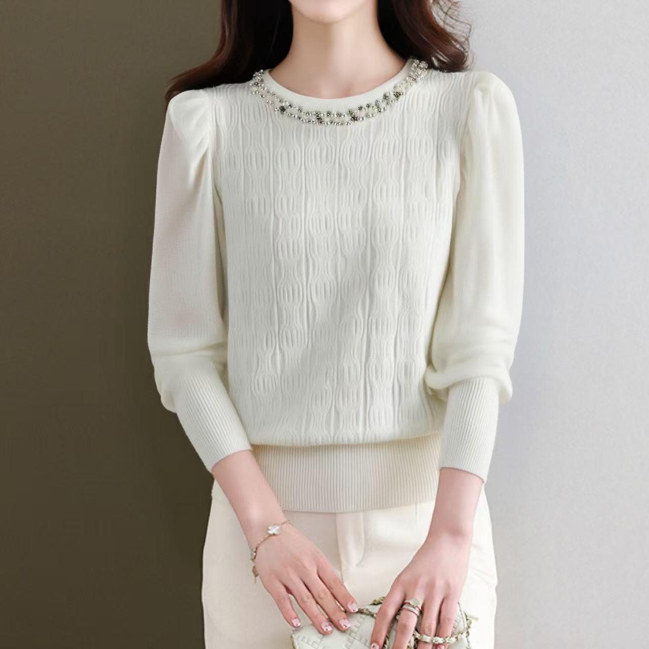 Suéter Tejido de Cuello Redondo con Cuentas Manga Abullonada Primavera Otoño Nueva Moda Versátil Adelgazante Ropa Exterior Top Base para Mujer