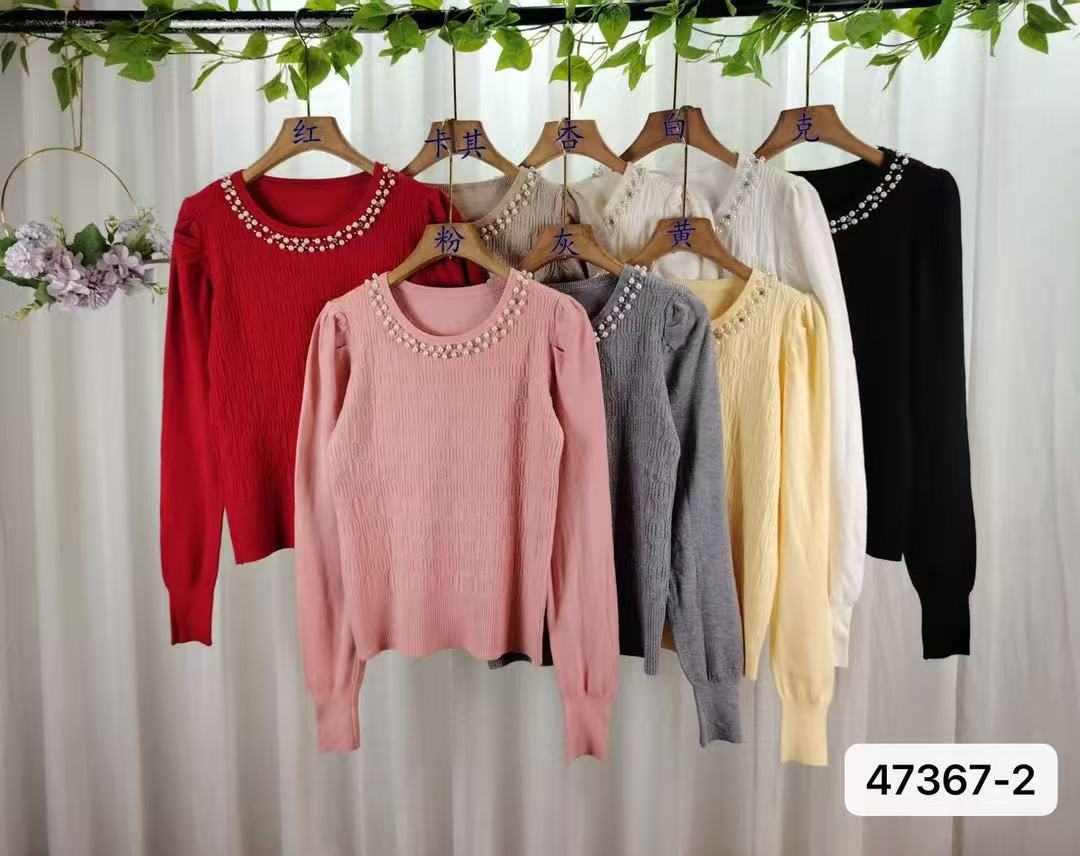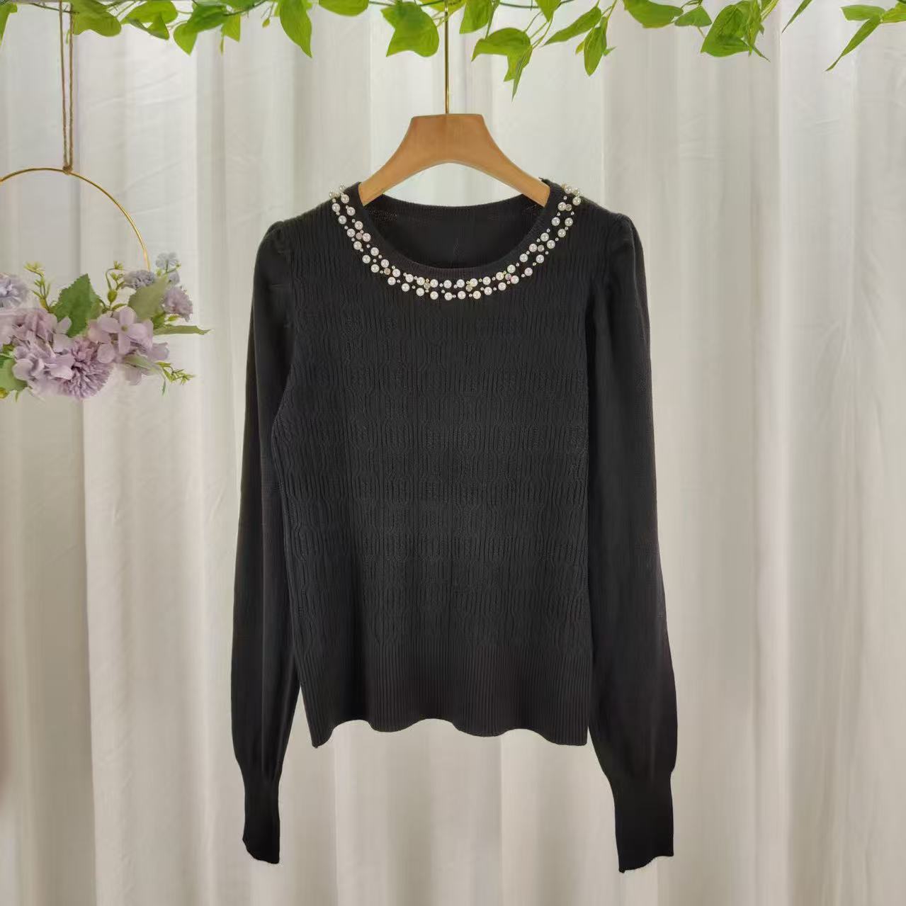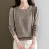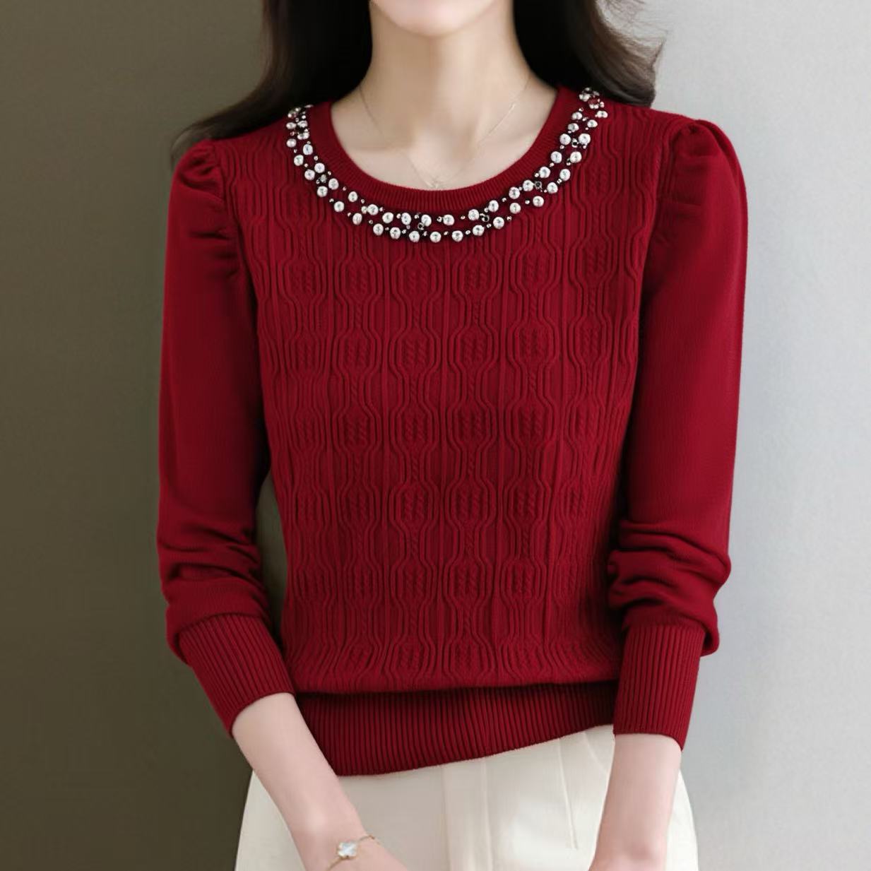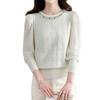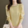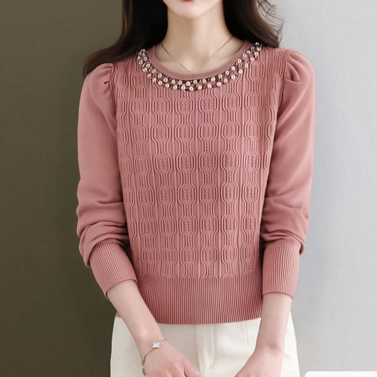 Suéter Tejido de Cuello Redondo con Cuentas Manga Abullonada Primavera Otoño Nueva Moda Versátil Adelgazante Ropa Exterior Top Base para Mujer