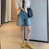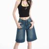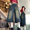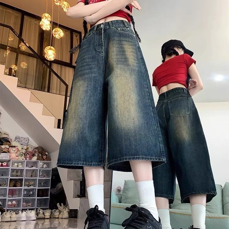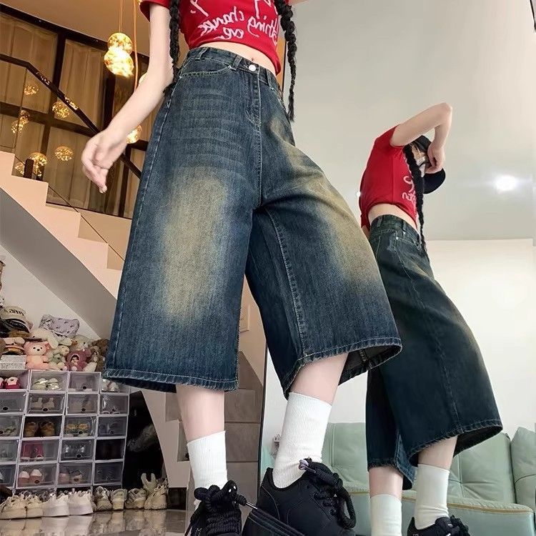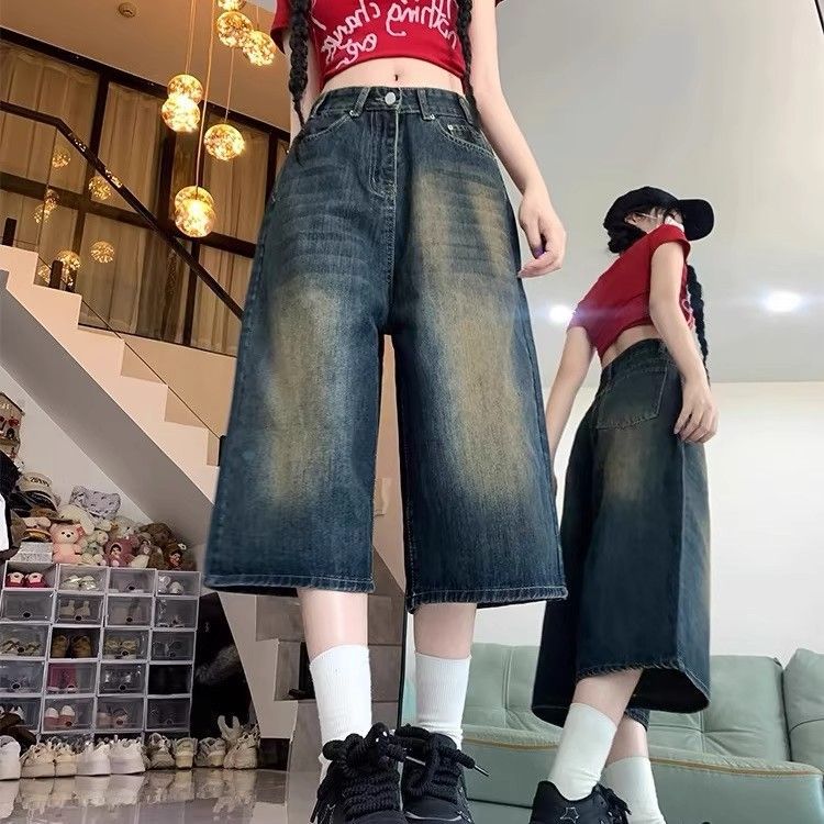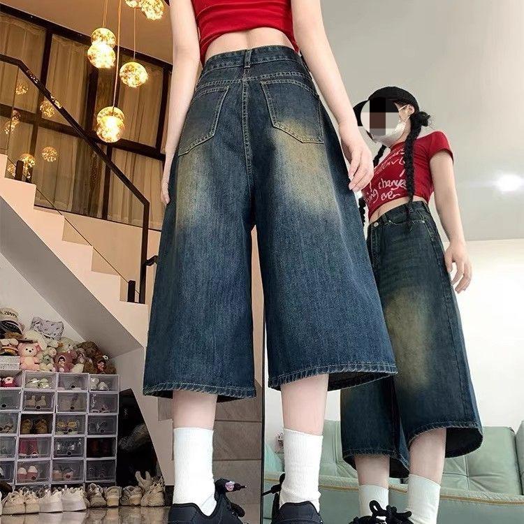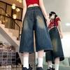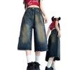 Shorts de mezclilla cropped de pierna ancha American Retro High Street 2025 Verano Nuevo Talla Grande Adelgazantes Petite