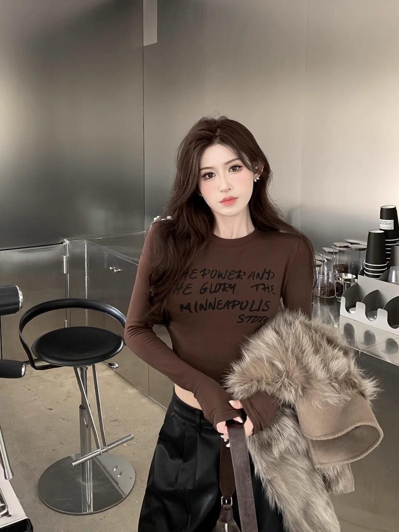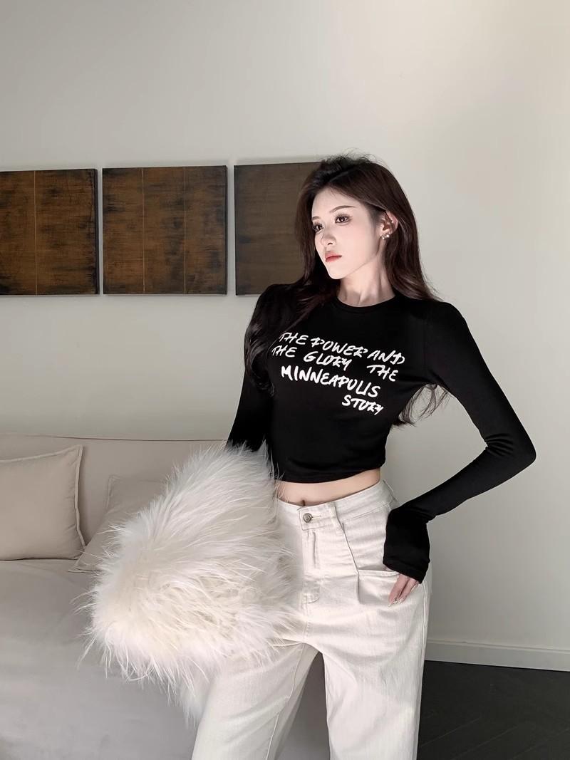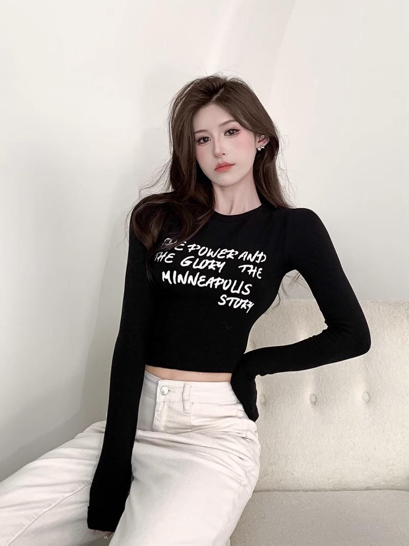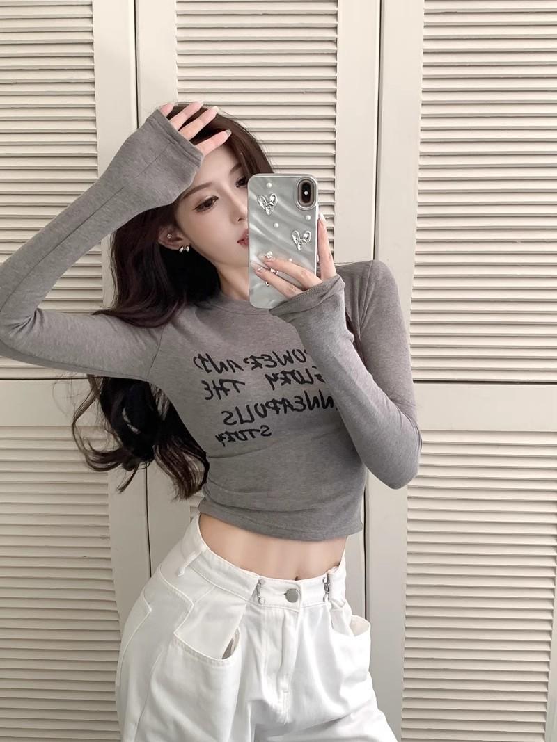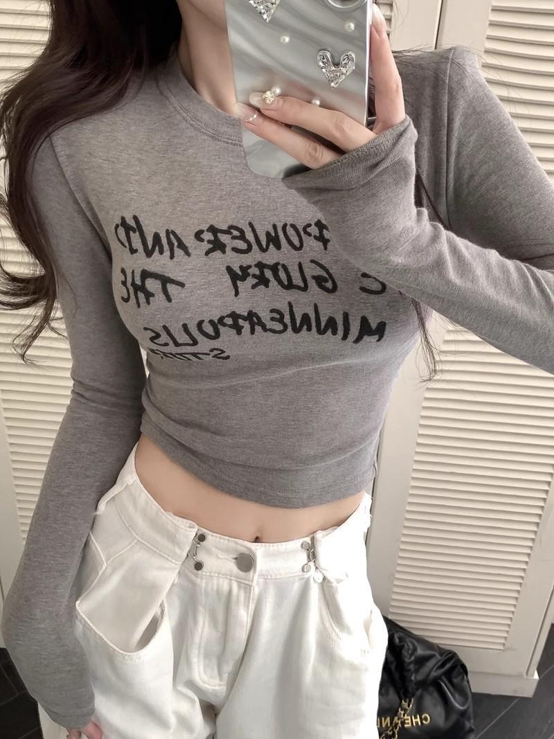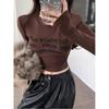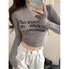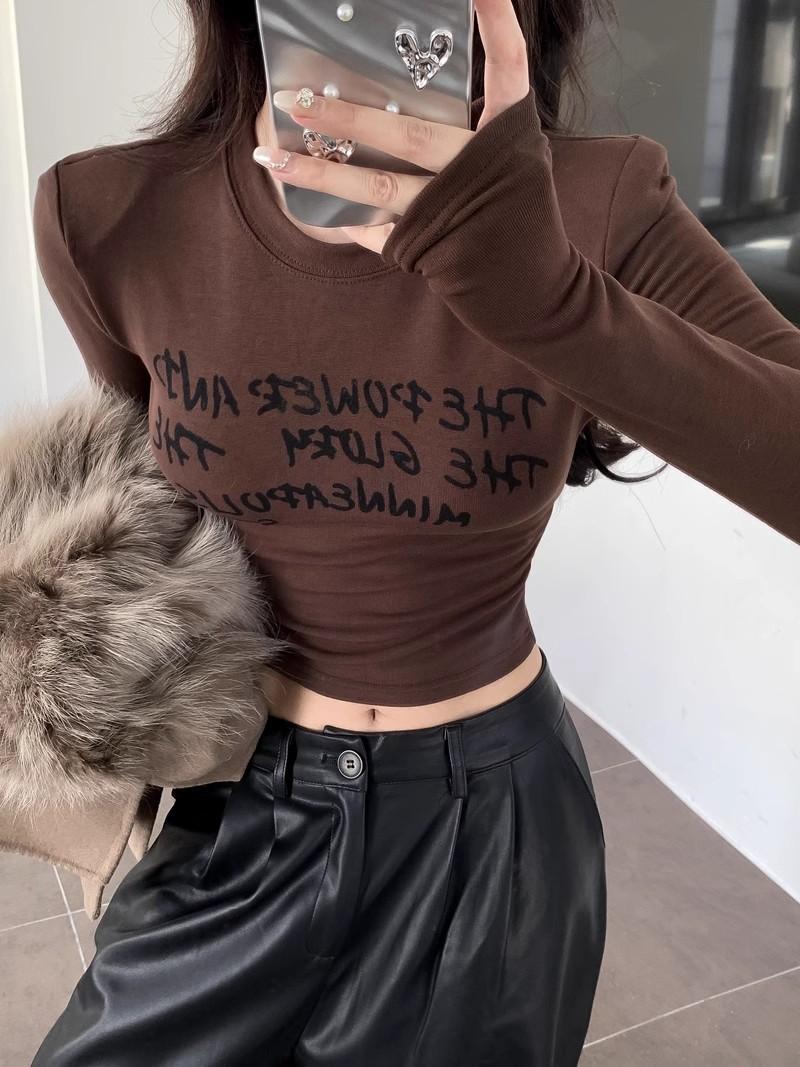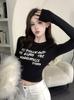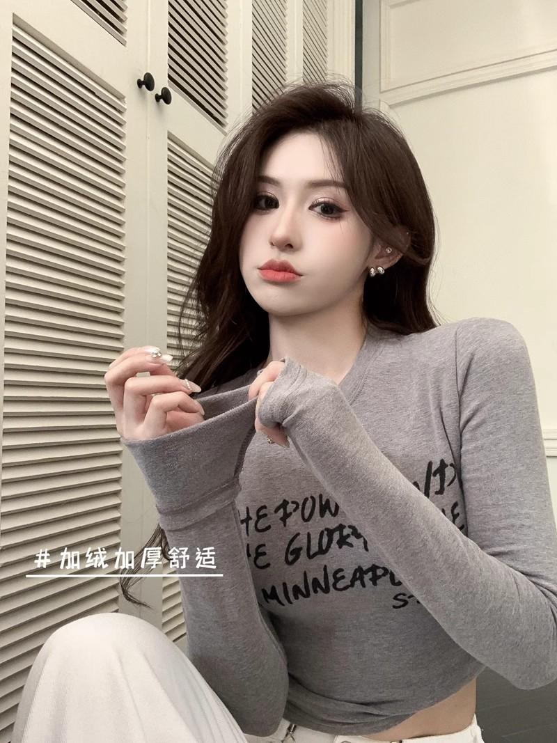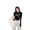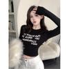 Camiseta de manga larga con estampado de letras cortas para mujer, de otoño e invierno, ajustada, con forro polar, interior negro