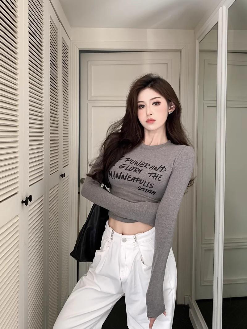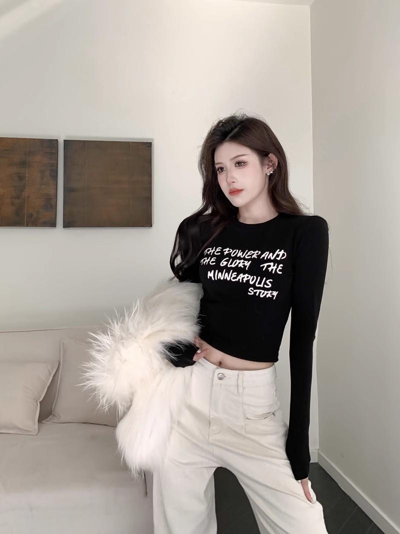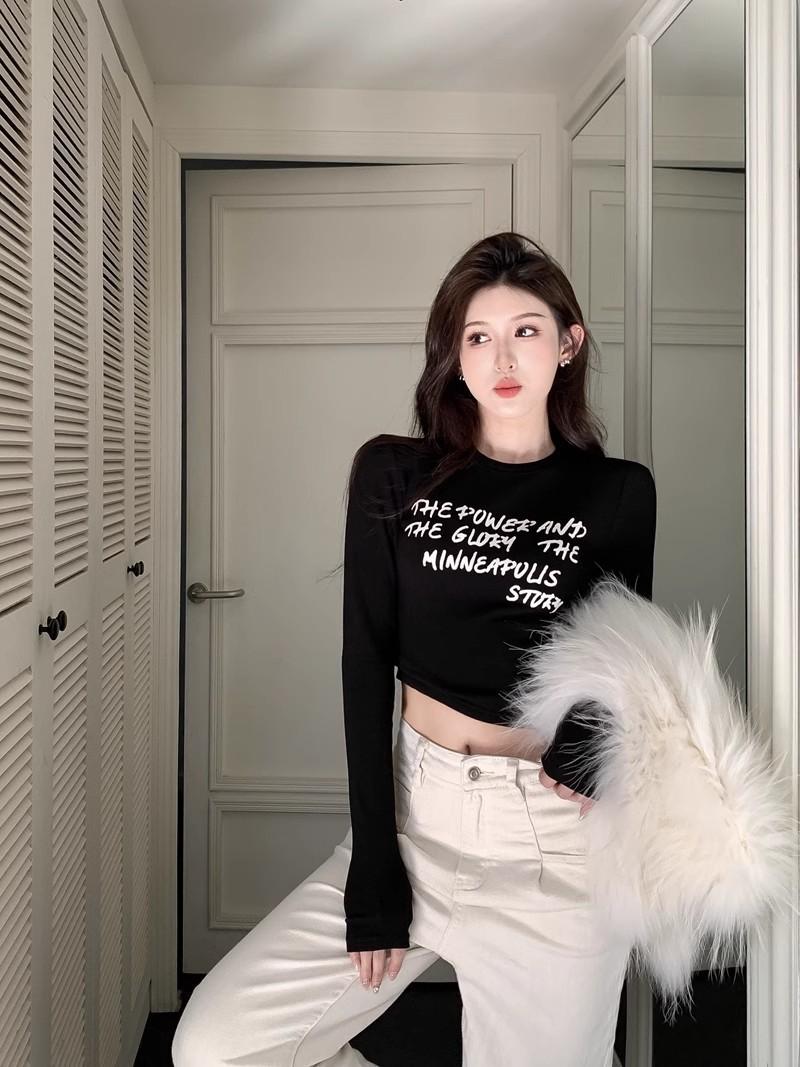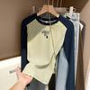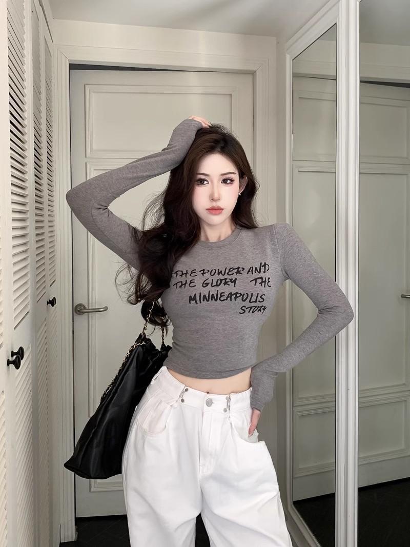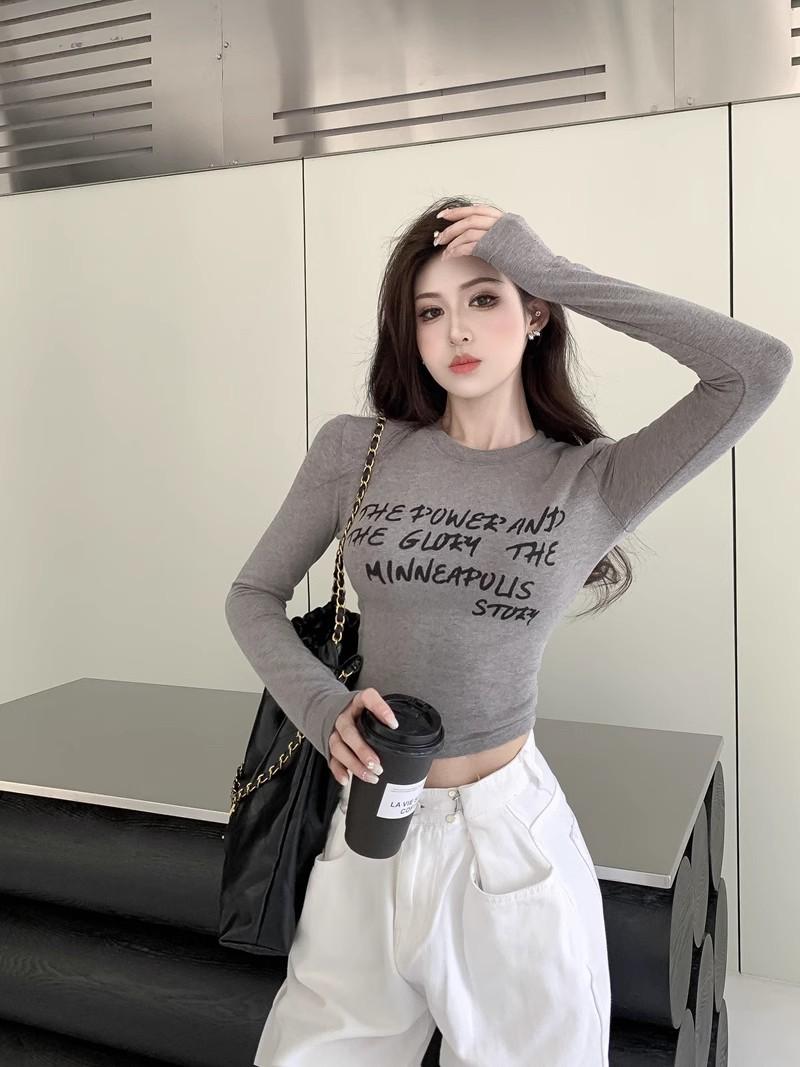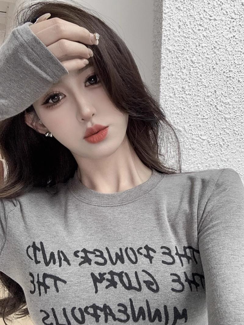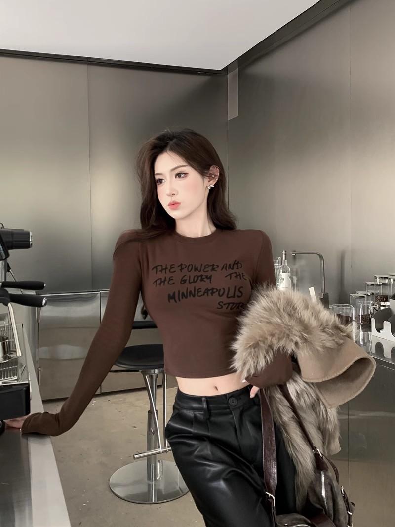 Camiseta de manga larga con estampado de letras cortas para mujer, de otoño e invierno, ajustada, con forro polar, interior negro