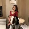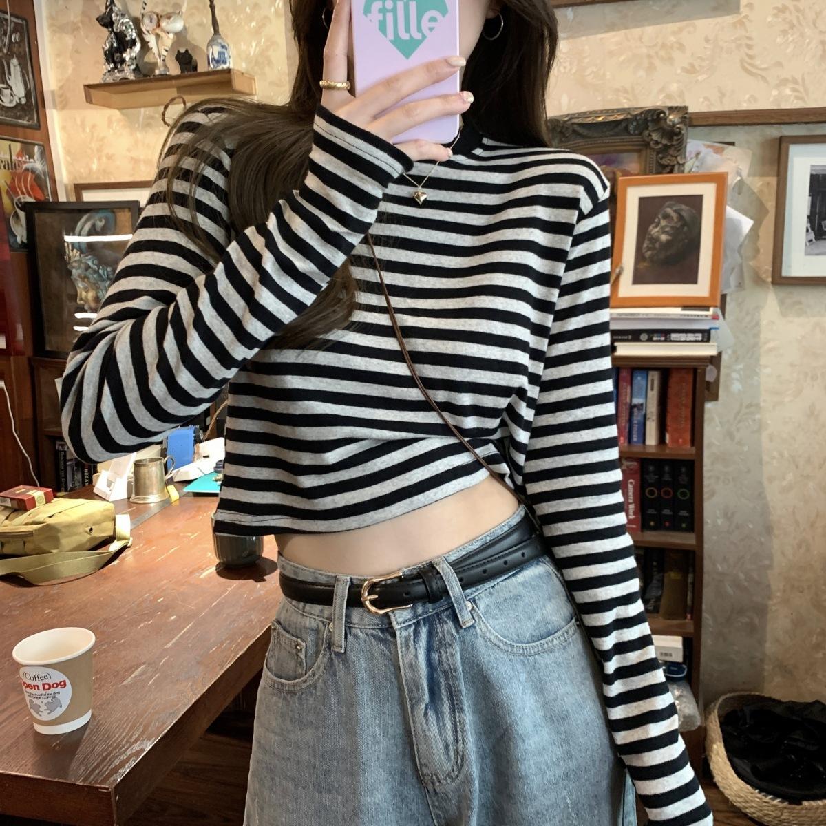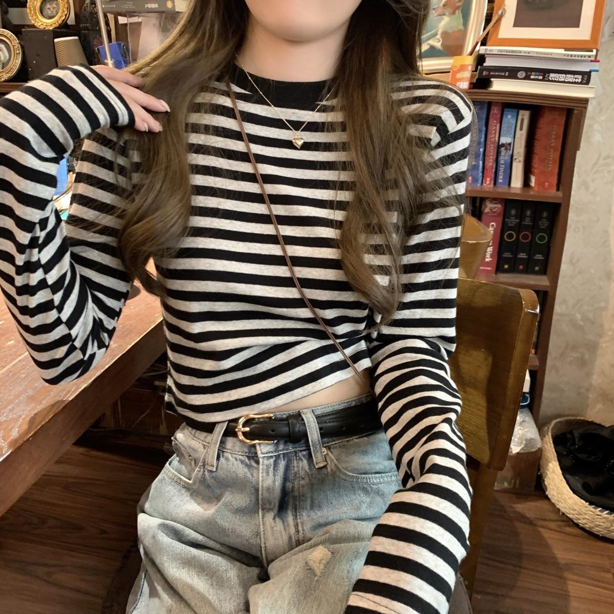 Playera de Manga Larga a Rayas de Color Contrastante para Mujer 2025 Primavera y Otoño Nueva Casual Adelgazante Interior Camiseta Base Corta Top de Estudiante