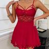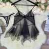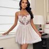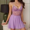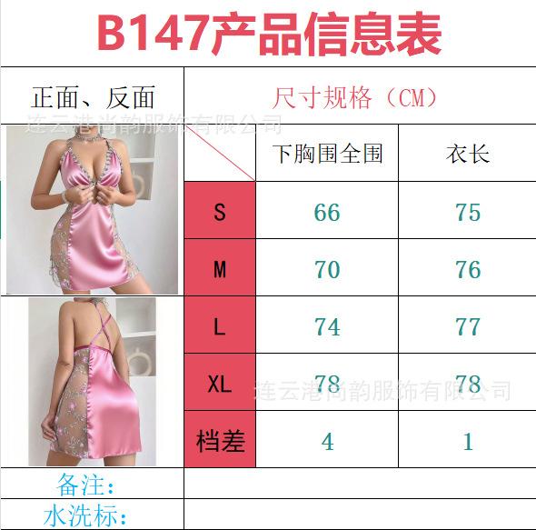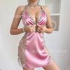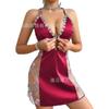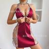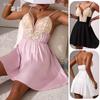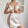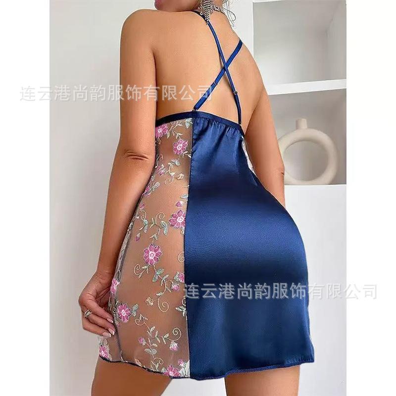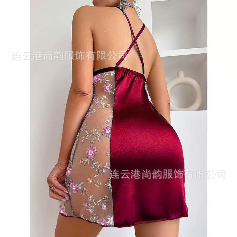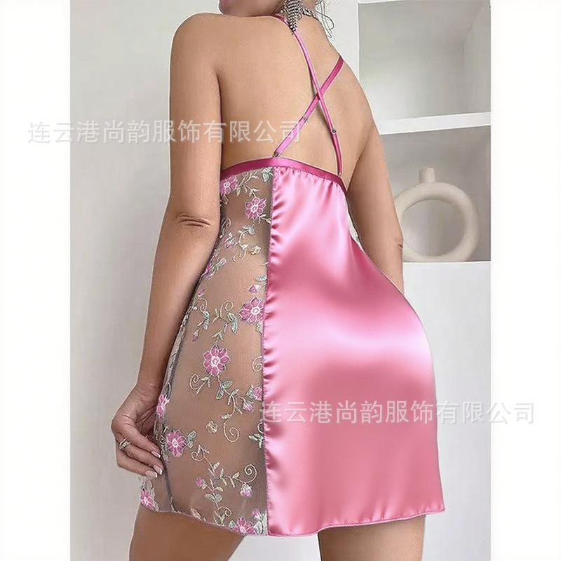 Nuevo camisón sexy de satén europeo y americano transfronterizo con bordado de tirantes y escote en V profundo, encaje transparente, pijama sexy para mujer