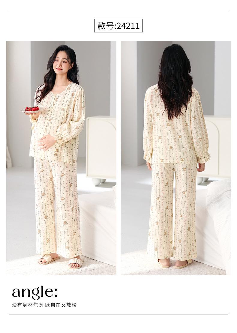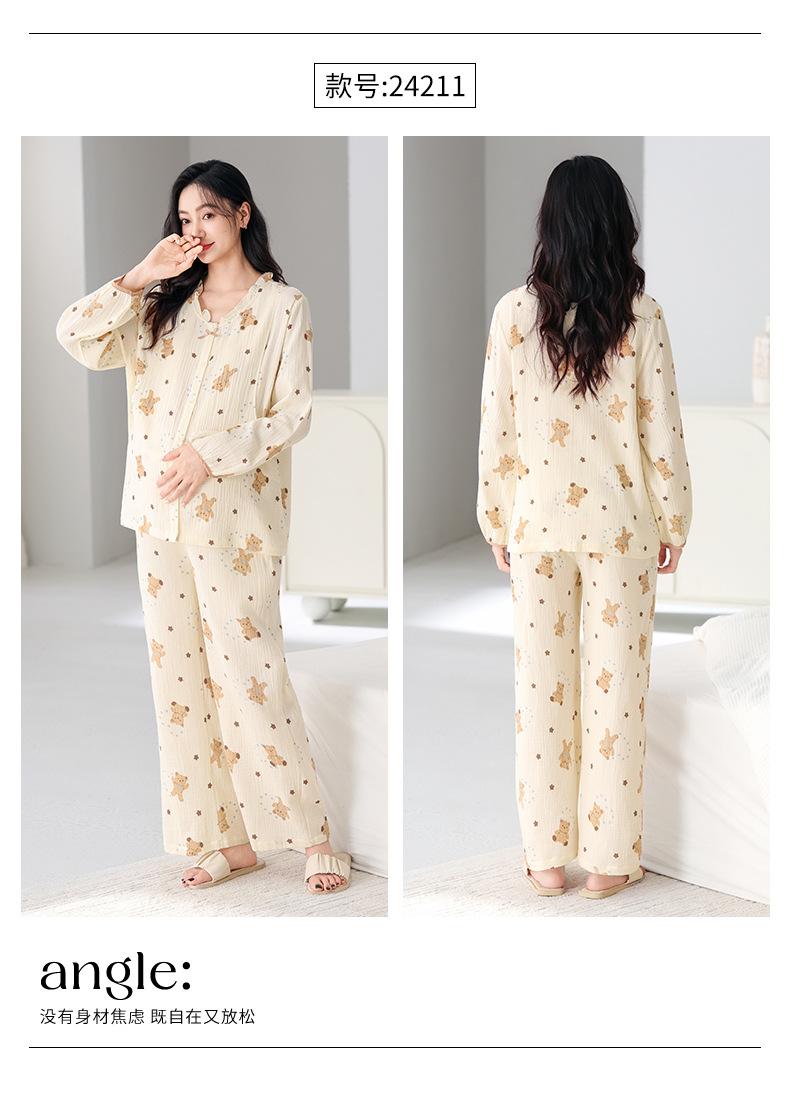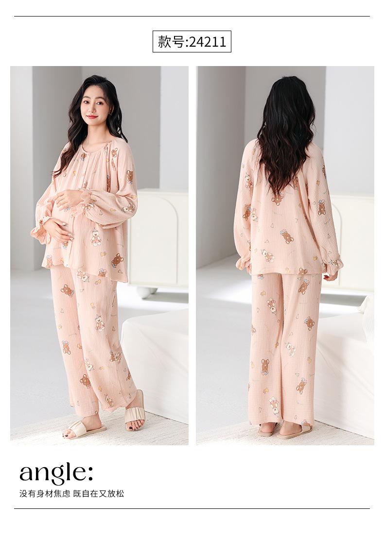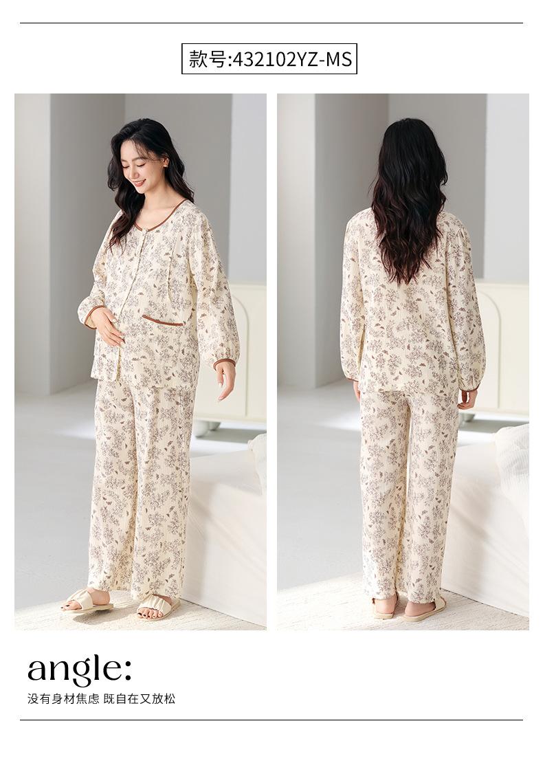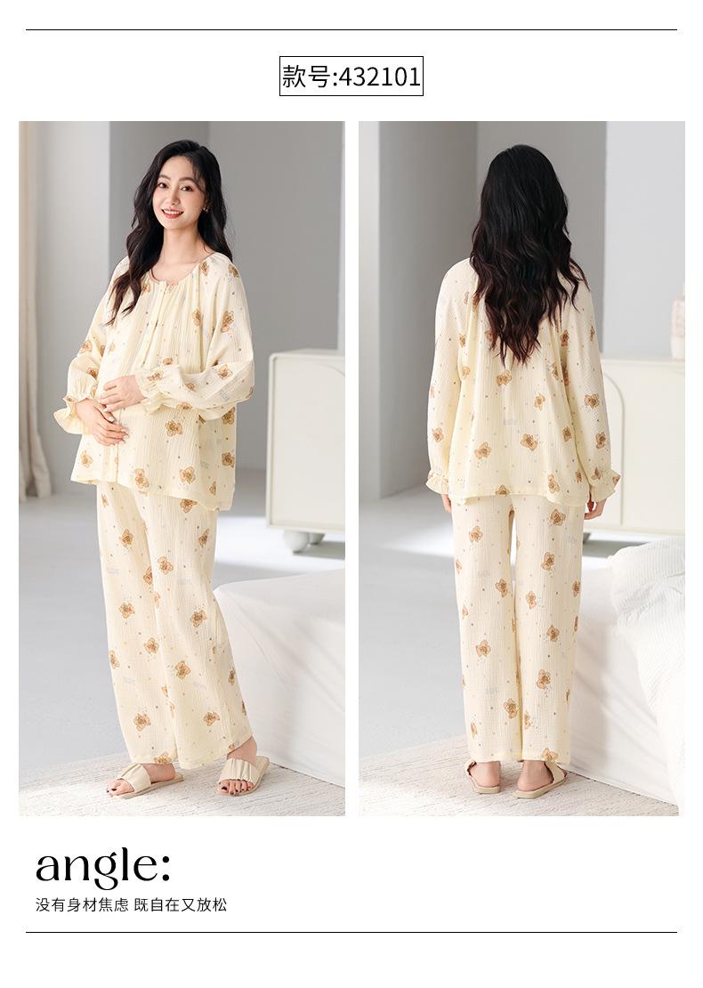 Pijama de Lactancia de Nuevo Estilo de Primavera y Otoño para Mujeres Embarazadas Algodón Gasa Ropa de Lactancia Postparto Manga Larga Pantalón Largo Cuello Redondo Conjunto de Ropa para el Hogar