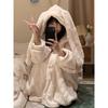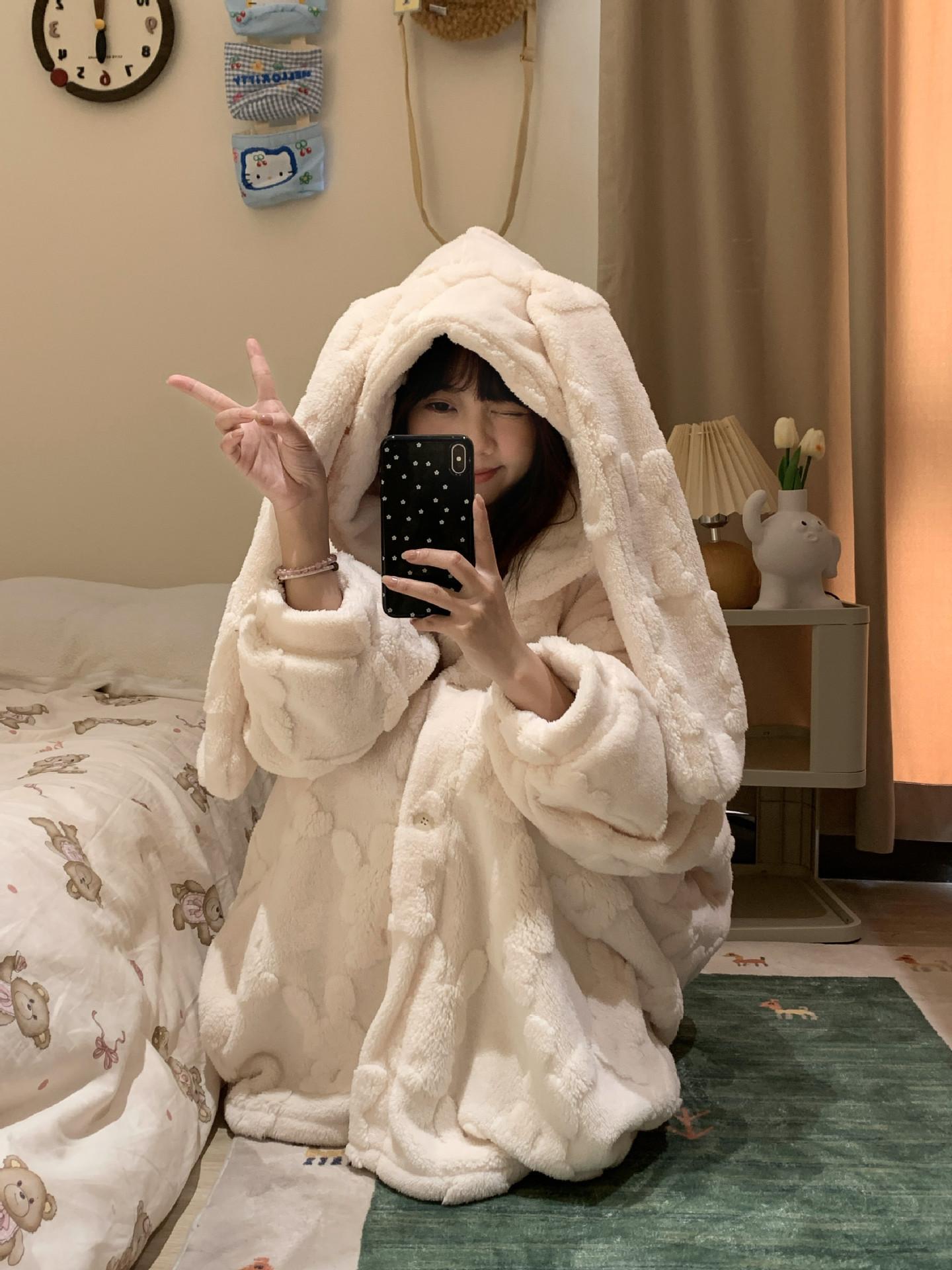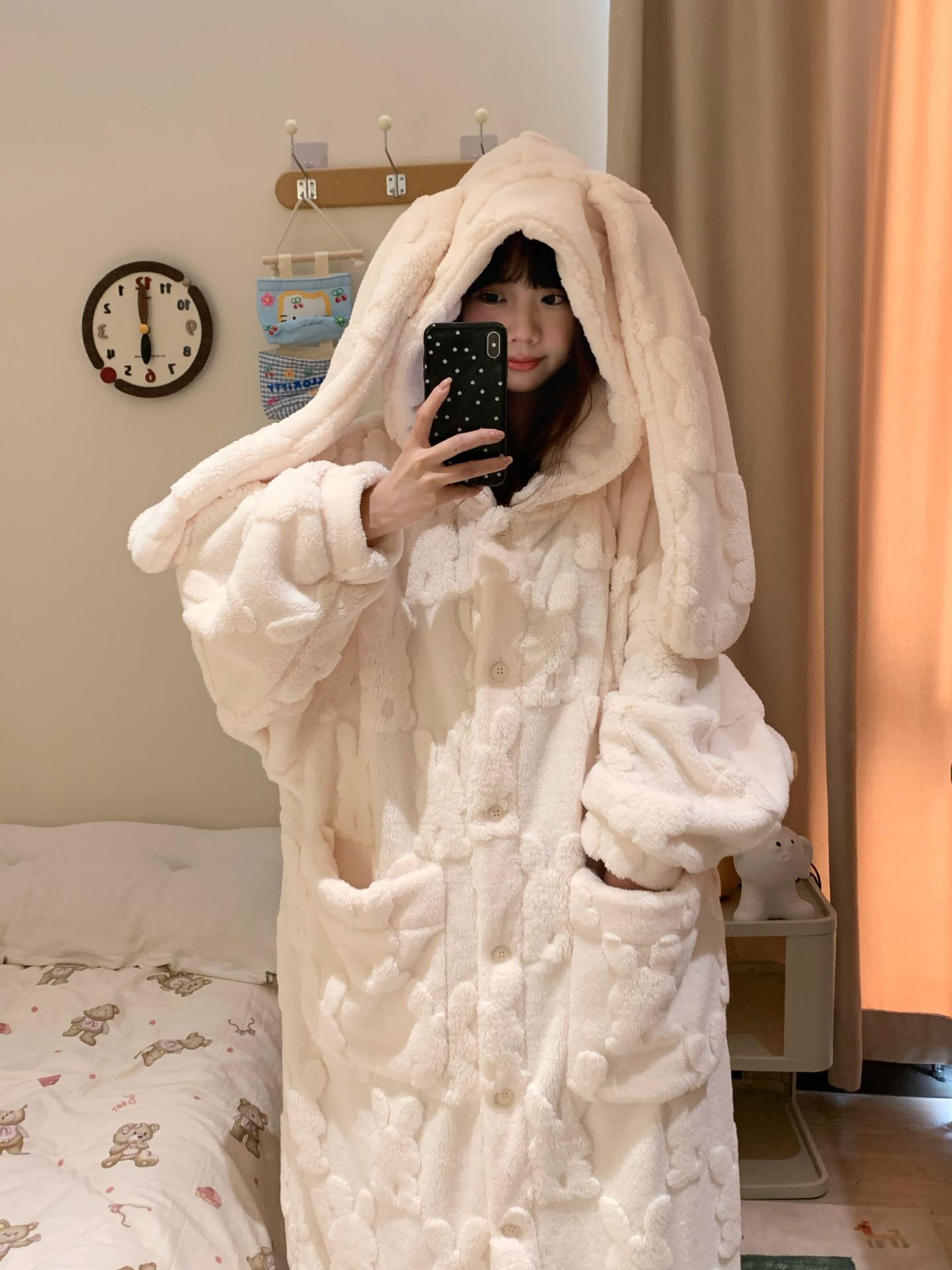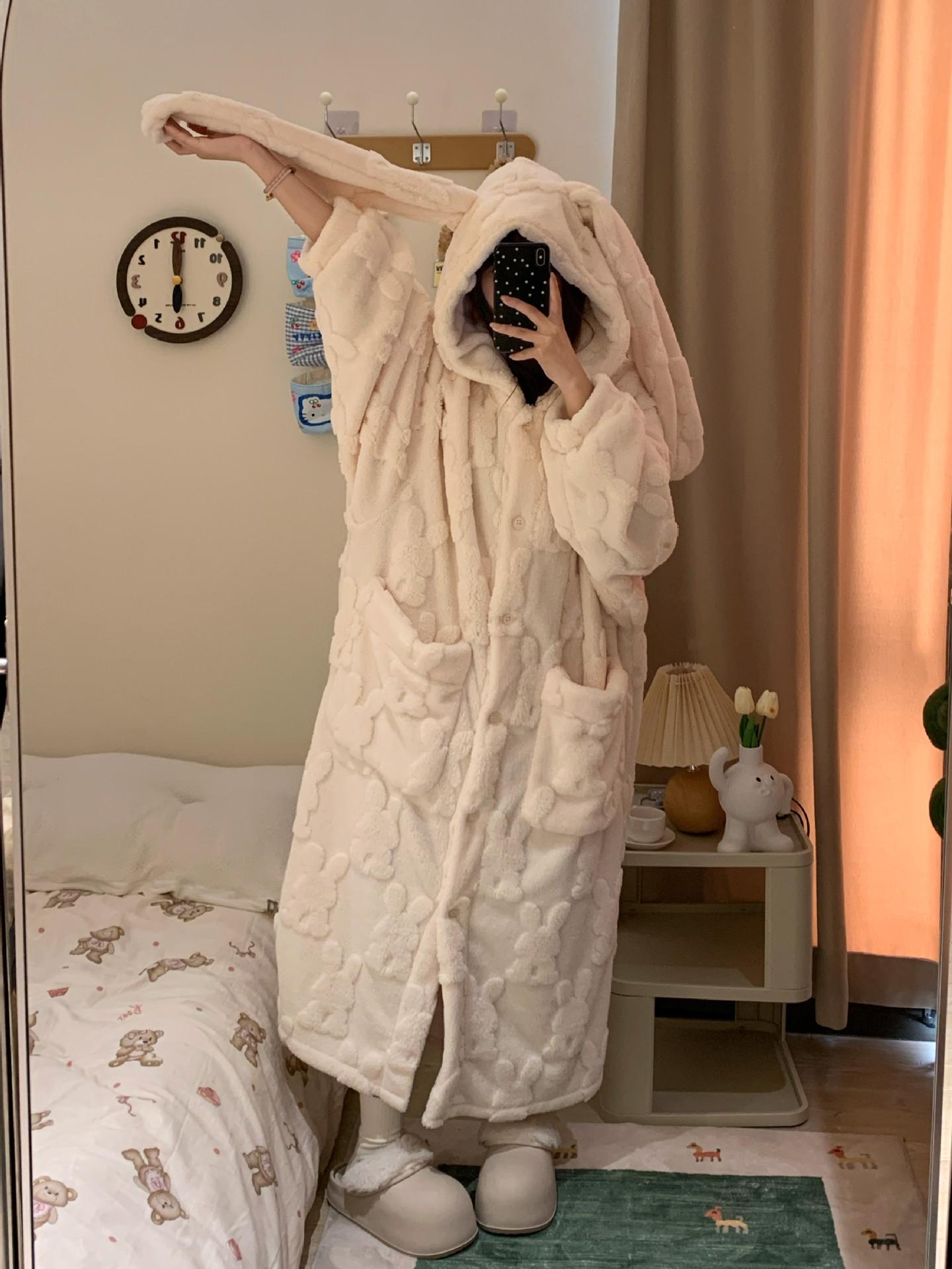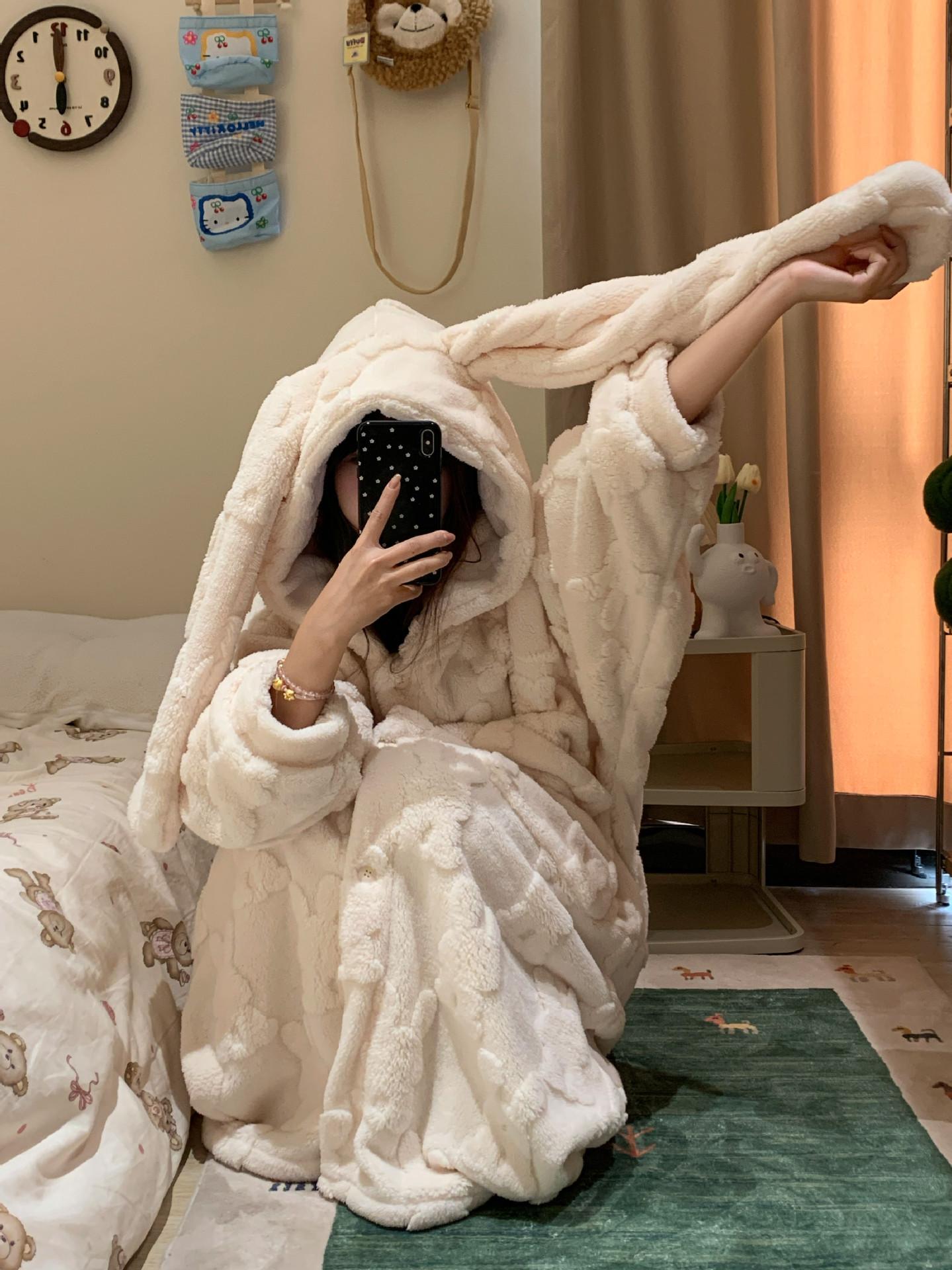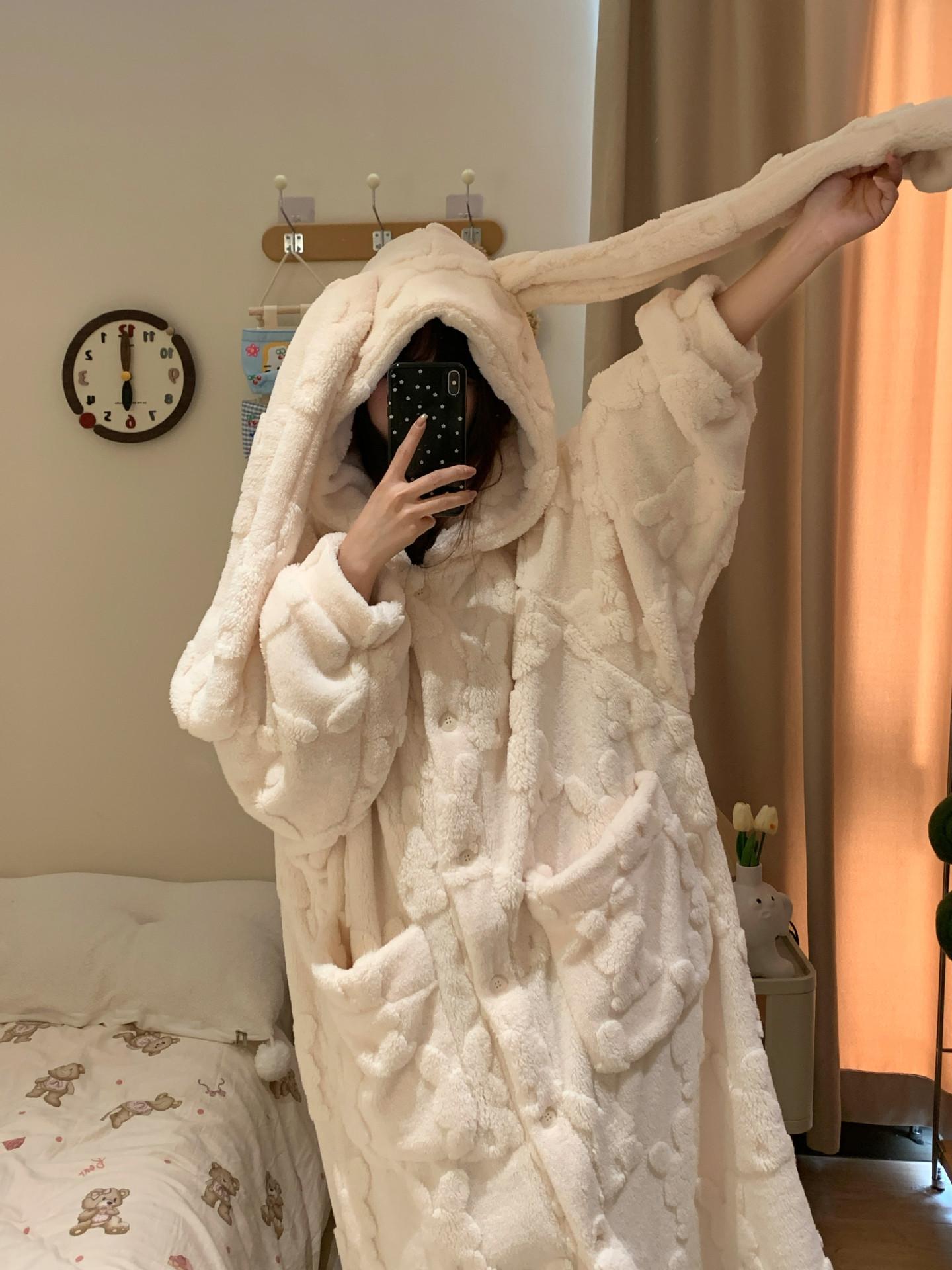Pijama Suave Cera Lindo Conejo con Capucha Franela Coral para Mujer Otoño e Invierno Nuevo Espesado con forro polar Ropa para el Hogar Camisón