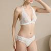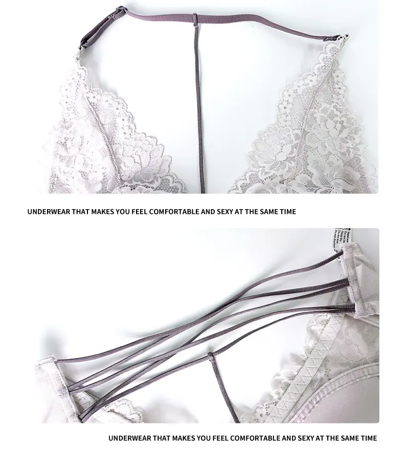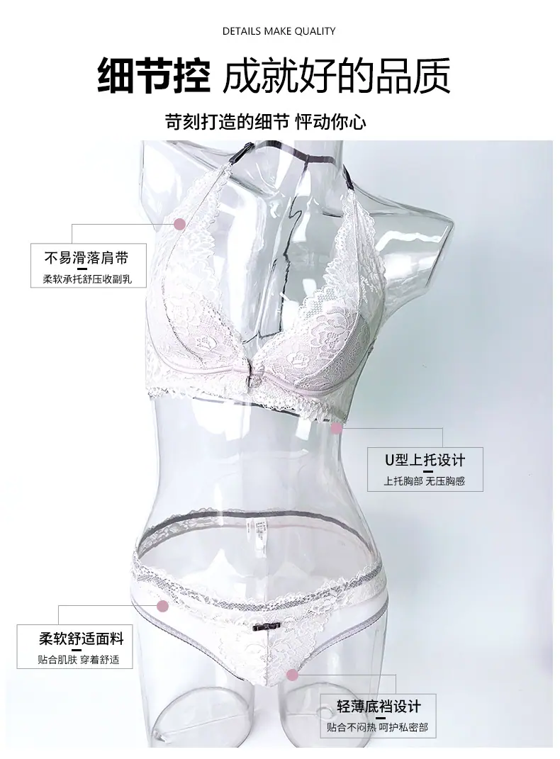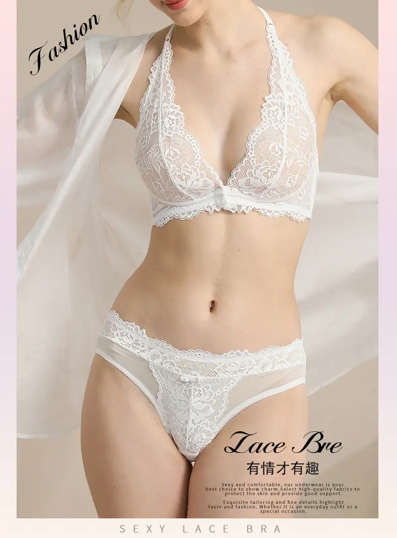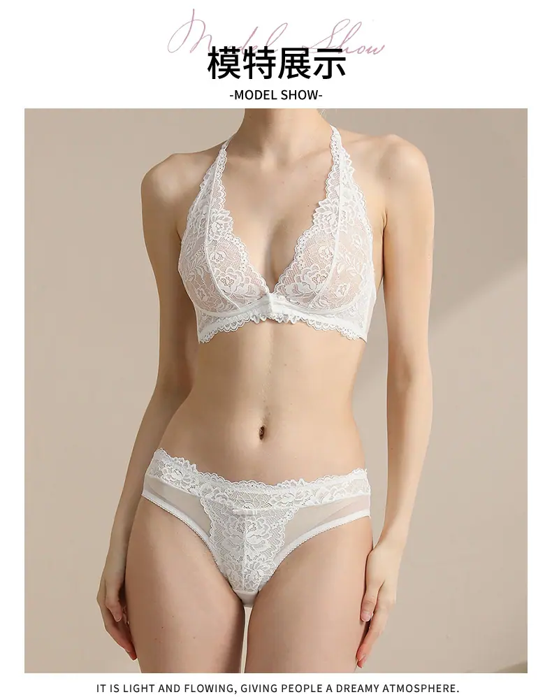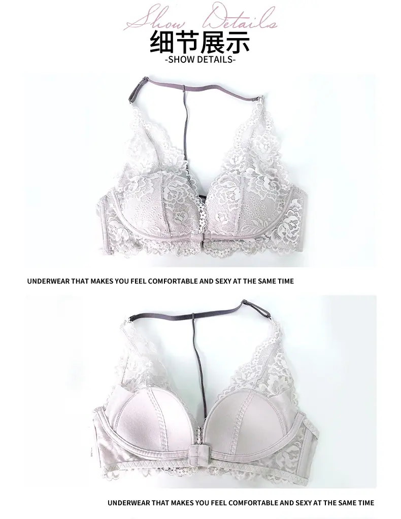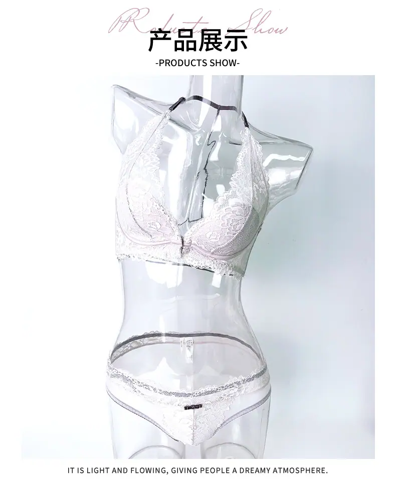 Lencería Francesa de Verano para Mujer Delgada Sin Aros Sexy Deseo Puro Encaje Sujetador Hebilla Delantera Halter Cuello Hermoso Conjunto de Lencería de Espalda